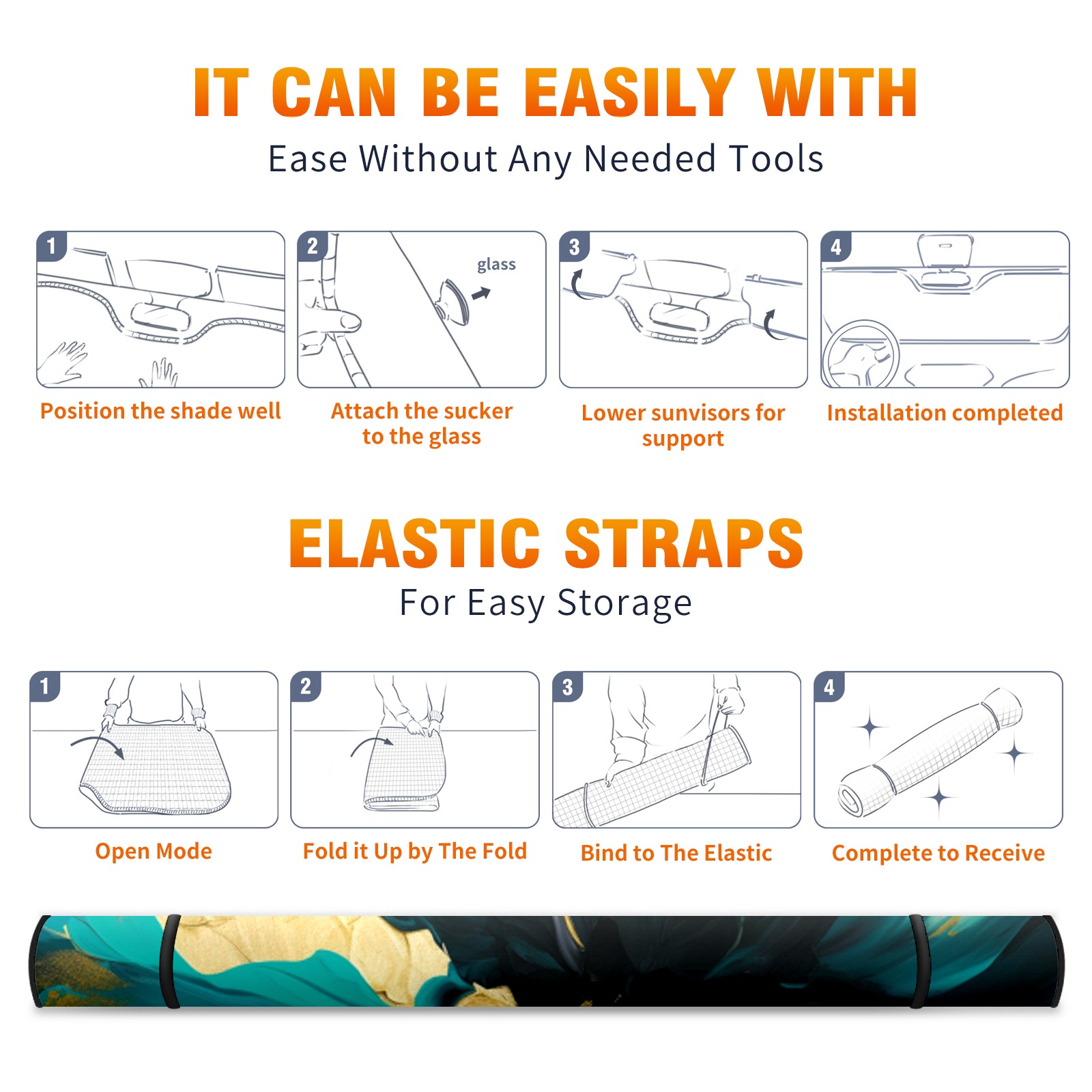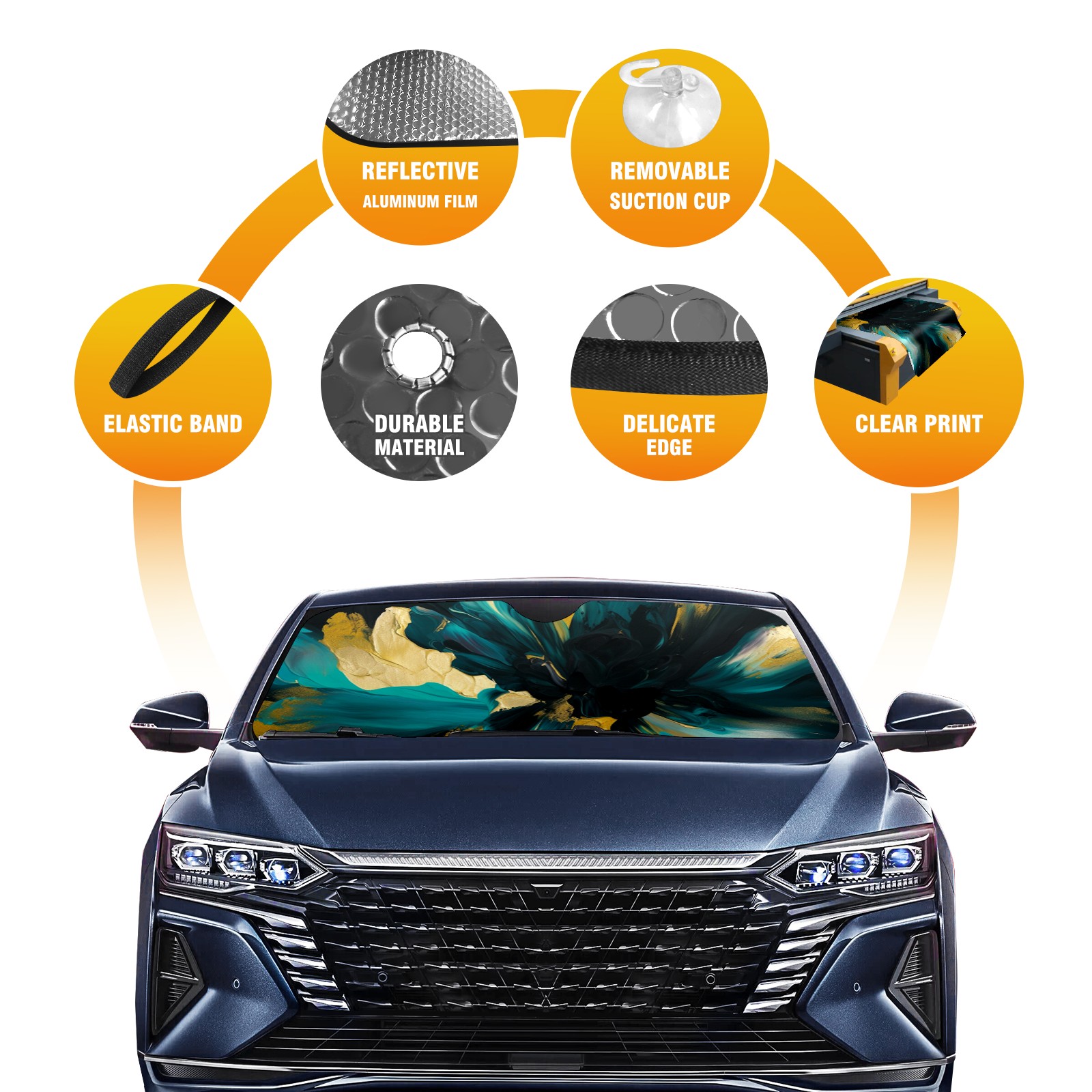 <b>ZXIVGOQFR Foldable Premium Car Windshield Sunshade is your great solution to reduce your car’s interior temperature dramatically! This is definitely a must-have item for your summer travel! </b> <br> ●<b>Size: 63"L x 33.5"W </b> <br></b> ●<b>Blocking Uv Rays & Heat Insulation<br></b> Our vehicle sunshade provides effective UV, sun, and summer heat protection .Maintains dashboards by preventing fading and cracking <br> ●<b>Easy-To-Store Folding Design Makes Storage Convenient <br></b> ZXIVGOQFR car sunshades come with removable suction cups and elastic bands that you can install easily and quickly, and the removable suction cups will not leave any marks on your windows when removed. Within seconds, windshield visor can be installed and removed. When not in use,the front windshield can be easily and effectively placed on the door pocket or the dashboard, which is beautiful and does not take up space in the car.<br> <br> <b>PUT UP A 'PROTECTIVE UMBRELLA' FOR YOUR BELOVED CAR!</b>