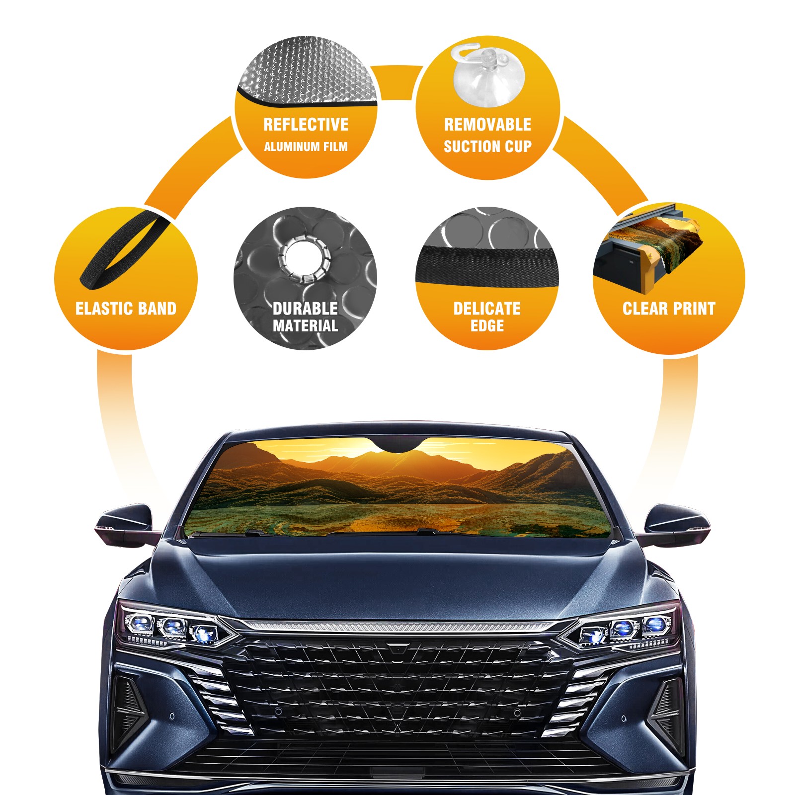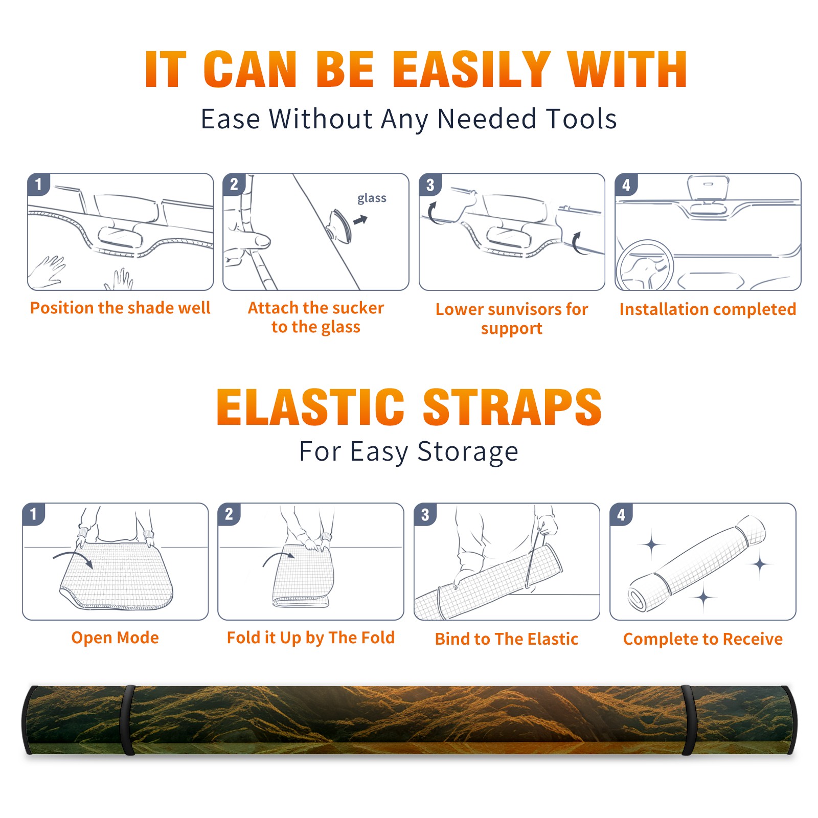 <b>ZXIVGOQFR Foldable Premium Car Windshield Sunshade is your great solution to reduce your car’s interior temperature dramatically! This is definitely a must-have item for your summer travel! </b> <br> ●<b>Size: 63"L x 33.5"W </b> <br></b> ●<b>Blocking Uv Rays & Heat Insulation<br></b> Our vehicle sunshade provides effective UV, sun, and summer heat protection .Maintains dashboards by preventing fading and cracking <br> ●<b>Easy-To-Store Folding Design Makes Storage Convenient <br></b> ZXIVGOQFR car sunshades come with removable suction cups and elastic bands that you can install easily and quickly, and the removable suction cups will not leave any marks on your windows when removed. Within seconds, windshield visor can be installed and removed. When not in use,the front windshield can be easily and effectively placed on the door pocket or the dashboard, which is beautiful and does not take up space in the car.<br> <br> <b>PUT UP A 'PROTECTIVE UMBRELLA' FOR YOUR BELOVED CAR!</b>