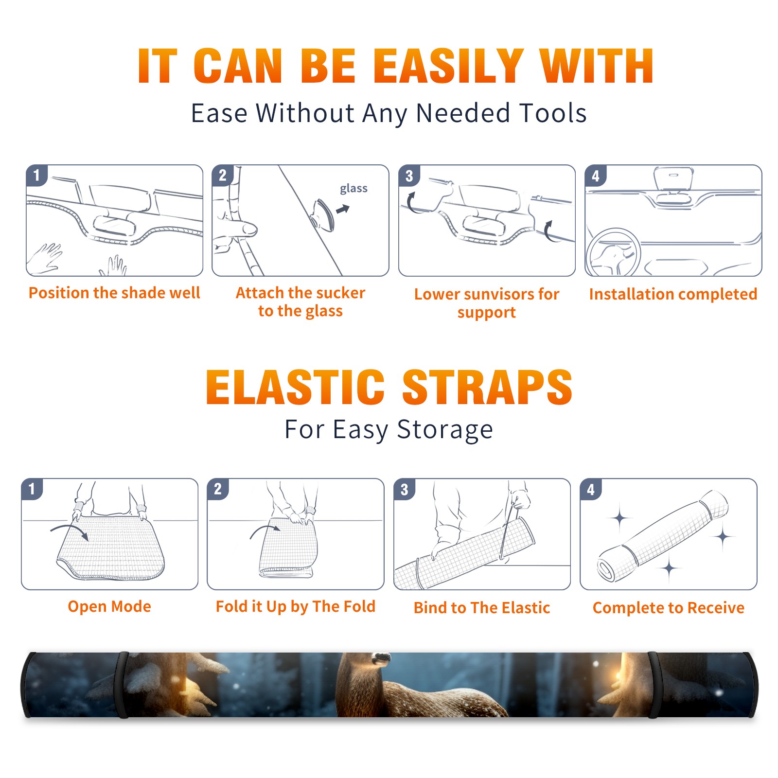 <b>ZXIVGOQFR Foldable Premium Car Windshield Sunshade is your great solution to reduce your car’s interior temperature dramatically! This is definitely a must-have item for your summer travel! </b> <br> ●<b>Size: 63"L x 33.5"W </b> <br></b> ●<b>Blocking Uv Rays & Heat Insulation<br></b> Our vehicle sunshade provides effective UV, sun, and summer heat protection .Maintains dashboards by preventing fading and cracking <br> ●<b>Easy-To-Store Folding Design Makes Storage Convenient <br></b> ZXIVGOQFR car sunshades come with removable suction cups and elastic bands that you can install easily and quickly, and the removable suction cups will not leave any marks on your windows when removed. Within seconds, windshield visor can be installed and removed. When not in use,the front windshield can be easily and effectively placed on the door pocket or the dashboard, which is beautiful and does not take up space in the car.<br> <br> <b>PUT UP A 'PROTECTIVE UMBRELLA' FOR YOUR BELOVED CAR!</b>