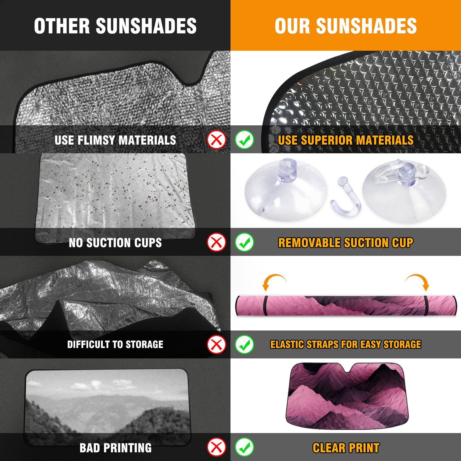 • <b>ZXIVGOQFR Foldable Premium Car Windshield Sunshade is your great solution to reduce your car’s interior temperature dramatically! This is definitely a must-have item for your summer travel! </b> <br> ●<b>Size: 63"L x 33.5"W </b> <br></b> ●<b>Blocking Uv Rays & Heat Insulation<br></b> Our vehicle sunshade provides effective UV, sun, and summer heat protection .Maintains dashboards by preventing fading and cracking <br> ●<b>Easy-To-Store Folding Design Makes Storage Convenient <br></b> ZXIVGOQFR car sunshades come with removable suction cups and elastic bands that you can install easily and quickly, and the removable suction cups will not leave any marks on your windows when removed. Within seconds, windshield visor can be installed and removed. When not in use,the front windshield can be easily and effectively placed on the door pocket or the dashboard, which is beautiful and does not take up space in the car.<br> <br> <b>PUT UP A 'PROTECTIVE UMBRELLA' FOR YOUR BELOVED CAR!</b>