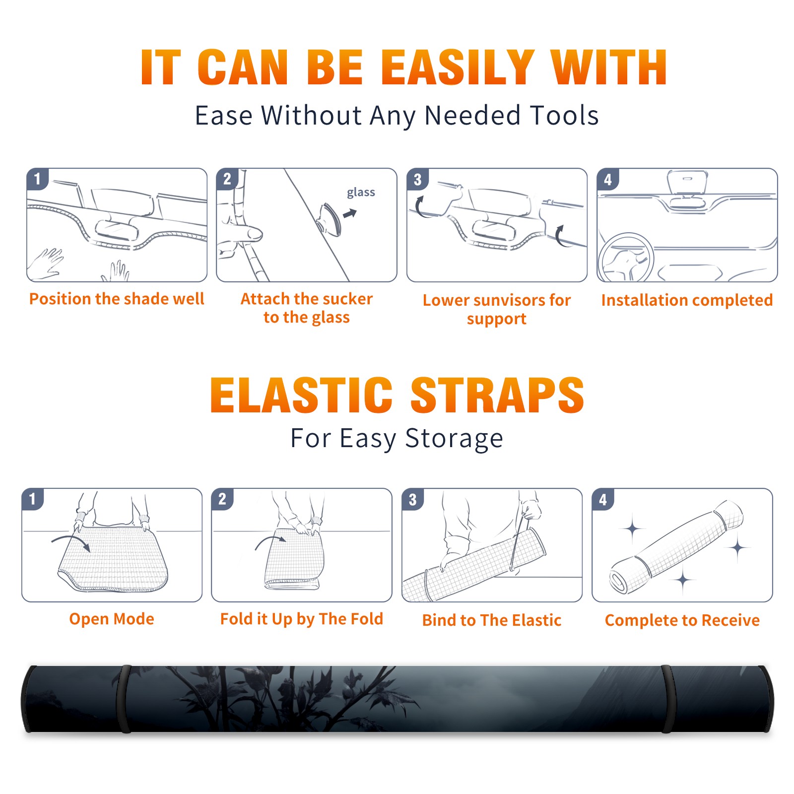 <b>ZXIVGOQFR Foldable Premium Car Windshield Sunshade is your great solution to reduce your car’s interior temperature dramatically! This is definitely a must-have item for your summer travel! </b> <br> ●<b>Size: 63"L x 33.5"W </b> <br></b> ●<b>Blocking Uv Rays & Heat Insulation<br></b> Our vehicle sunshade provides effective UV, sun, and summer heat protection .Maintains dashboards by preventing fading and cracking <br> ●<b>Easy-To-Store Folding Design Makes Storage Convenient <br></b> ZXIVGOQFR car sunshades come with removable suction cups and elastic bands that you can install easily and quickly, and the removable suction cups will not leave any marks on your windows when removed. Within seconds, windshield visor can be installed and removed. When not in use,the front windshield can be easily and effectively placed on the door pocket or the dashboard, which is beautiful and does not take up space in the car.<br> <br> <b>PUT UP A 'PROTECTIVE UMBRELLA' FOR YOUR BELOVED CAR!</b>