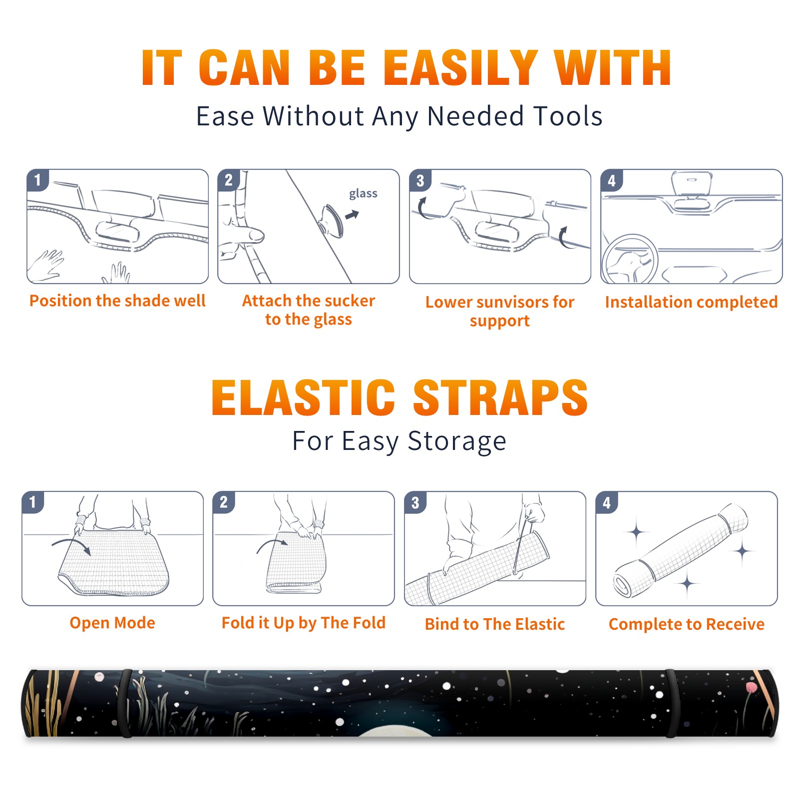• <b>ZXIVGOQFR Foldable Premium Car Windshield Sunshade is your great solution to reduce your car’s interior temperature dramatically! This is definitely a must-have item for your summer travel! </b> <br> ●<b>Size: 63"L x 33.5"W </b> <br></b> ●<b>Blocking Uv Rays & Heat Insulation<br></b> Our vehicle sunshade provides effective UV, sun, and summer heat protection .Maintains dashboards by preventing fading and cracking <br> ●<b>Easy-To-Store Folding Design Makes Storage Convenient <br></b> ZXIVGOQFR car sunshades come with removable suction cups and elastic bands that you can install easily and quickly, and the removable suction cups will not leave any marks on your windows when removed. Within seconds, windshield visor can be installed and removed. When not in use,the front windshield can be easily and effectively placed on the door pocket or the dashboard, which is beautiful and does not take up space in the car.<br> <br> <b>PUT UP A 'PROTECTIVE UMBRELLA' FOR YOUR BELOVED CAR!</b>