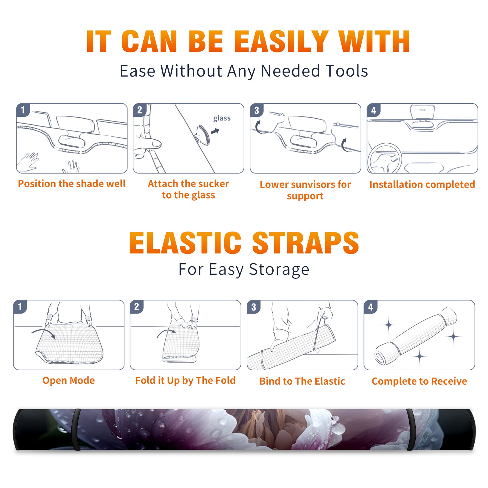 <b>ZXIVGOQFR Foldable Premium Car Windshield Sunshade is your great solution to reduce your car’s interior temperature dramatically! This is definitely a must-have item for your summer travel! </b> <br> ●<b>Size: 63"L x 33.5"W </b> <br></b> ●<b>Blocking Uv Rays & Heat Insulation<br></b> Our vehicle sunshade provides effective UV, sun, and summer heat protection .Maintains dashboards by preventing fading and cracking <br> ●<b>Easy-To-Store Folding Design Makes Storage Convenient <br></b> ZXIVGOQFR car sunshades come with removable suction cups and elastic bands that you can install easily and quickly, and the removable suction cups will not leave any marks on your windows when removed. Within seconds, windshield visor can be installed and removed. When not in use,the front windshield can be easily and effectively placed on the door pocket or the dashboard, which is beautiful and does not take up space in the car.<br> <br> <b>PUT UP A 'PROTECTIVE UMBRELLA' FOR YOUR BELOVED CAR!</b>