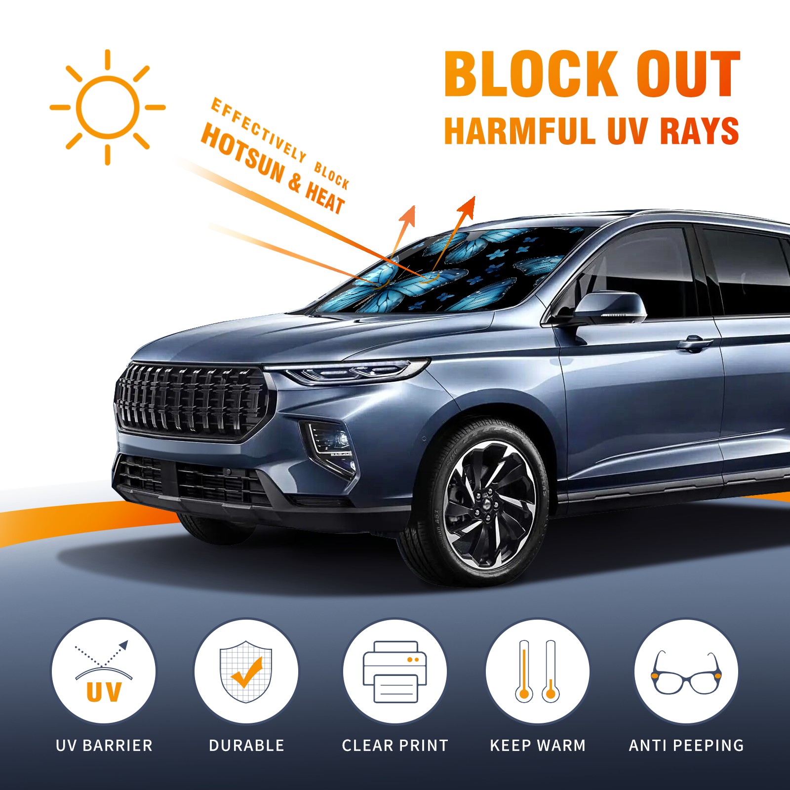 <b>ZXIVGOQFR Foldable Premium Car Windshield Sunshade is your great solution to reduce your car’s interior temperature dramatically! This is definitely a must-have item for your summer travel! </b> <br> ●<b>Size: 63"L x 33.5"W </b> <br></b> ●<b>Blocking Uv Rays & Heat Insulation<br></b> Our vehicle sunshade provides effective UV, sun, and summer heat protection .Maintains dashboards by preventing fading and cracking <br> ●<b>Easy-To-Store Folding Design Makes Storage Convenient <br></b> ZXIVGOQFR car sunshades come with removable suction cups and elastic bands that you can install easily and quickly, and the removable suction cups will not leave any marks on your windows when removed. Within seconds, windshield visor can be installed and removed. When not in use,the front windshield can be easily and effectively placed on the door pocket or the dashboard, which is beautiful and does not take up space in the car.<br> <br> <b>PUT UP A 'PROTECTIVE UMBRELLA' FOR YOUR BELOVED CAR!</b>
