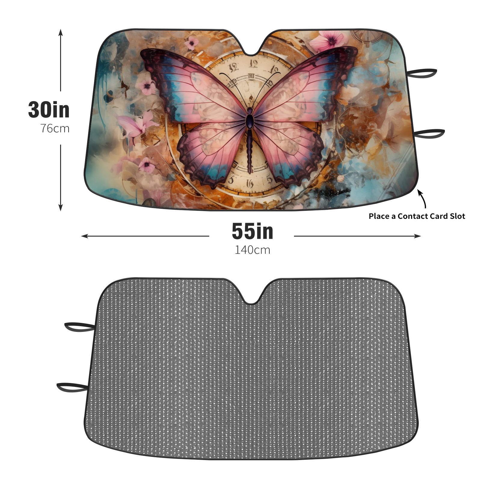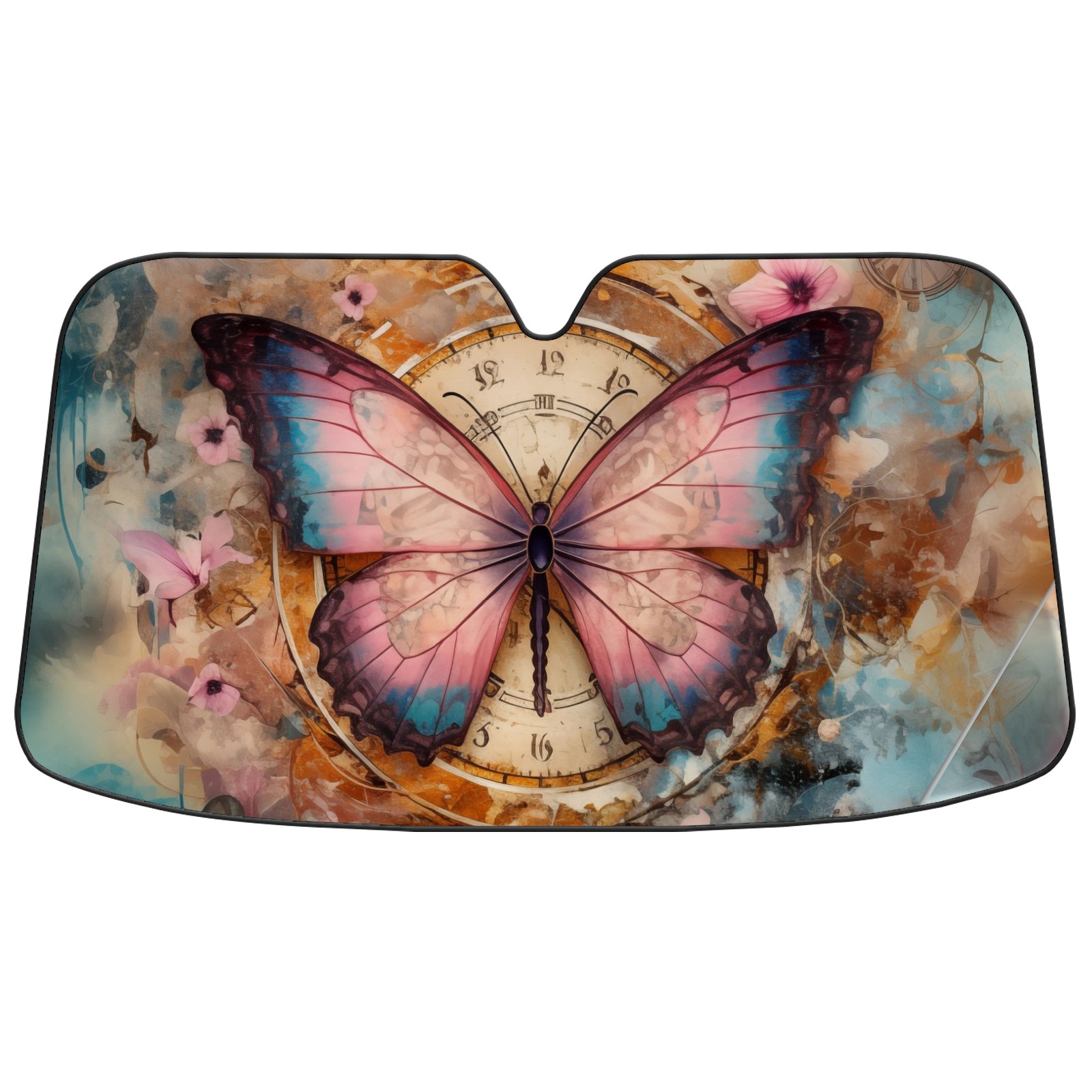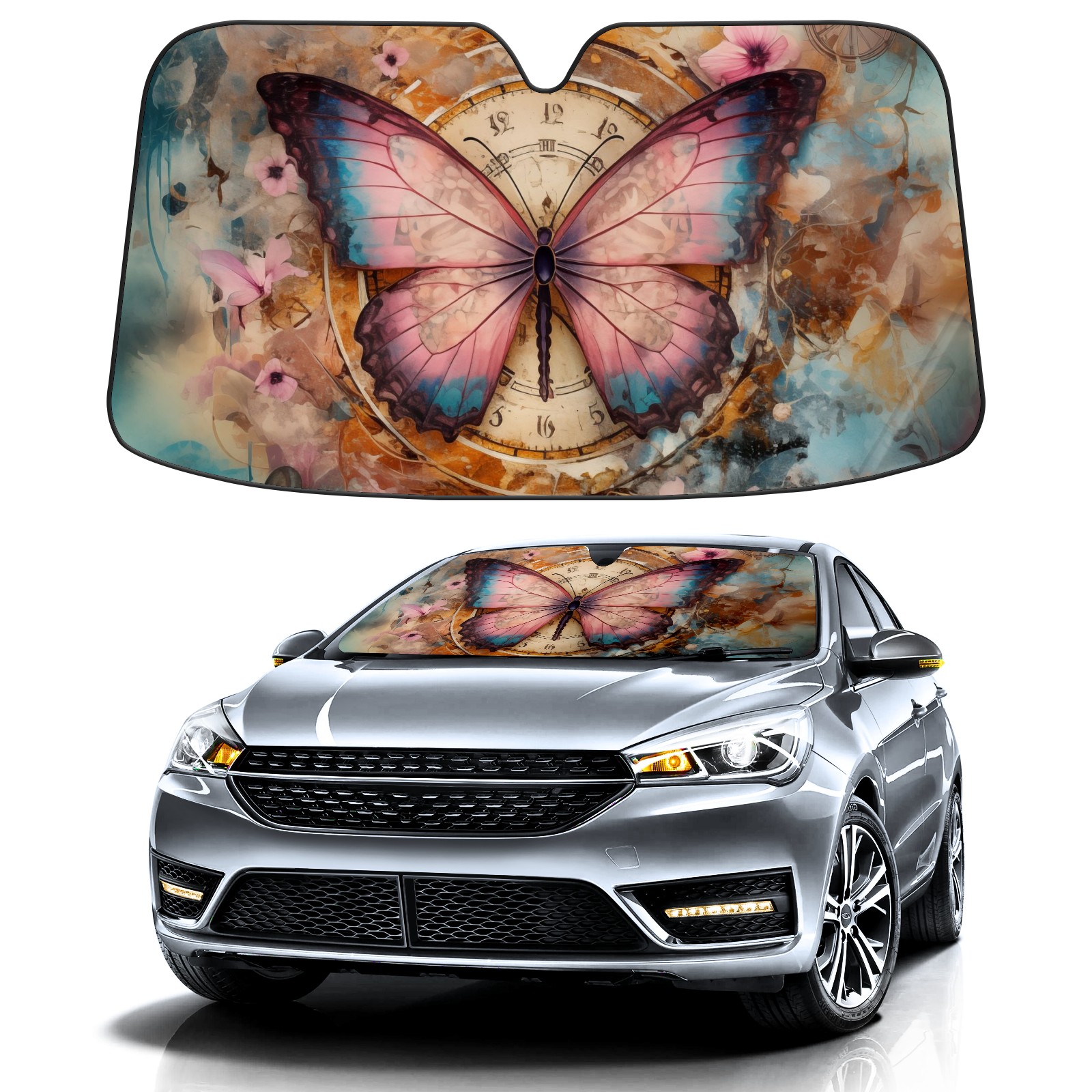 Car Windshield Sun Shade for Front Window Colorful Butterfly Clock Foldable Vehicle Windshield Car Sun Visor Covers Automotive Window Protector Car Privacy Sun Blocker