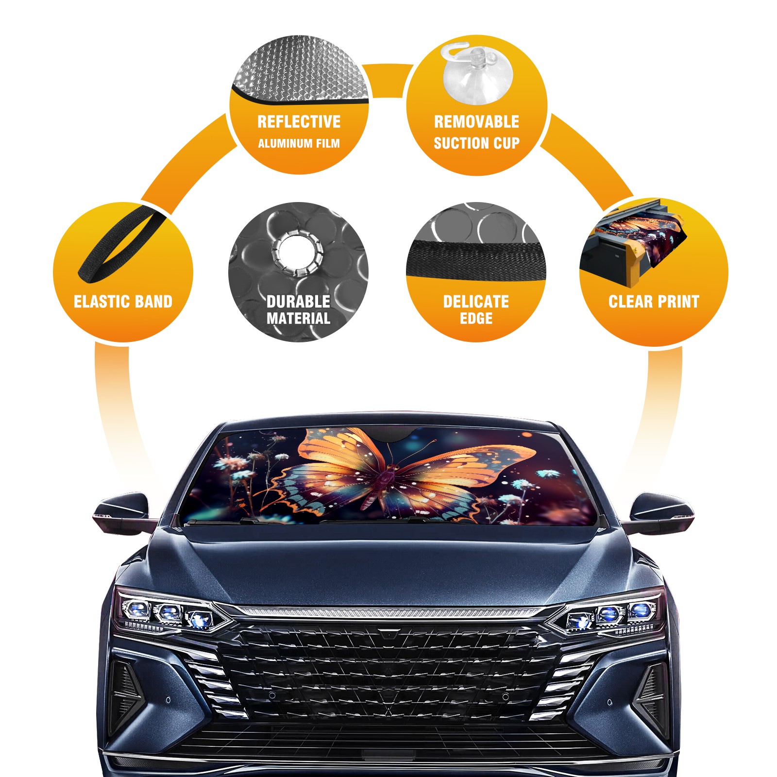 <b>ZXIVGOQFR Foldable Premium Car Windshield Sunshade is your great solution to reduce your car’s interior temperature dramatically! This is definitely a must-have item for your summer travel! </b> <br> ●<b>Size: 63"L x 33.5"W </b> <br></b> ●<b>Blocking Uv Rays & Heat Insulation<br></b> Our vehicle sunshade provides effective UV, sun, and summer heat protection .Maintains dashboards by preventing fading and cracking <br> ●<b>Easy-To-Store Folding Design Makes Storage Convenient <br></b> ZXIVGOQFR car sunshades come with removable suction cups and elastic bands that you can install easily and quickly, and the removable suction cups will not leave any marks on your windows when removed. Within seconds, windshield visor can be installed and removed. When not in use,the front windshield can be easily and effectively placed on the door pocket or the dashboard, which is beautiful and does not take up space in the car.<br> <br> <b>PUT UP A 'PROTECTIVE UMBRELLA' FOR YOUR BELOVED CAR!</b>