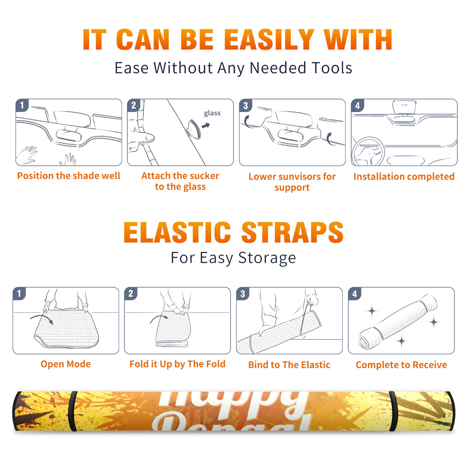 <b>ZXIVGOQFR Foldable Premium Car Windshield Sunshade is your great solution to reduce your car’s interior temperature dramatically! This is definitely a must-have item for your summer travel! </b> <br> ●<b>Size: 63"L x 33.5"W </b> <br></b> ●<b>Blocking Uv Rays & Heat Insulation<br></b> Our vehicle sunshade provides effective UV, sun, and summer heat protection .Maintains dashboards by preventing fading and cracking <br> ●<b>Easy-To-Store Folding Design Makes Storage Convenient <br></b> ZXIVGOQFR car sunshades come with removable suction cups and elastic bands that you can install easily and quickly, and the removable suction cups will not leave any marks on your windows when removed. Within seconds, windshield visor can be installed and removed. When not in use,the front windshield can be easily and effectively placed on the door pocket or the dashboard, which is beautiful and does not take up space in the car.<br> <br> <b>PUT UP A 'PROTECTIVE UMBRELLA' FOR YOUR BELOVED CAR!</b>