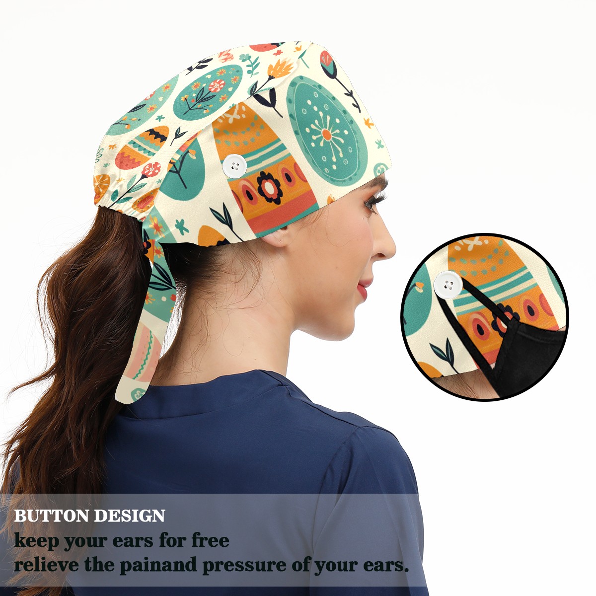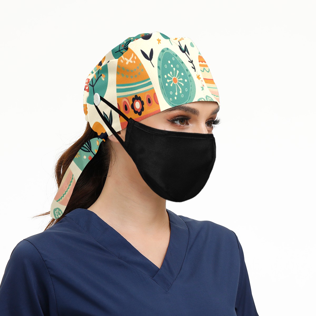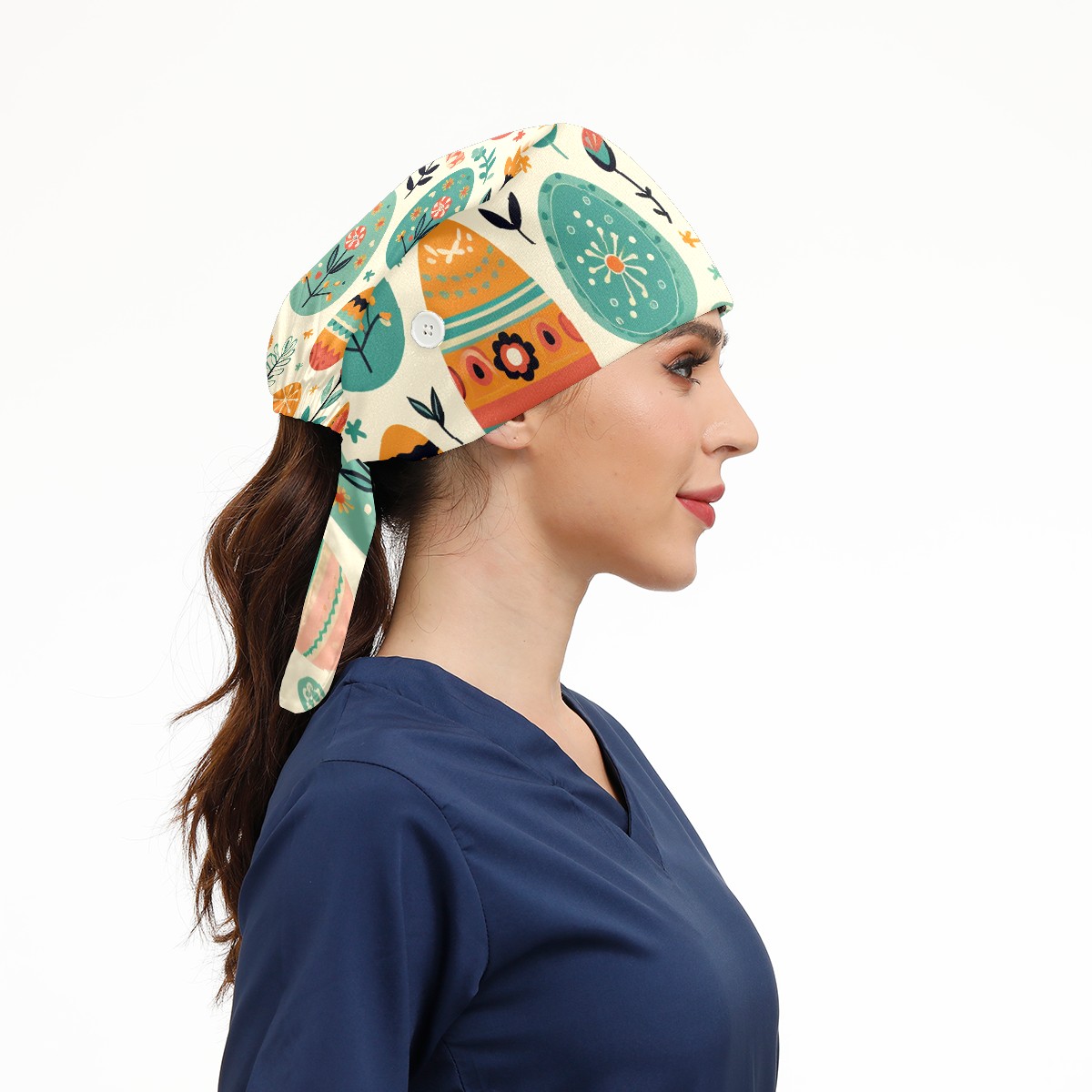 Working Caps with Button&Sweatband Satin Lined Cotton Adjustable Nurse Hats Elastic Band Scrub Cap Surgeon Hat Easter 78