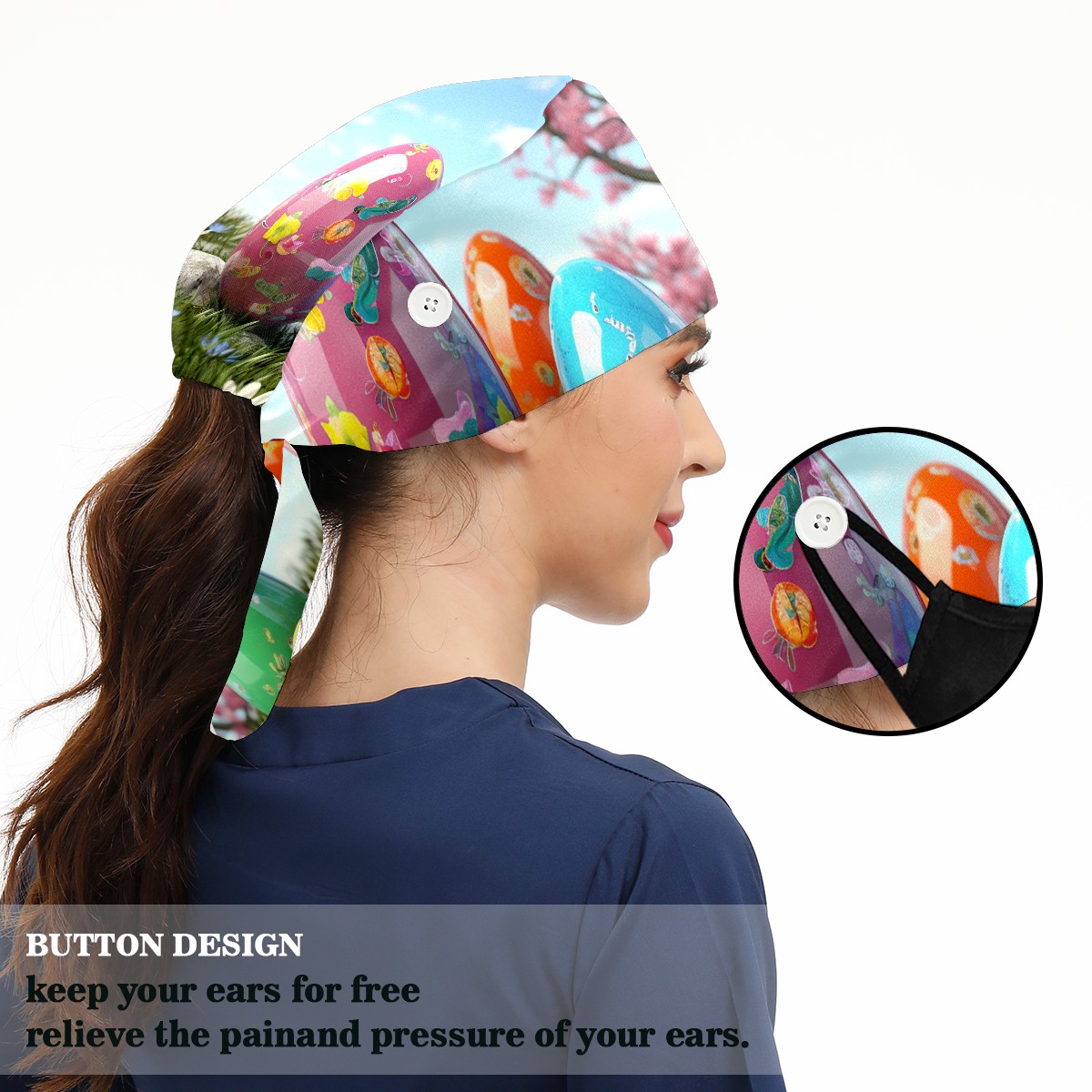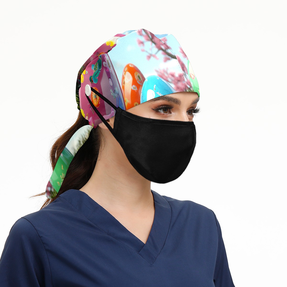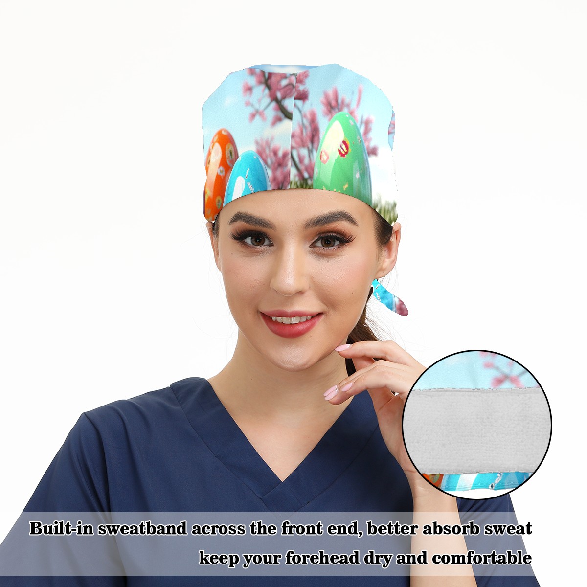Working Caps with Button&Sweatband Satin Lined Cotton Adjustable Nurse Hats Elastic Band Scrub Cap Surgeon Hat Easter (127)