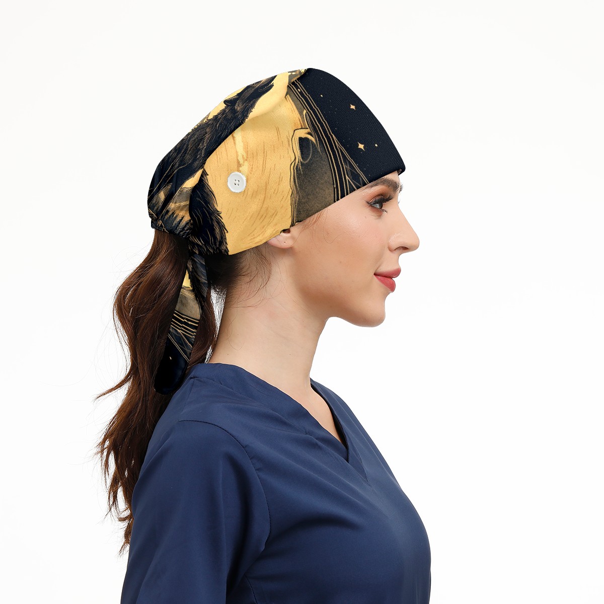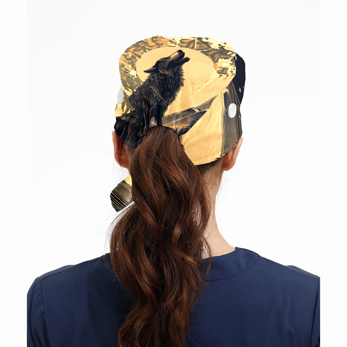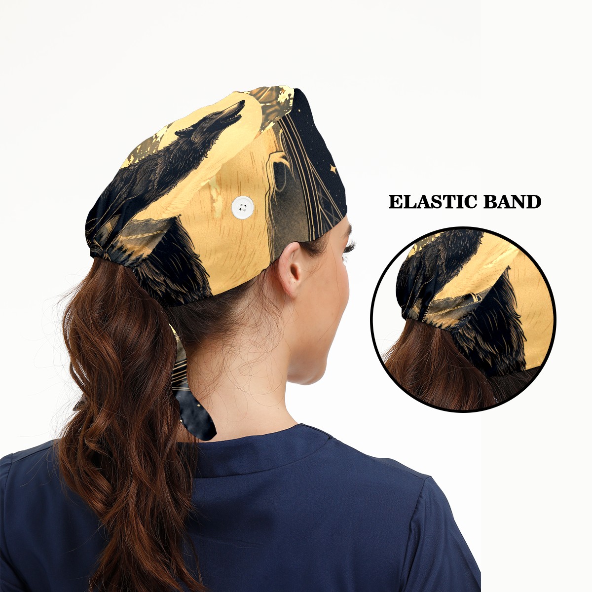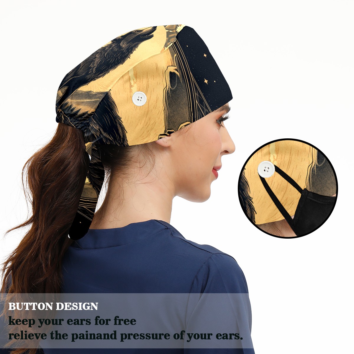 Working Caps with Button&Sweatband Satin Lined Cotton Adjustable Nurse Hats Elastic Band Scrub Cap Surgeon Hat Wolf