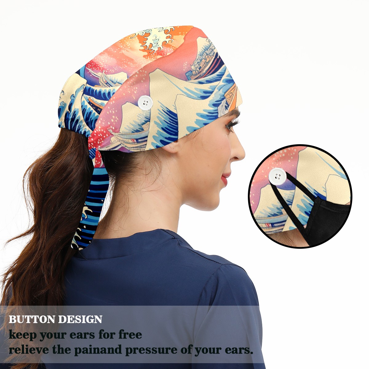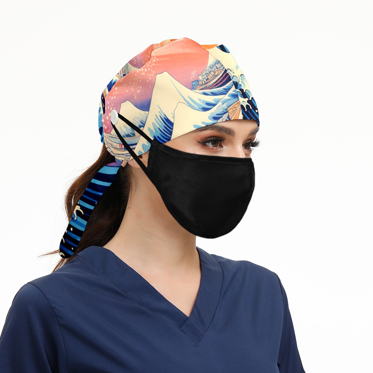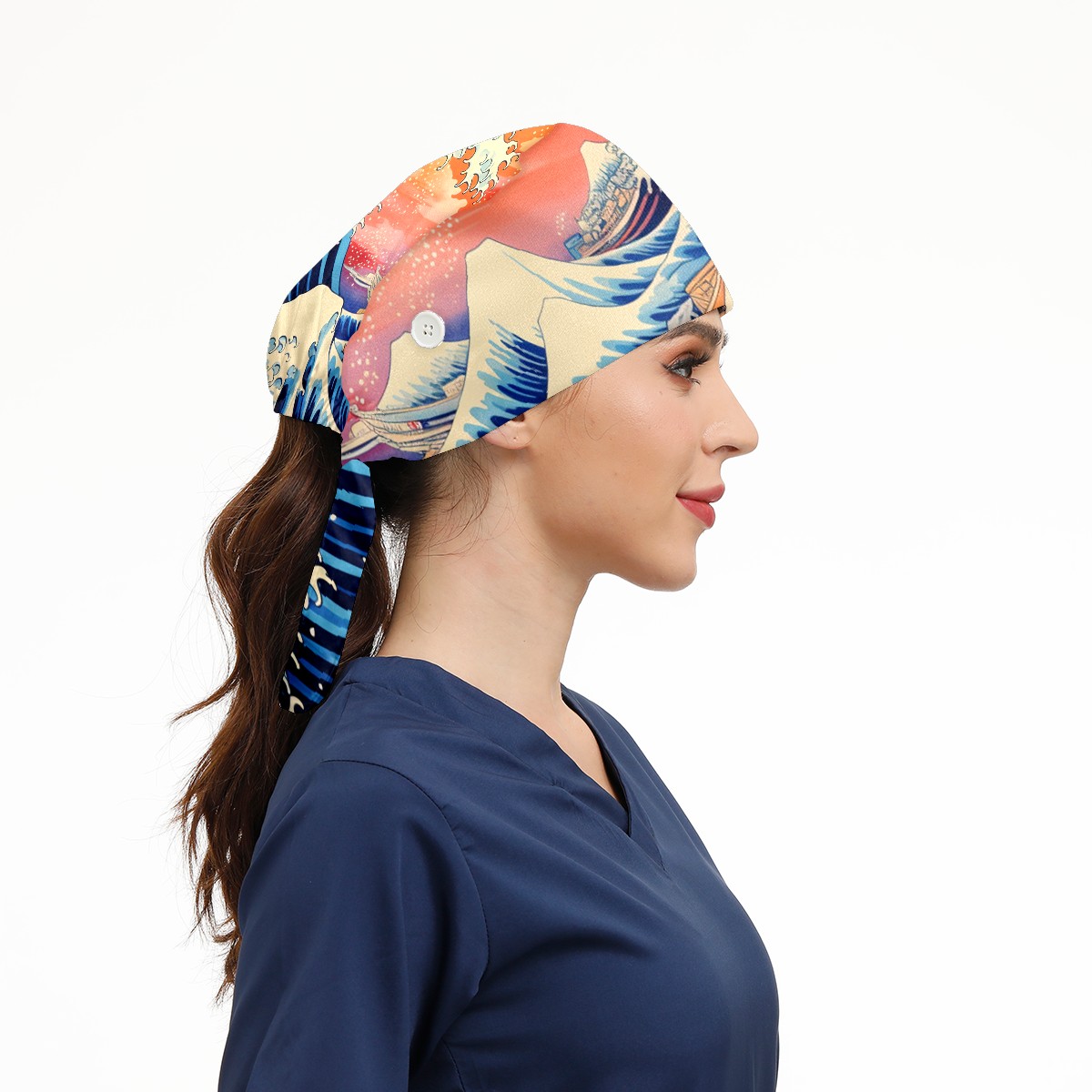 Working Caps with Button&Sweatband Satin Lined Cotton Adjustable Nurse Hats Elastic Band Scrub Cap Surgeon Hat Wave