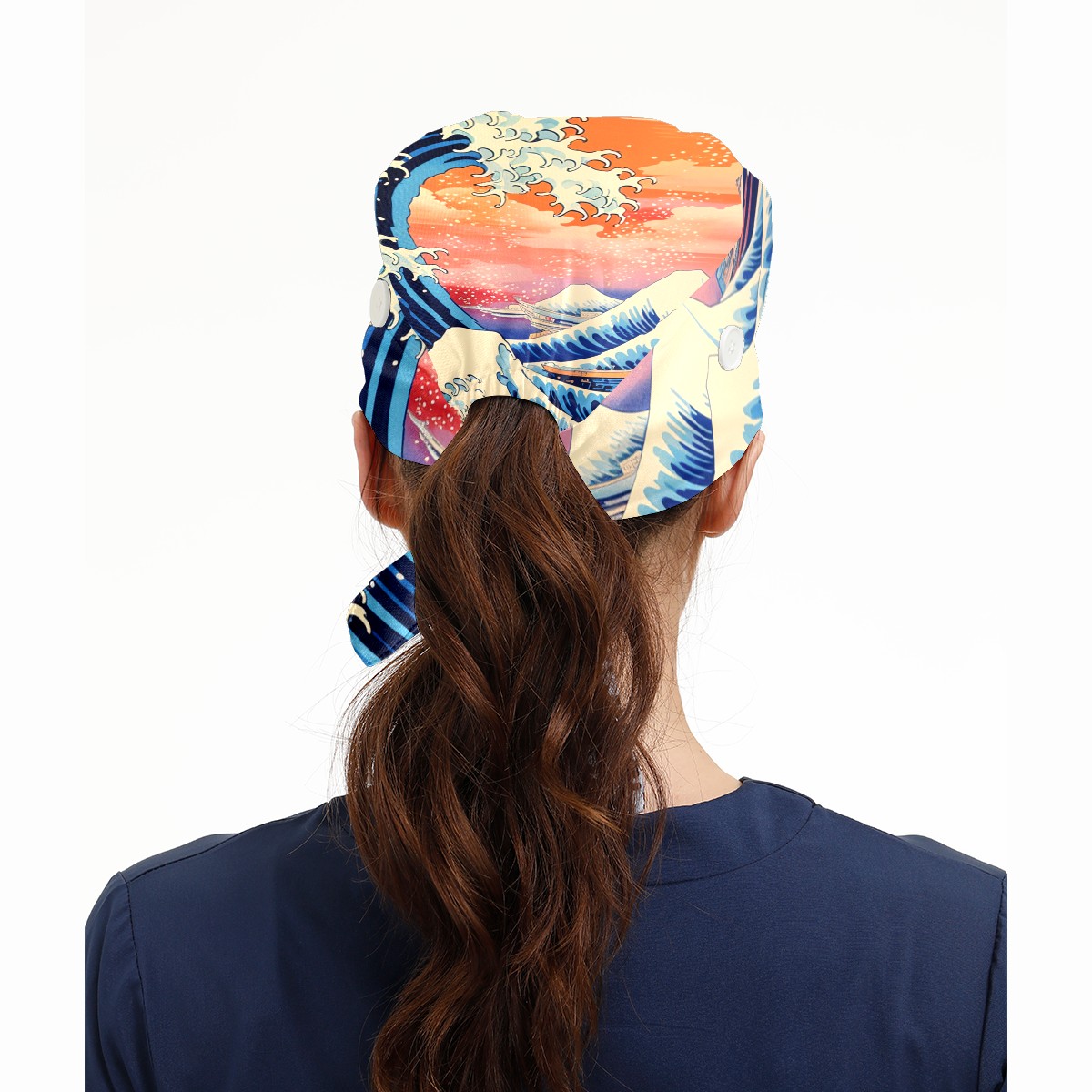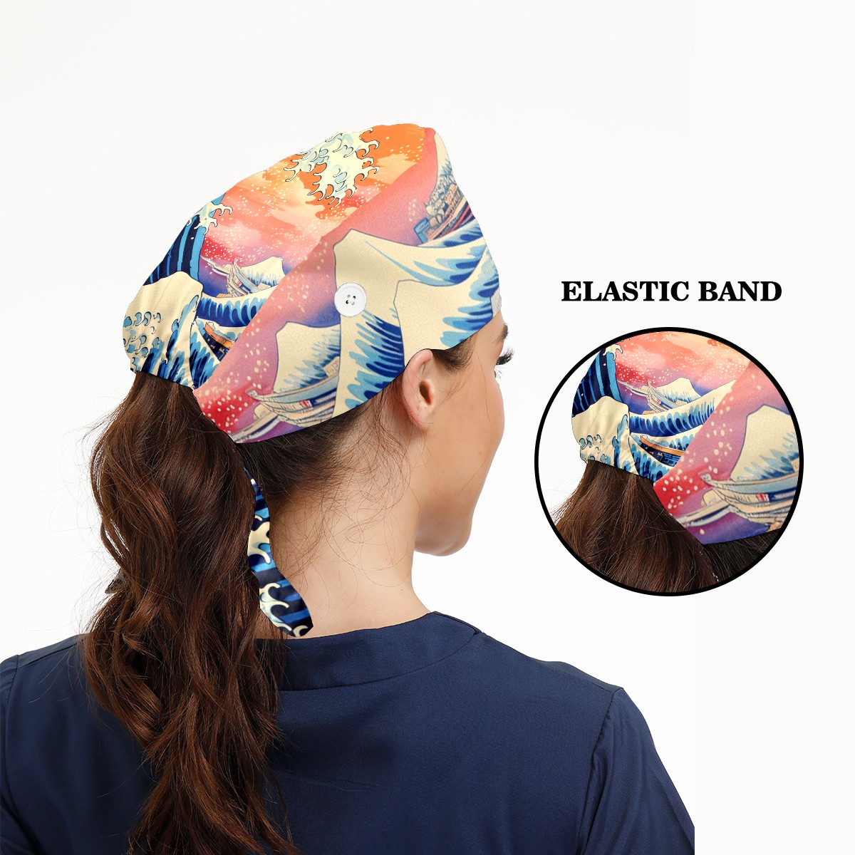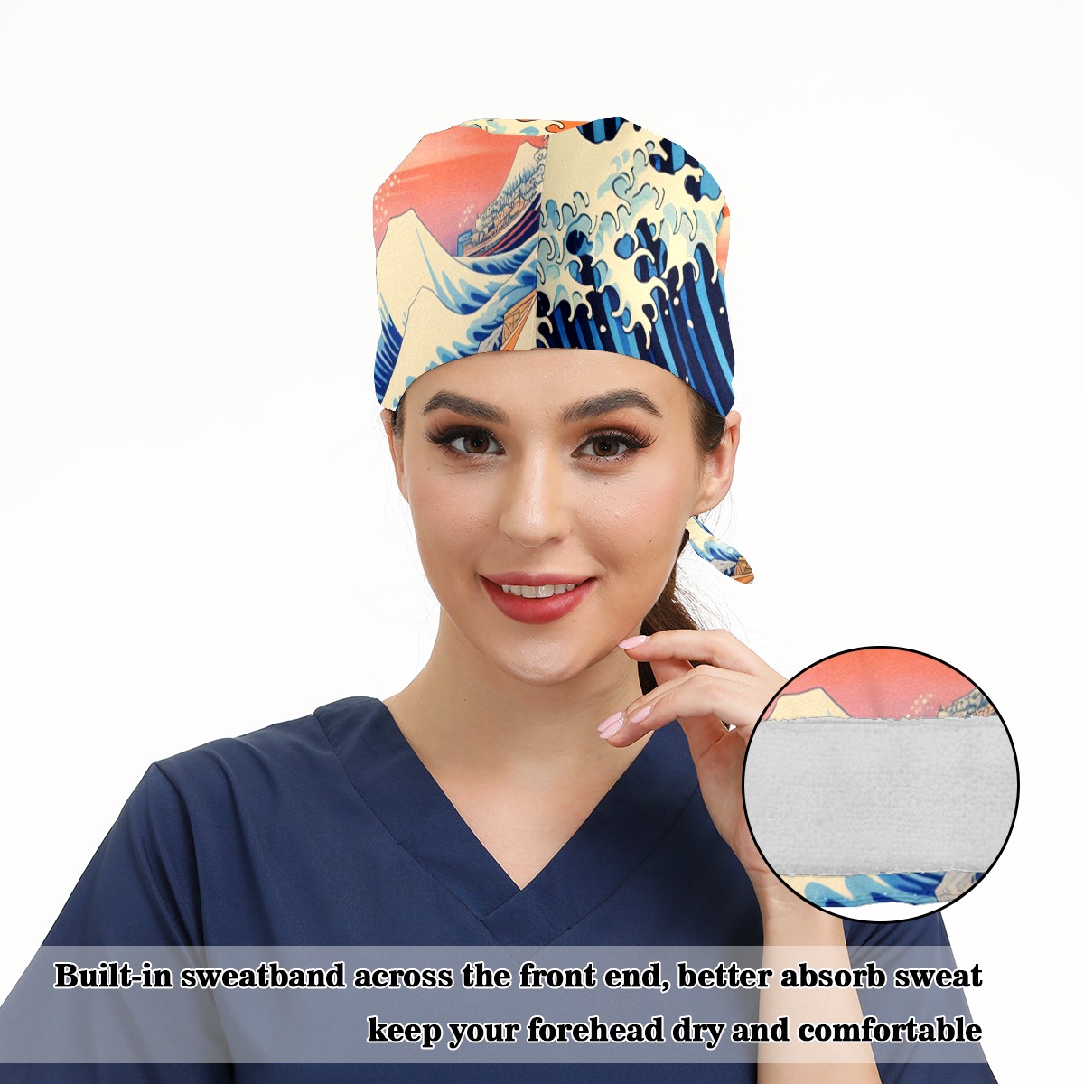 Working Caps with Button&Sweatband Satin Lined Cotton Adjustable Nurse Hats Elastic Band Scrub Cap Surgeon Hat Wave