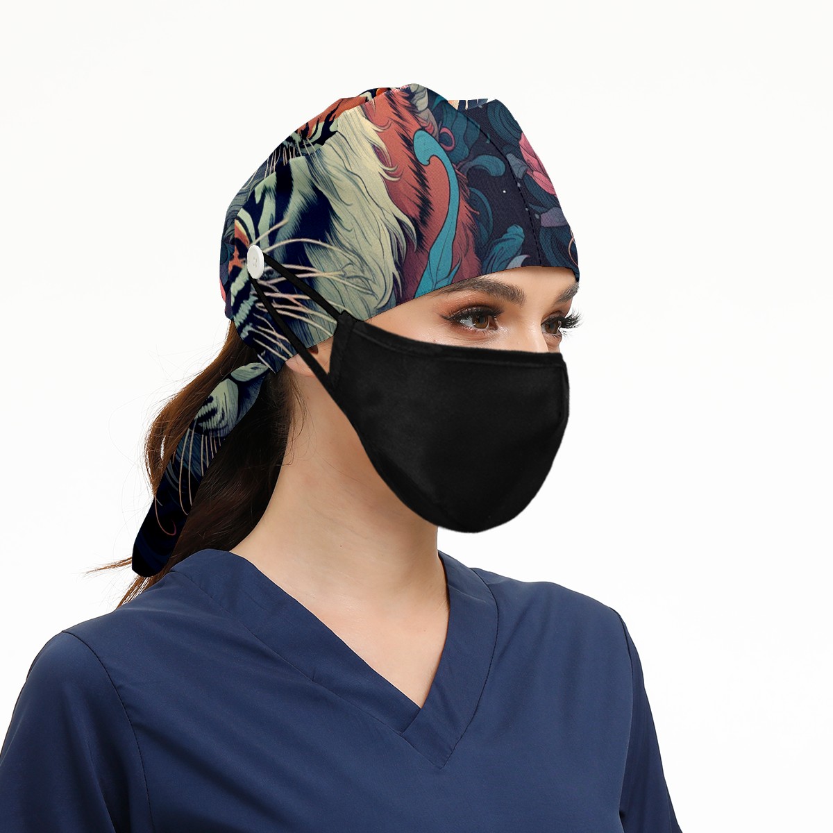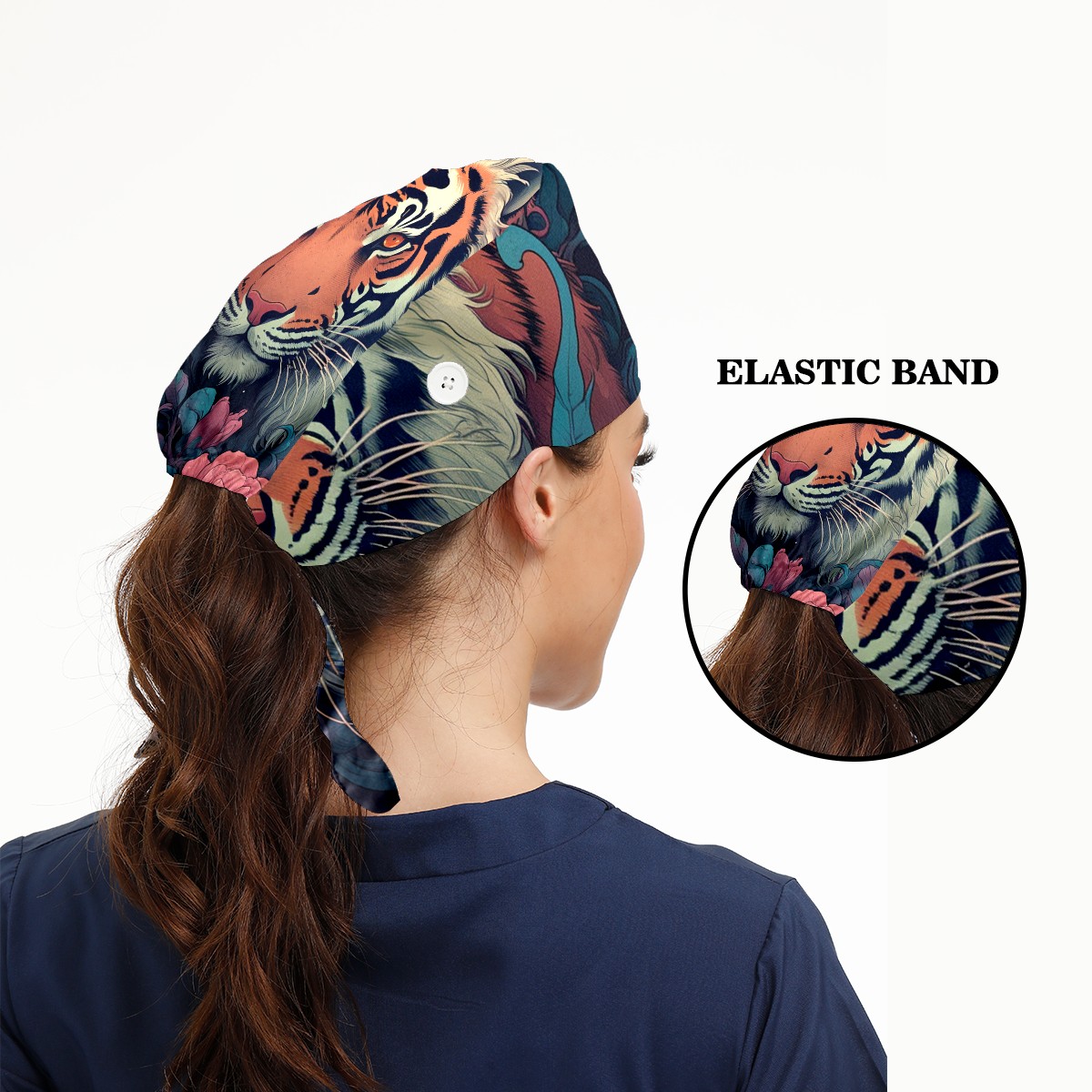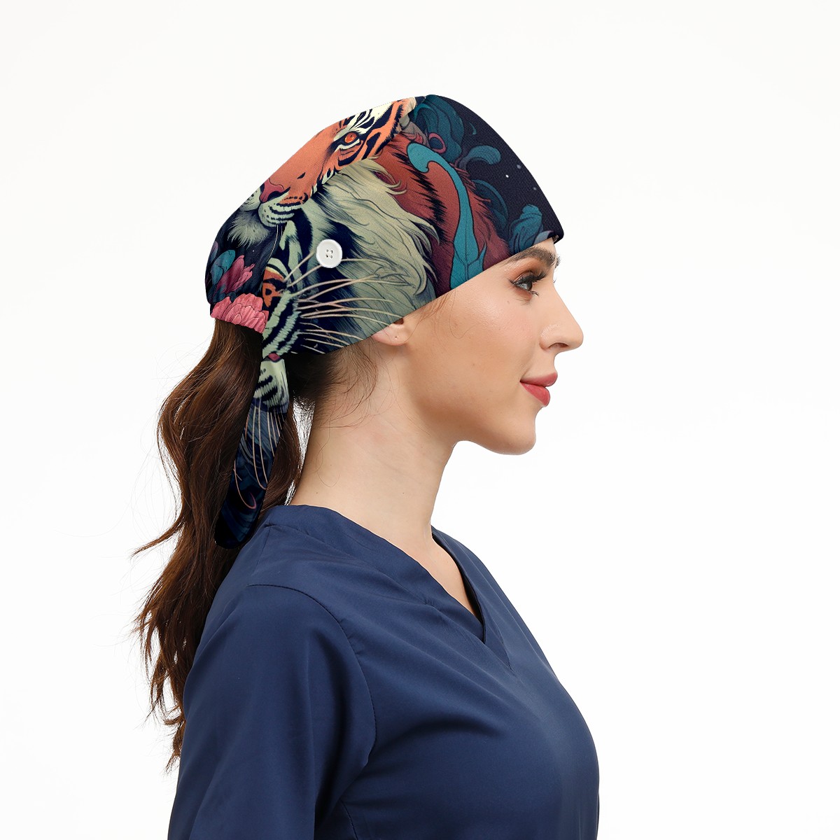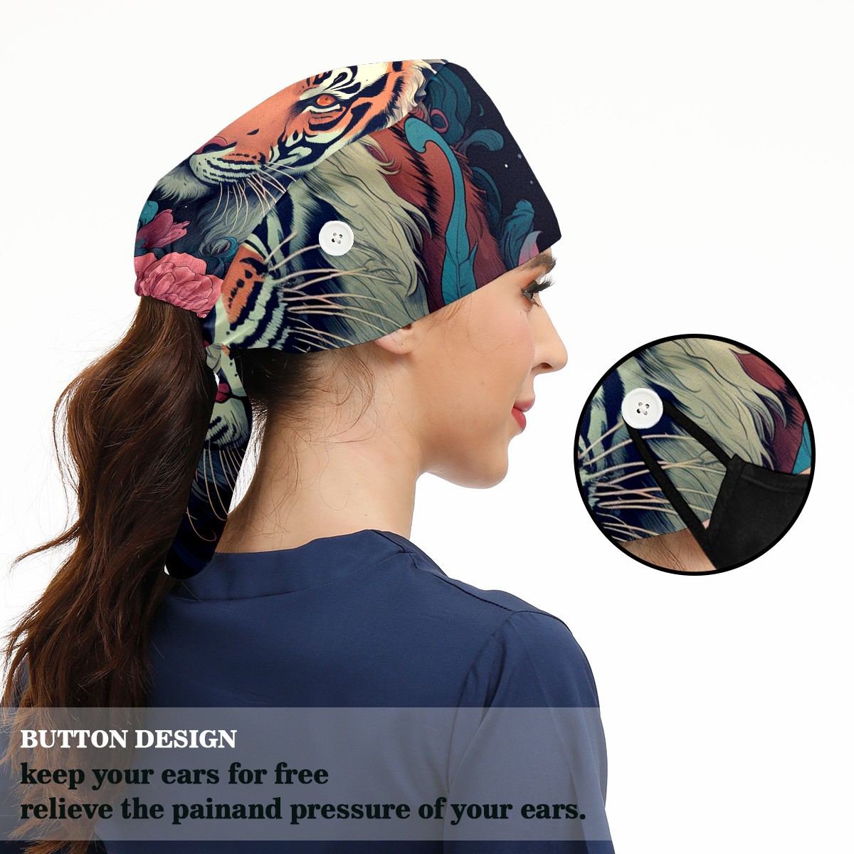 Working Caps with Button&Sweatband Satin Lined Cotton Adjustable Nurse Hats Elastic Band Scrub Cap Surgeon Hat Tiger