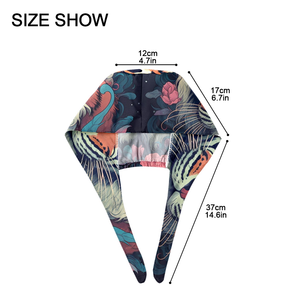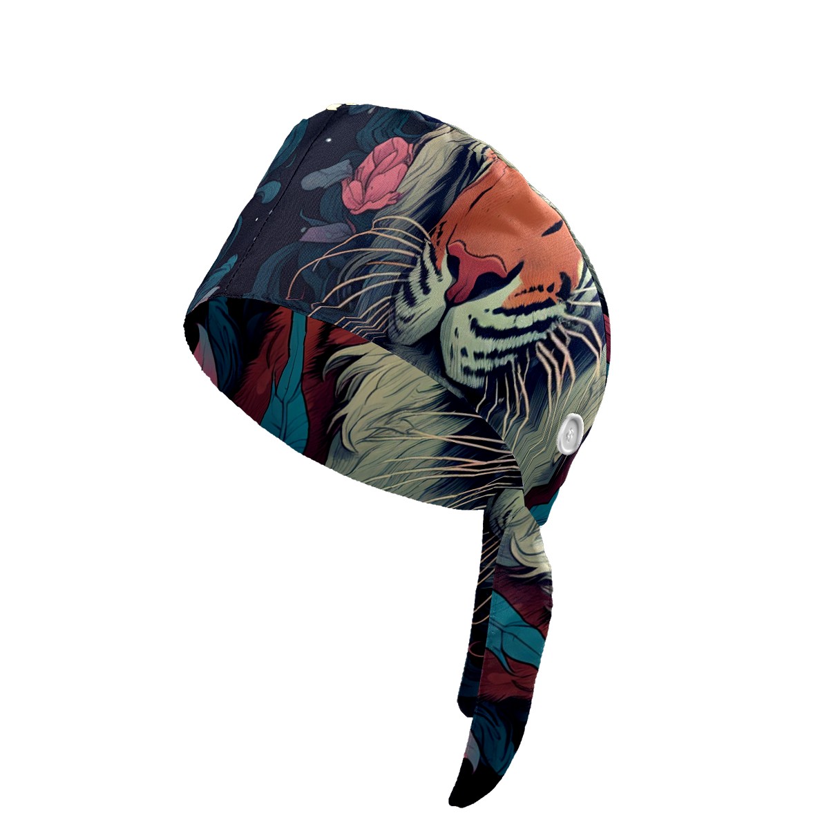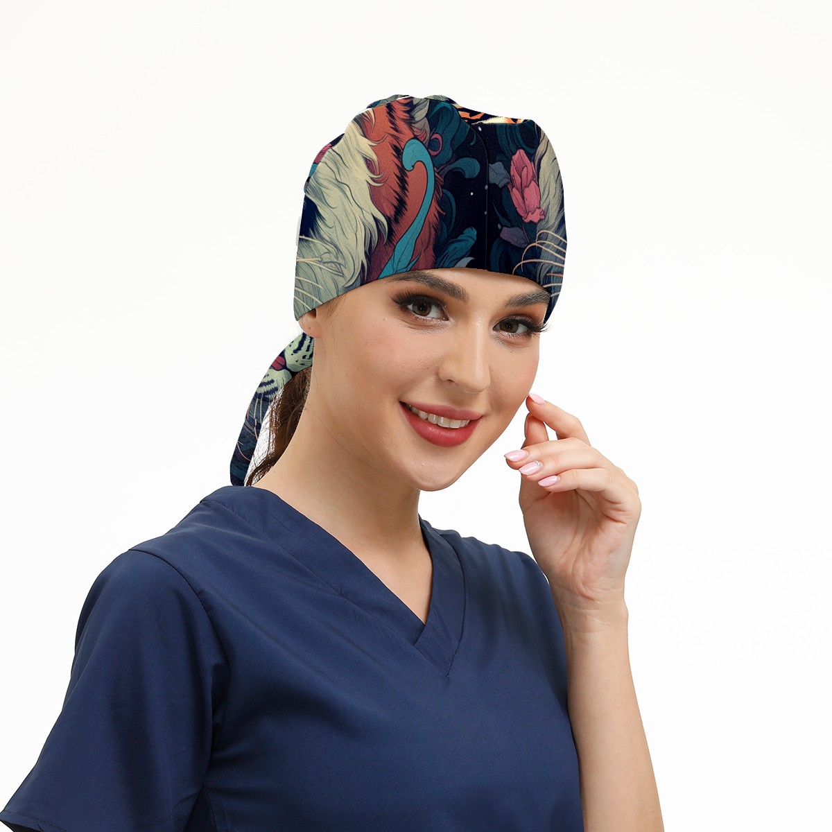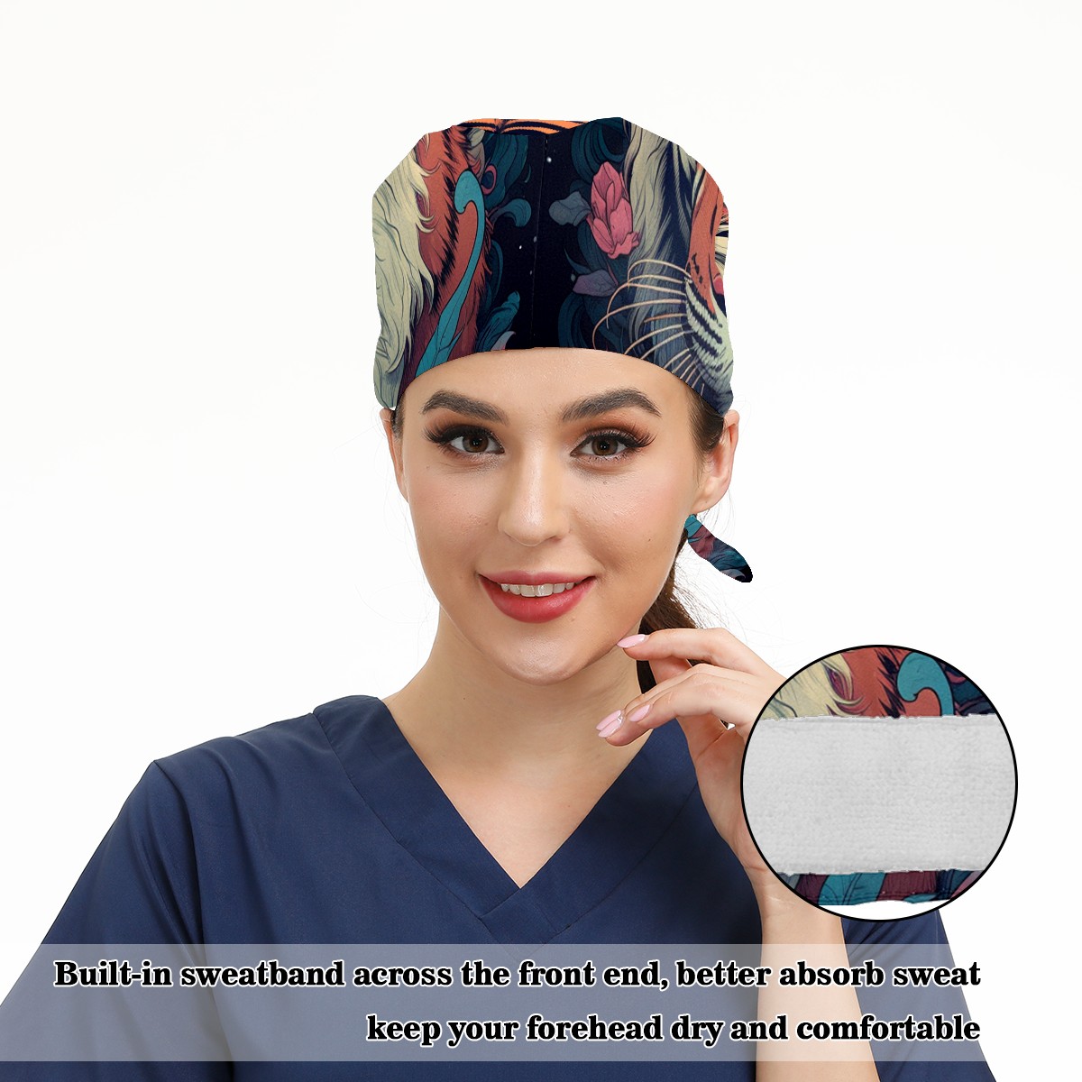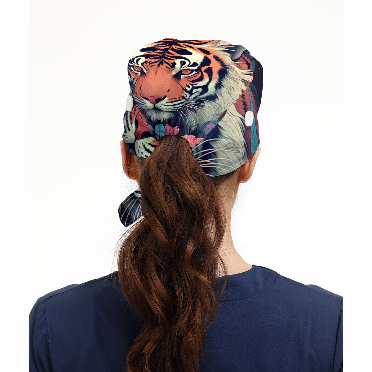 Working Caps with Button&Sweatband Satin Lined Cotton Adjustable Nurse Hats Elastic Band Scrub Cap Surgeon Hat Tiger
