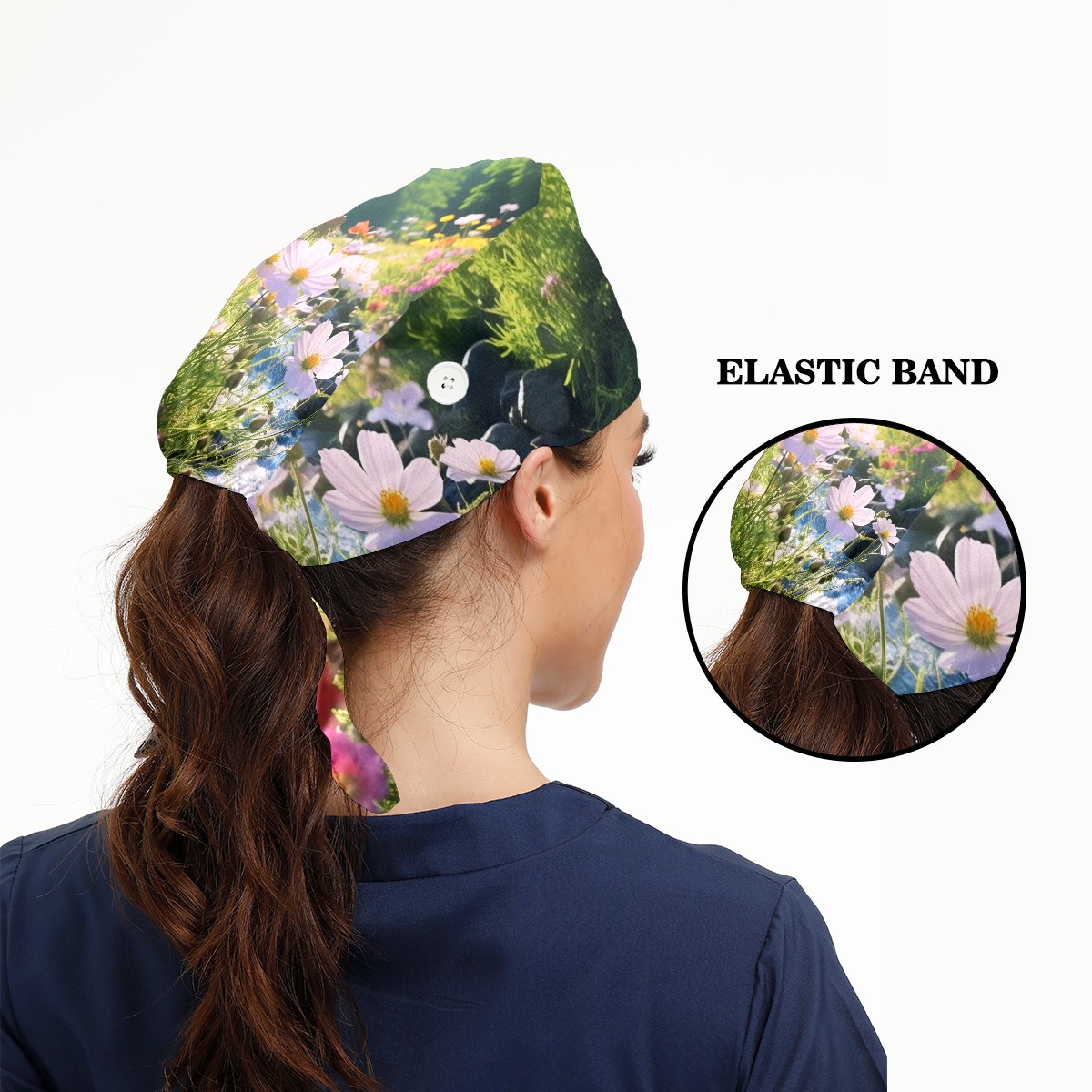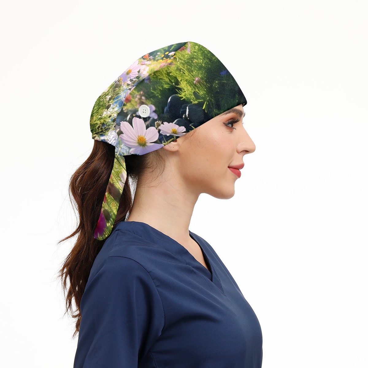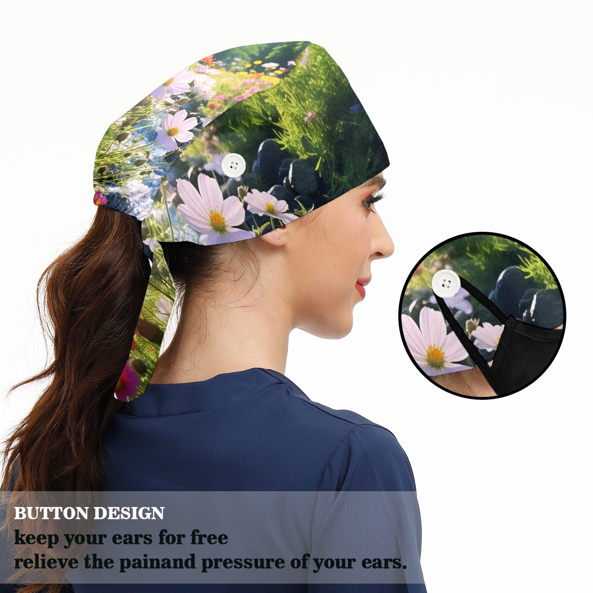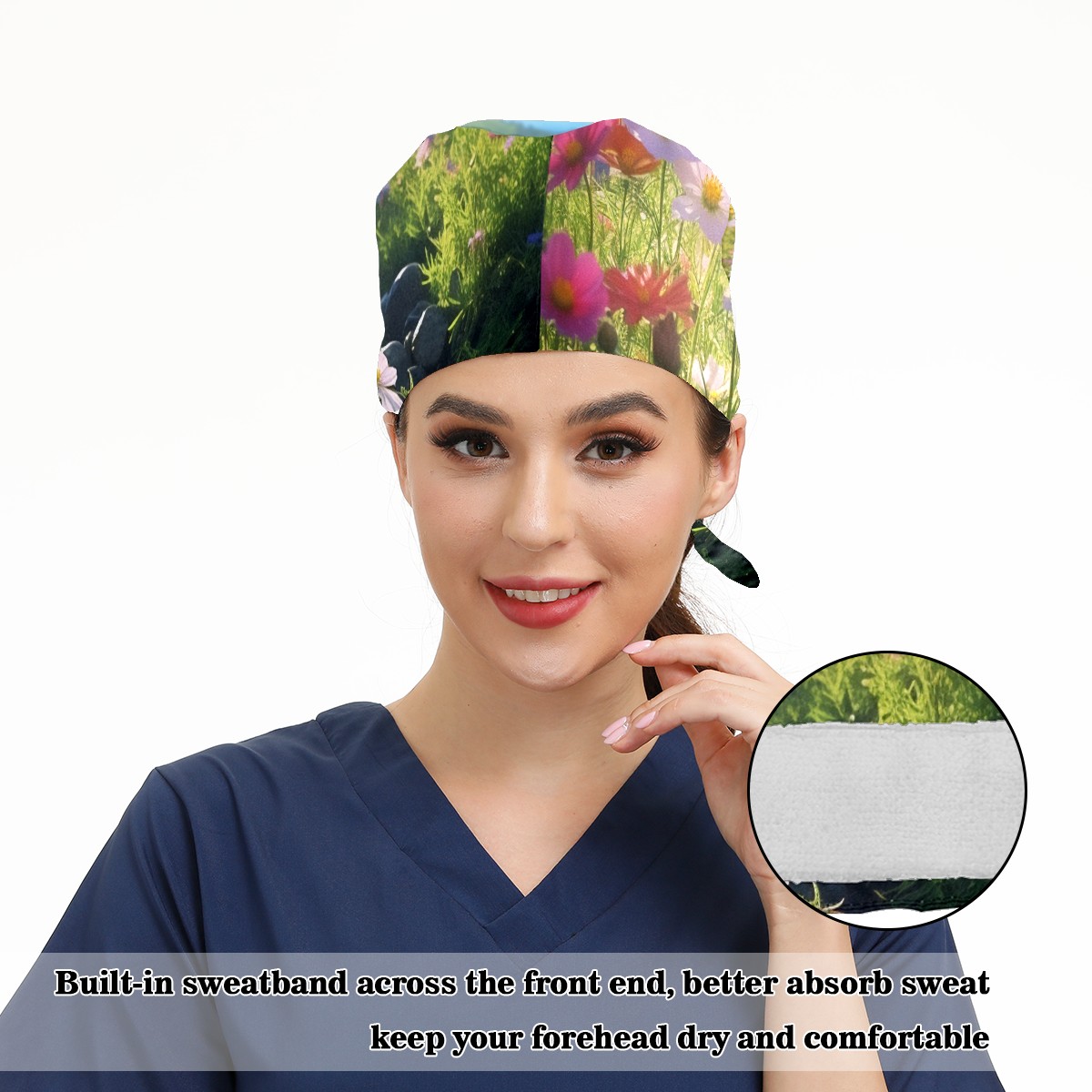 Working Caps with Button&Sweatband Satin Lined Cotton Adjustable Nurse Hats Elastic Band Scrub Cap Surgeon Hat Spring