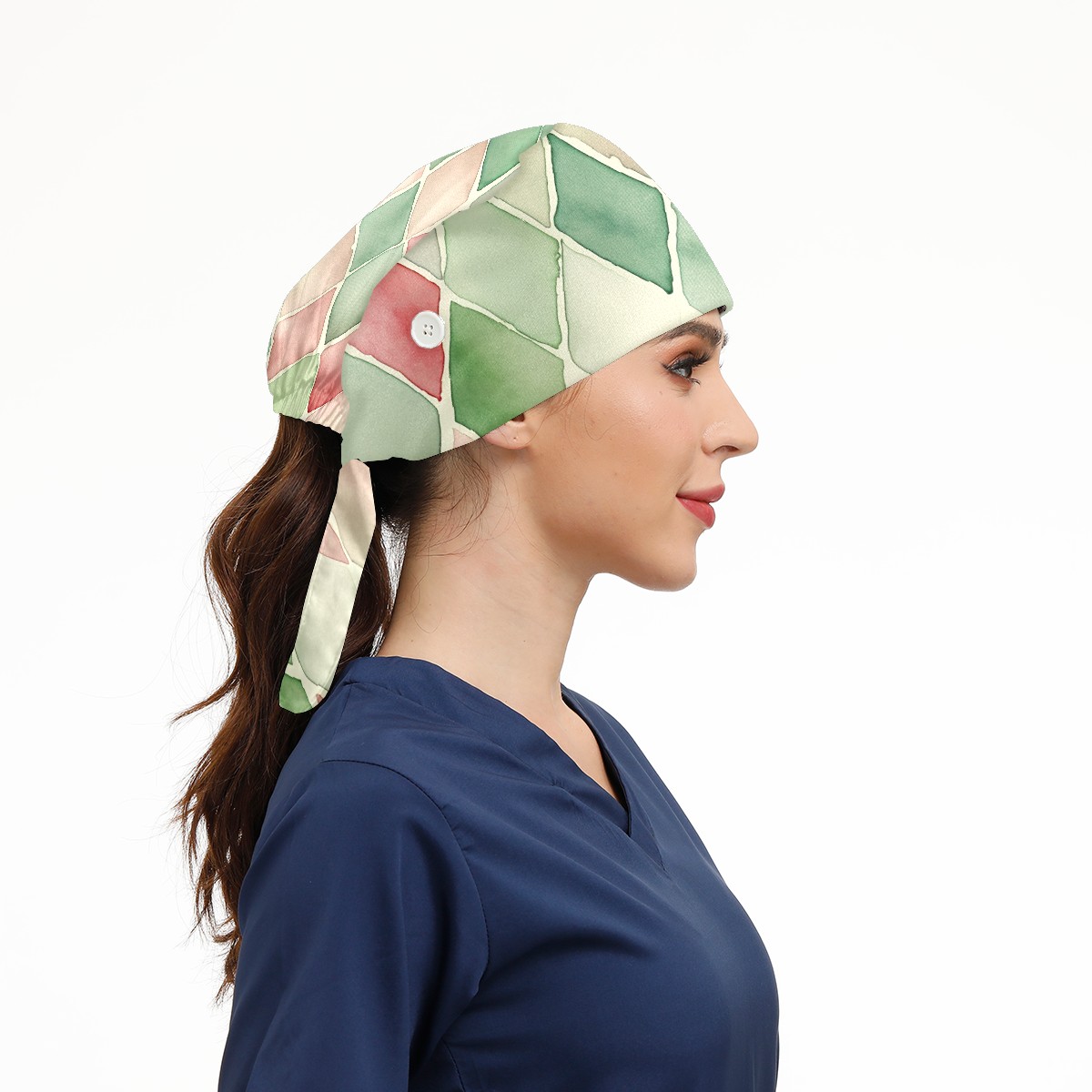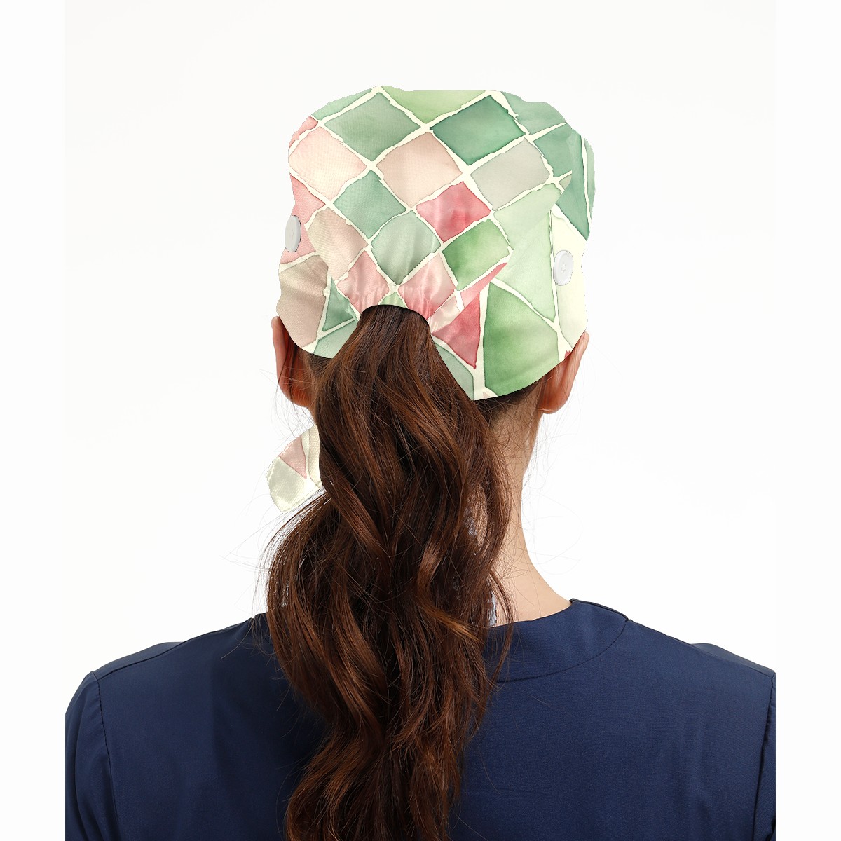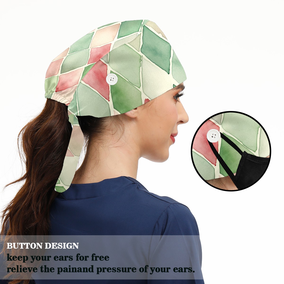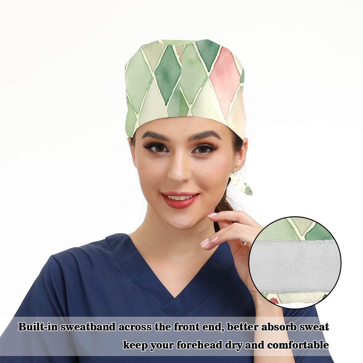 Working Caps with Button&Sweatband Satin Lined Cotton Adjustable Nurse Hats Elastic Band Scrub Cap Surgeon Hat Lattice Pattern