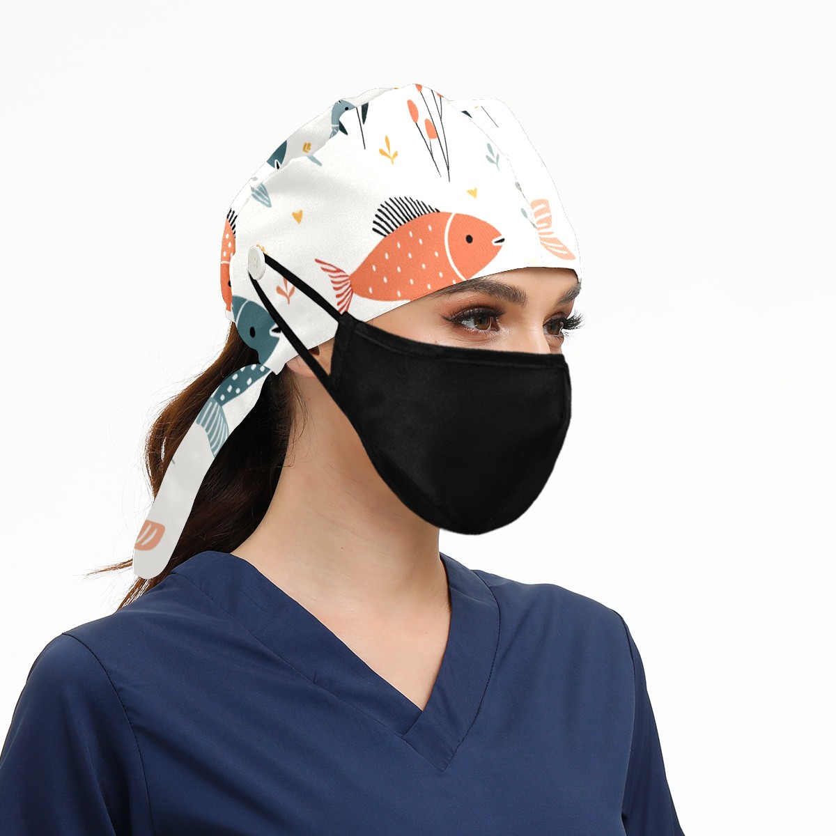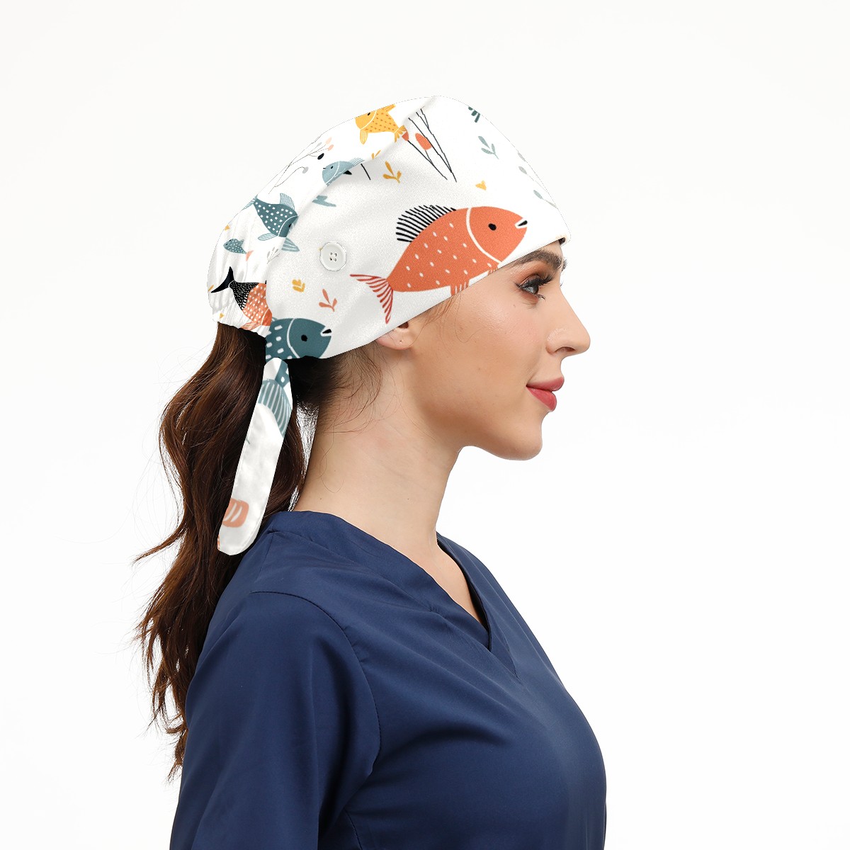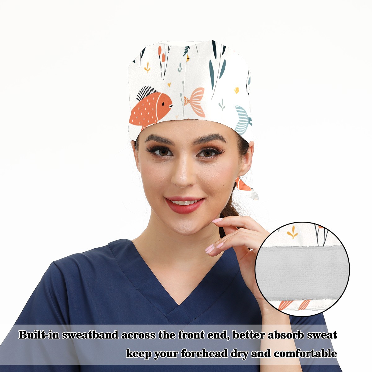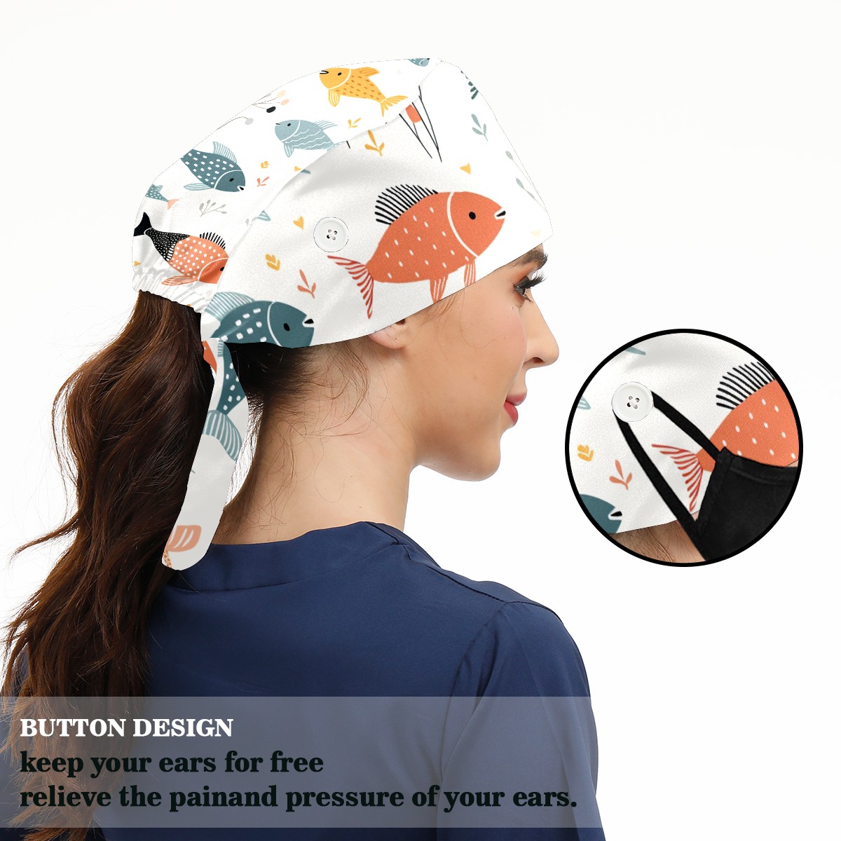 Working Caps with Button&Sweatband Satin Lined Cotton Adjustable Nurse Hats Elastic Band Scrub Cap Surgeon Hat Fish