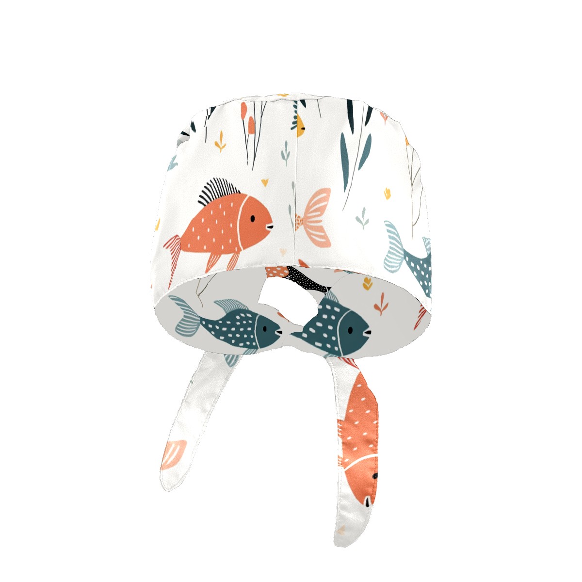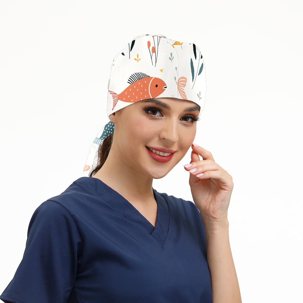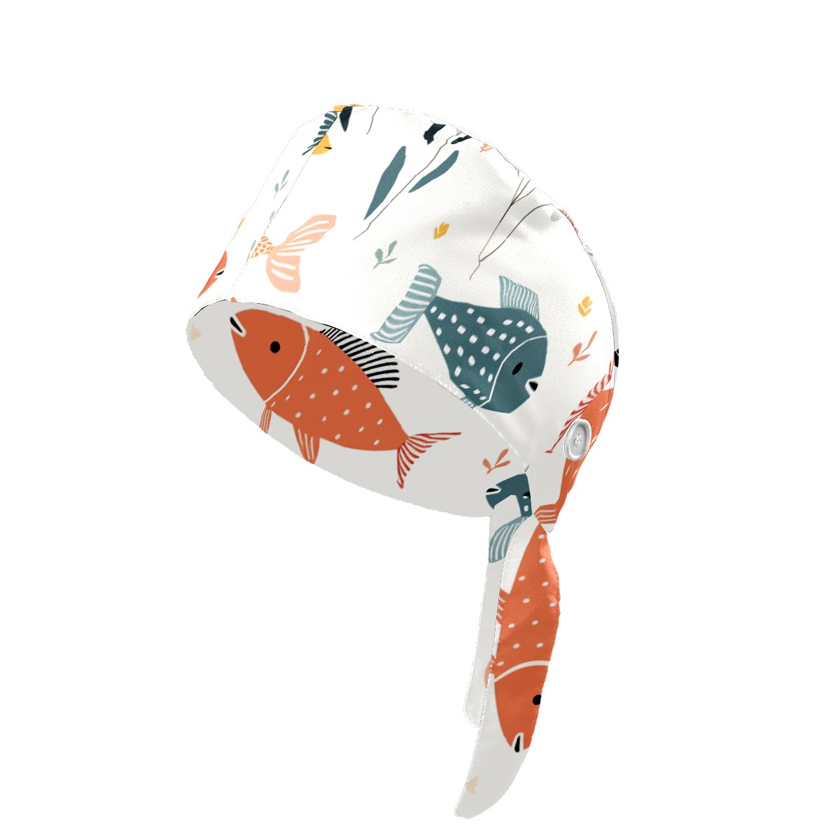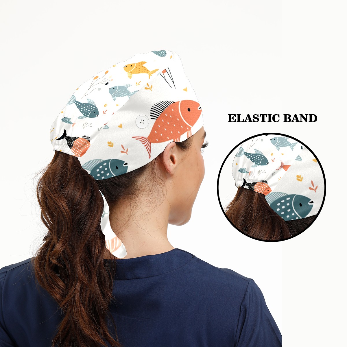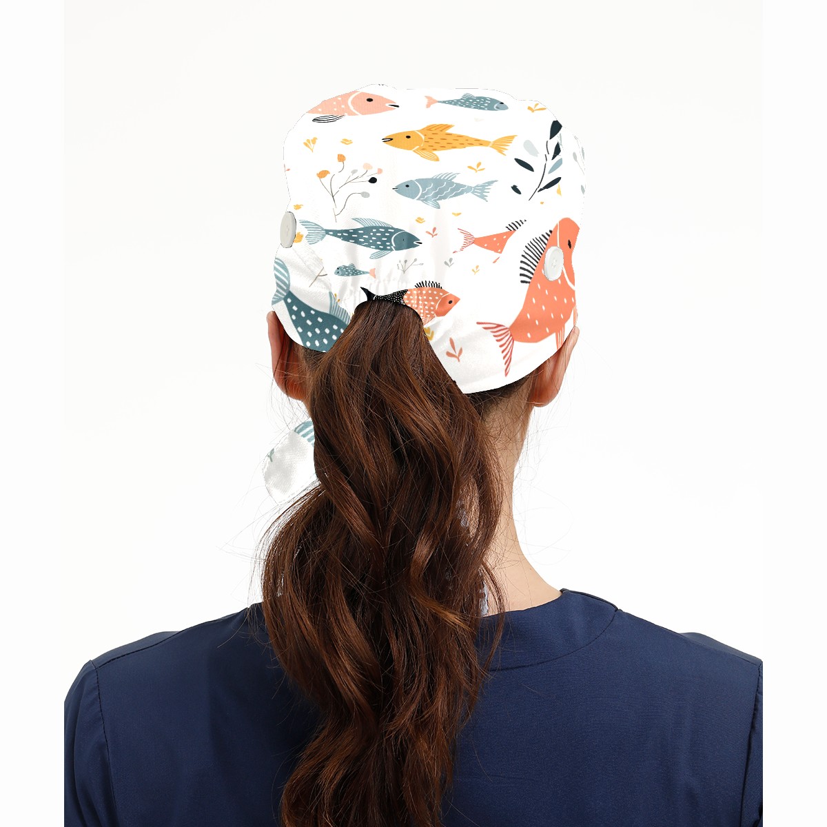 Working Caps with Button&Sweatband Satin Lined Cotton Adjustable Nurse Hats Elastic Band Scrub Cap Surgeon Hat Fish