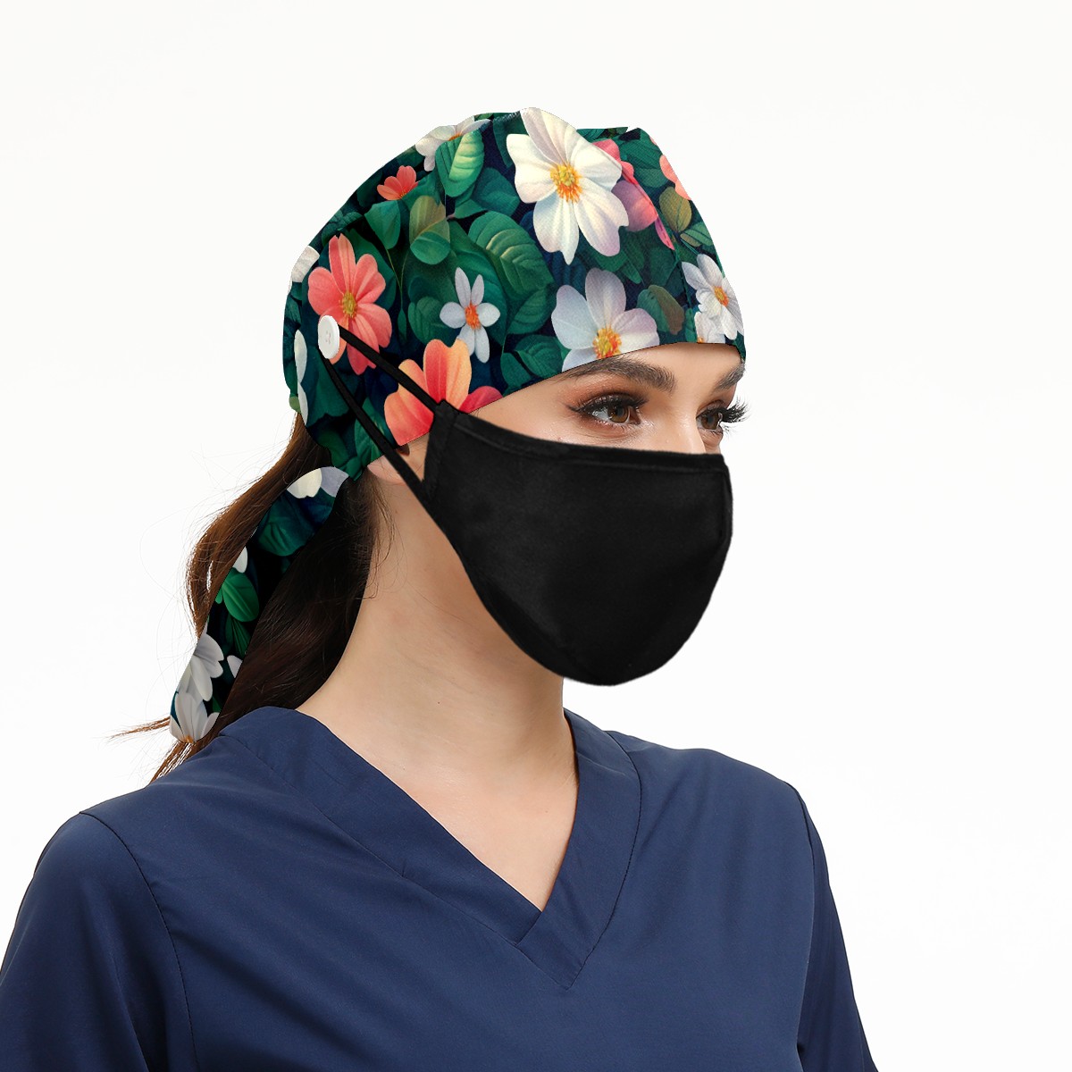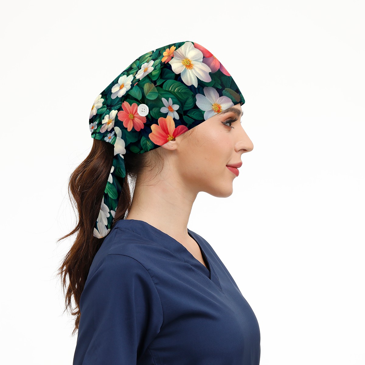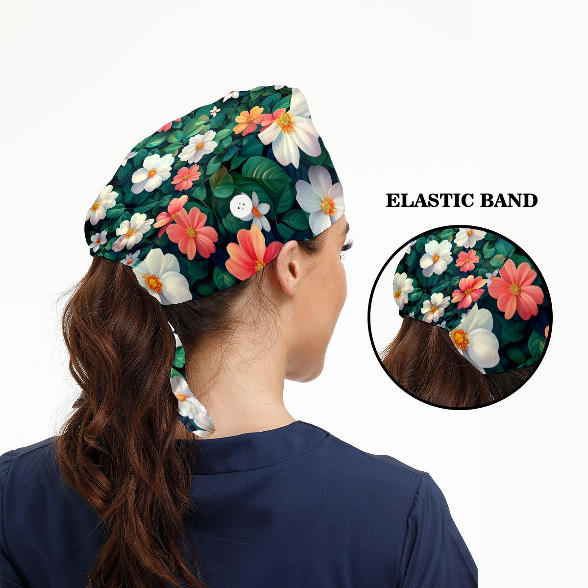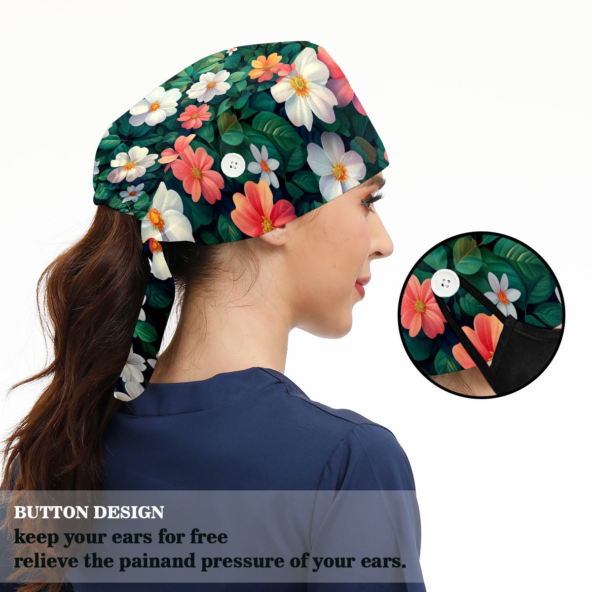 Working Caps with Button&Sweatband Satin Lined Cotton Adjustable Nurse Hats Elastic Band Scrub Cap Surgeon Hat Blossom B