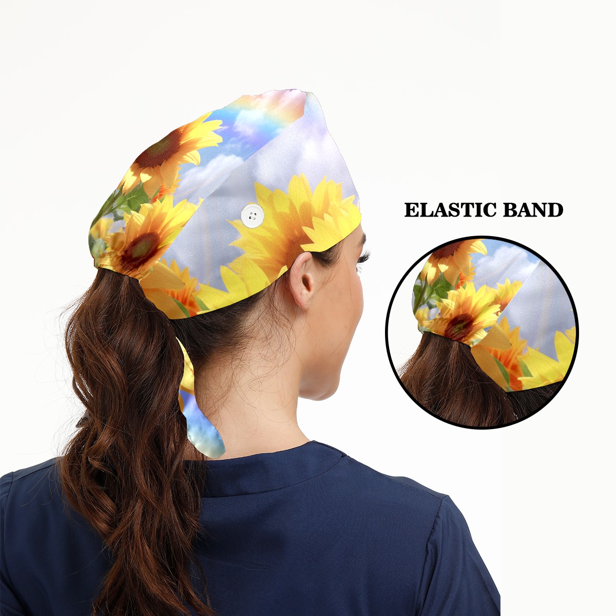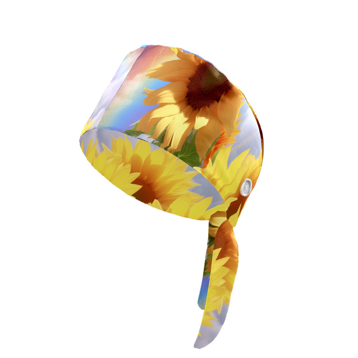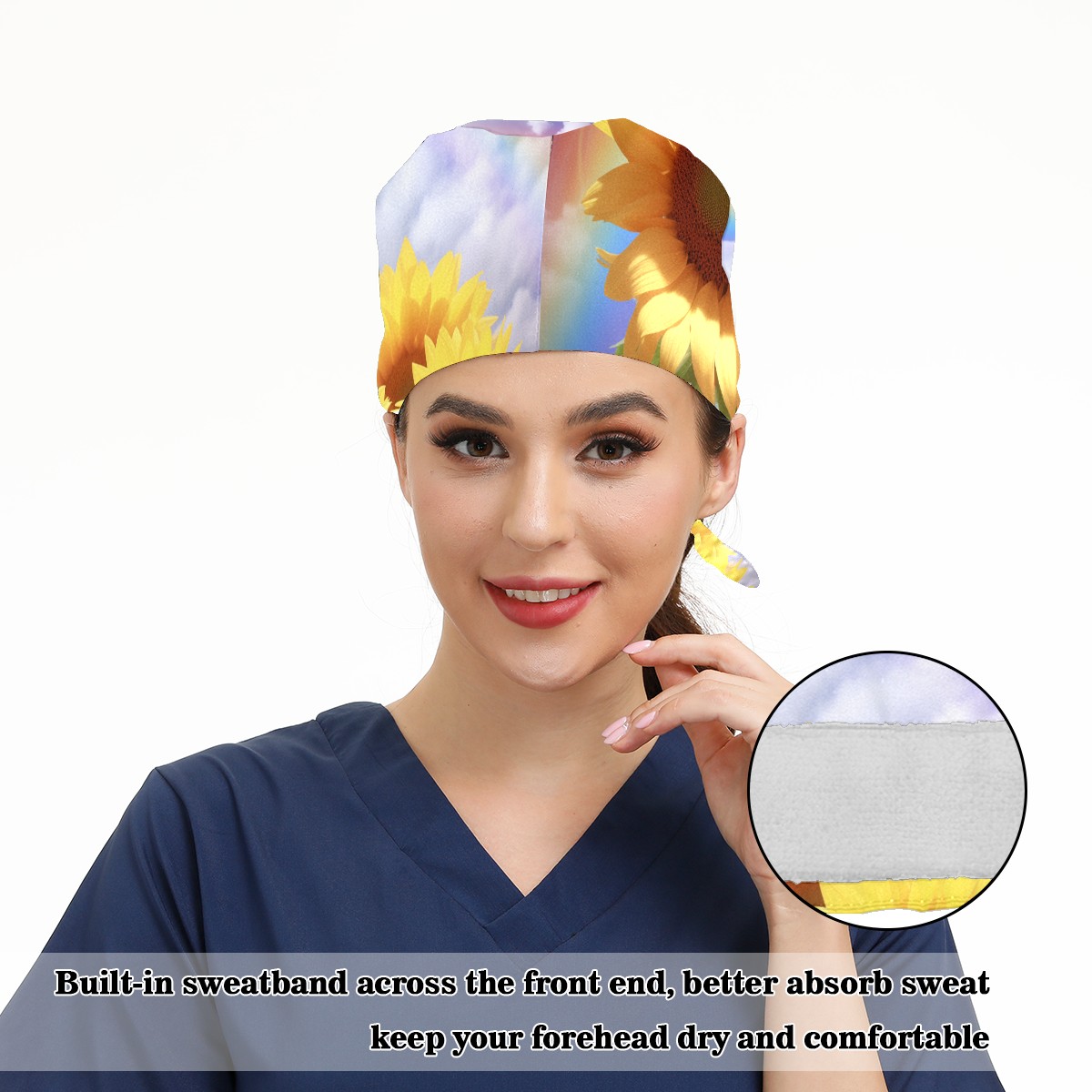 Working Caps with Button&Sweatband Satin Lined Cotton Adjustable Nurse Hats Elastic Band Scrub Cap Surgeon Hat Sunflower