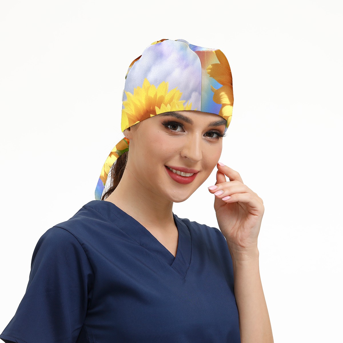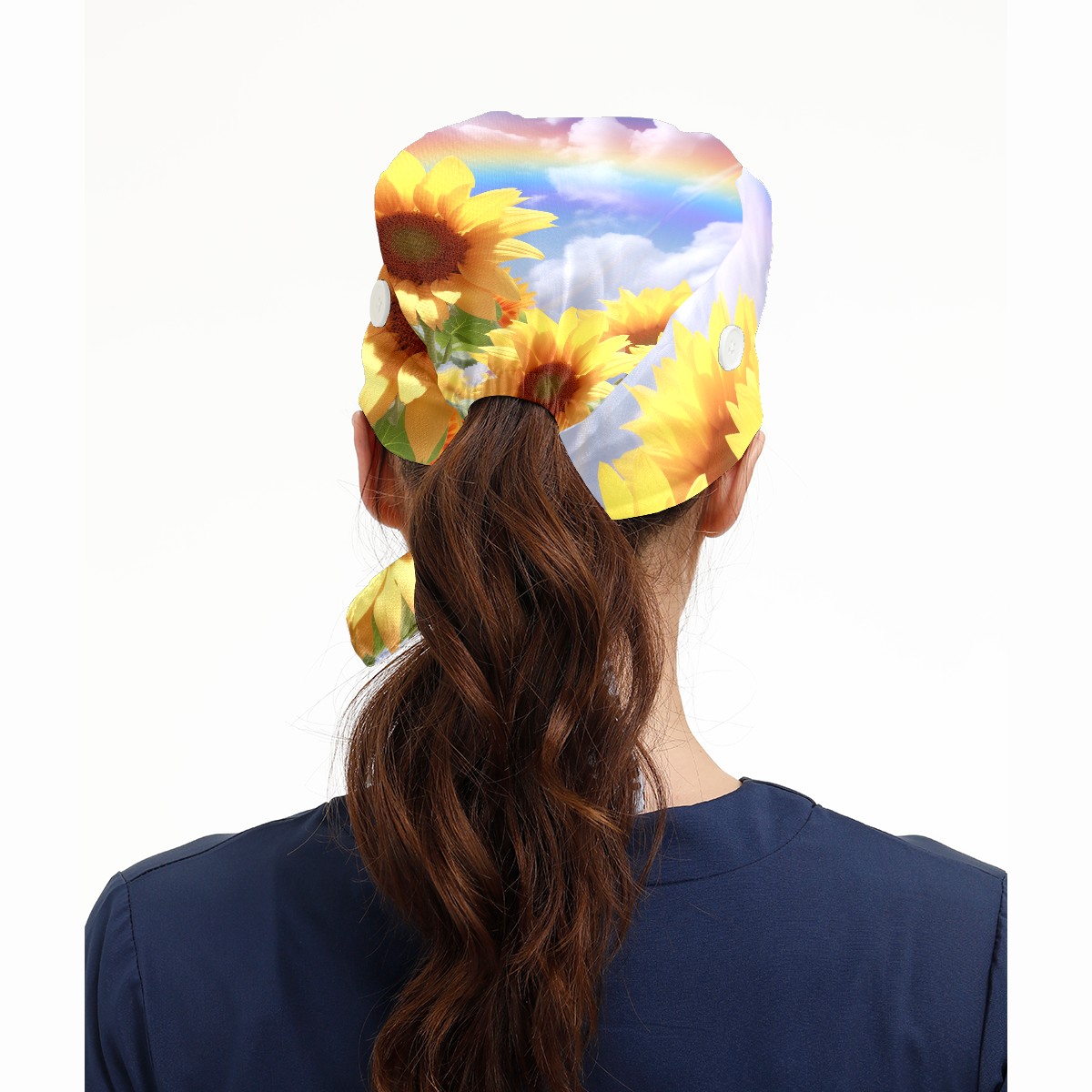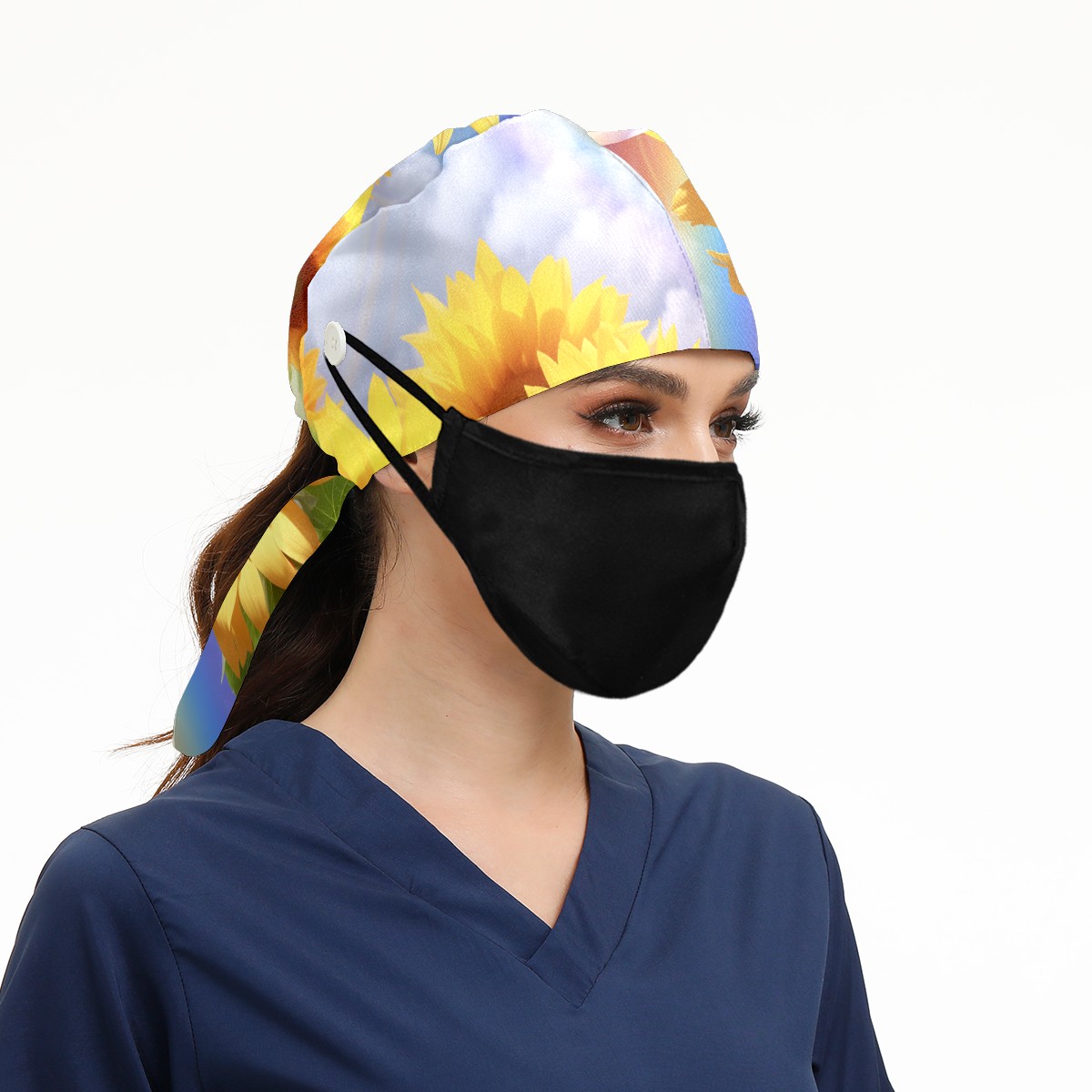 Working Caps with Button&Sweatband Satin Lined Cotton Adjustable Nurse Hats Elastic Band Scrub Cap Surgeon Hat Sunflower