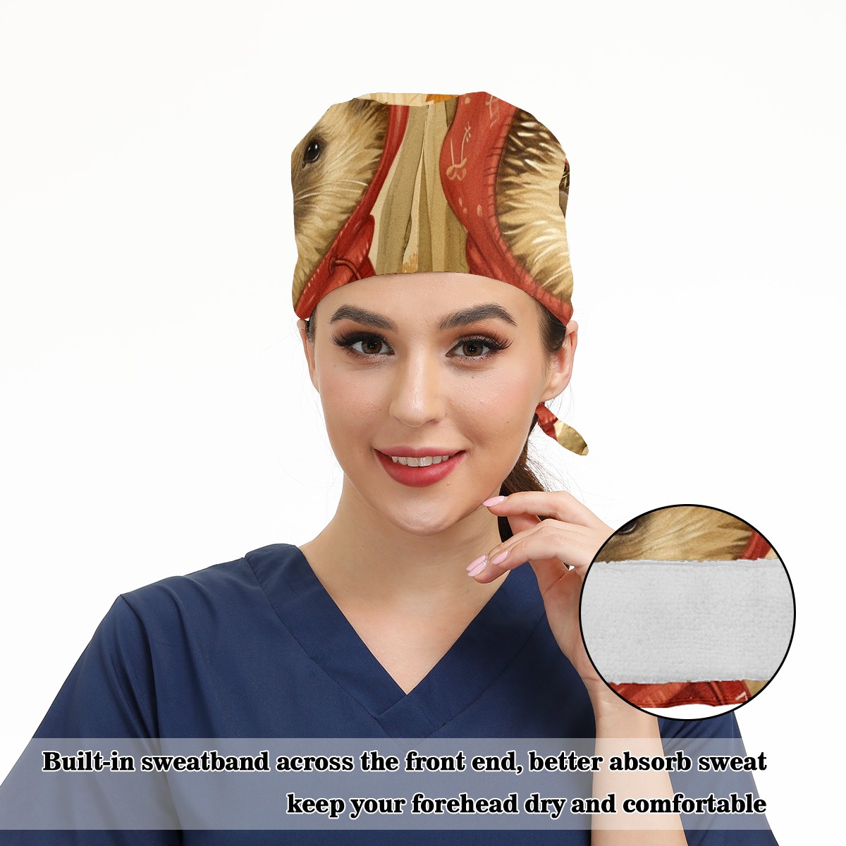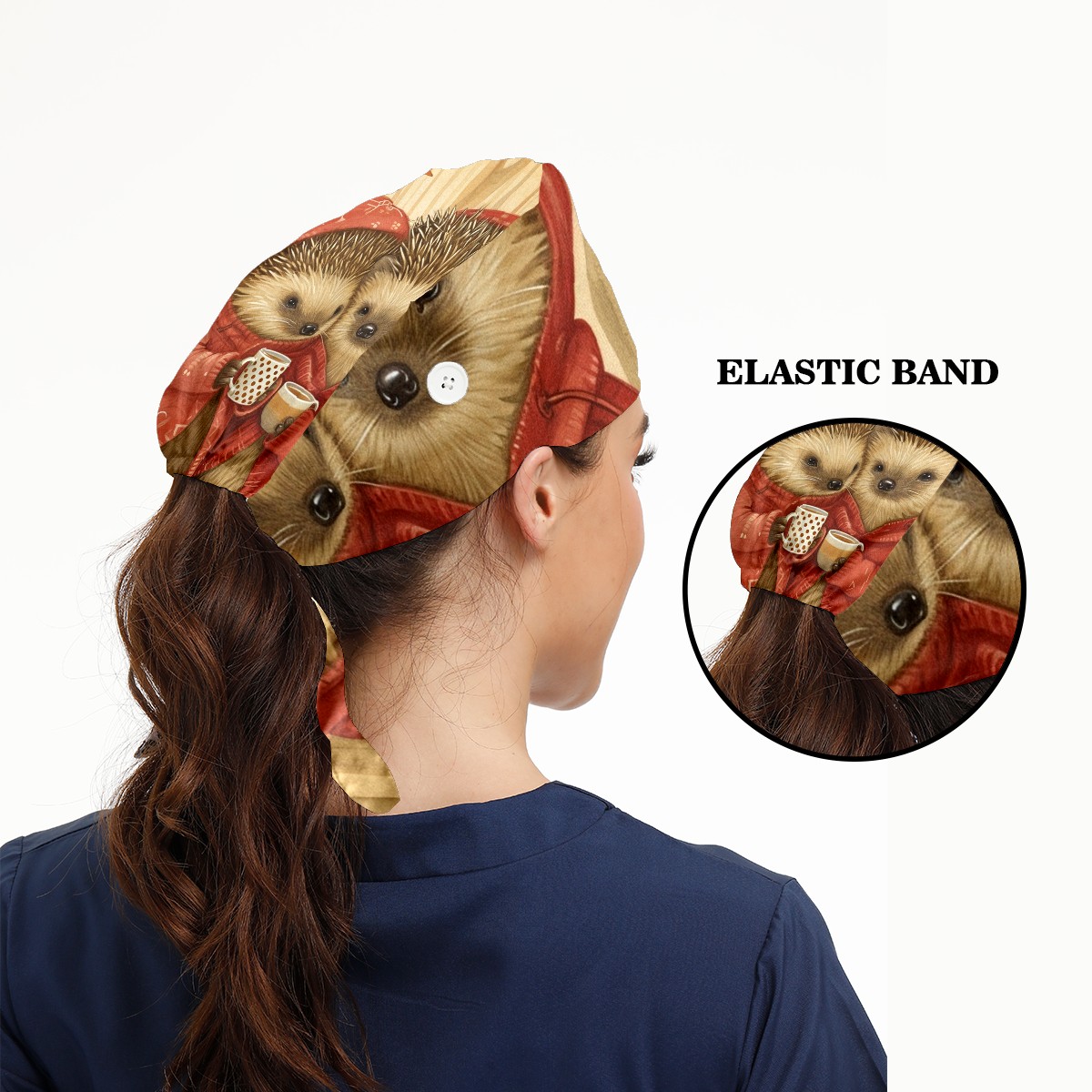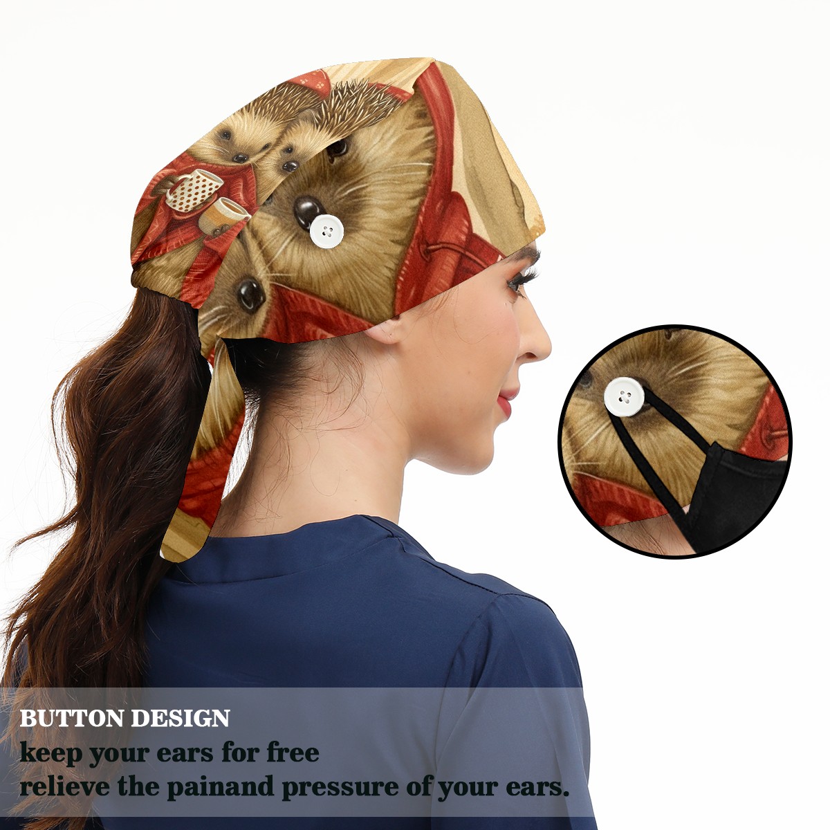 Working Caps with Button&Sweatband Satin Lined Cotton Adjustable Nurse Hats Elastic Band Scrub Cap Surgeon Hat Hedgehog