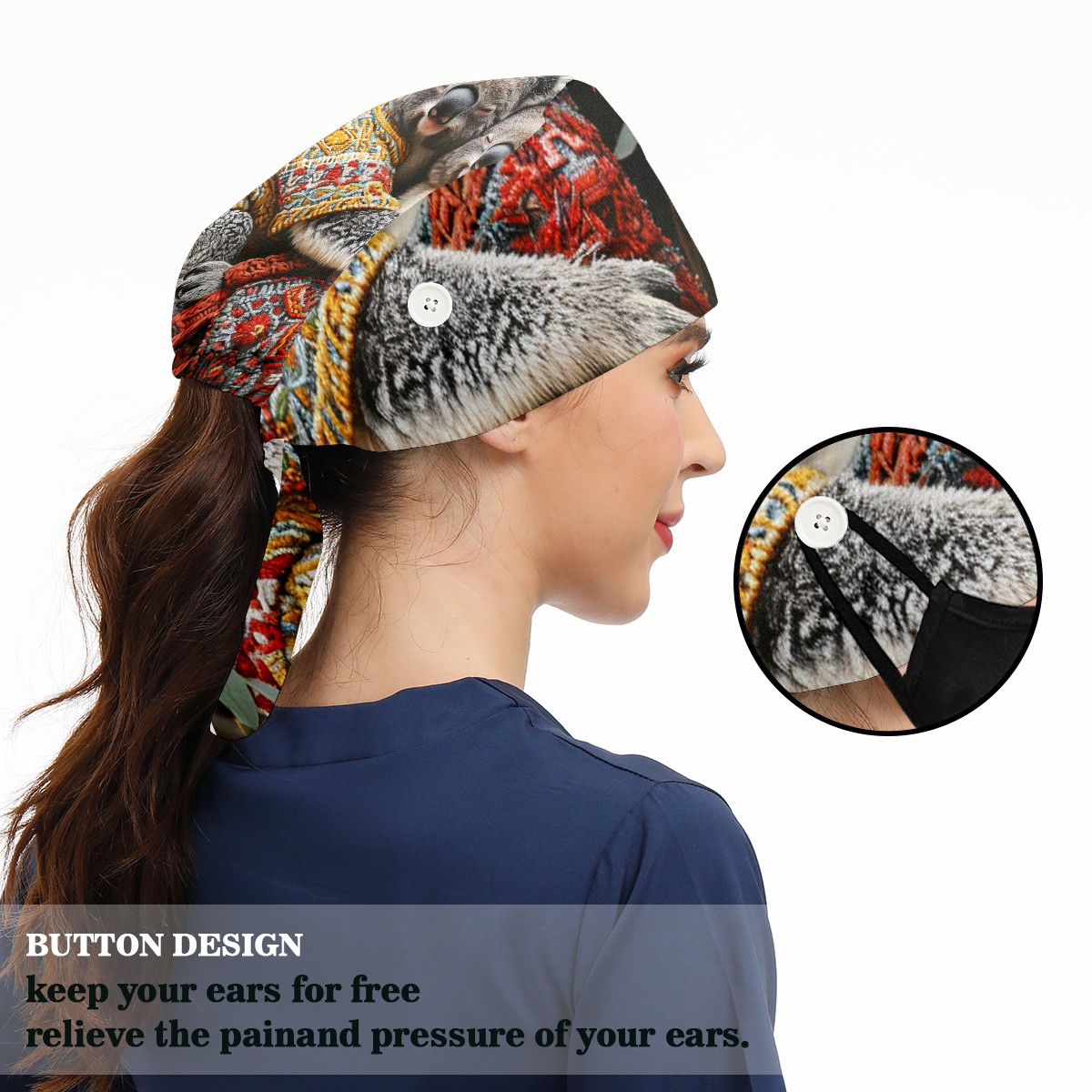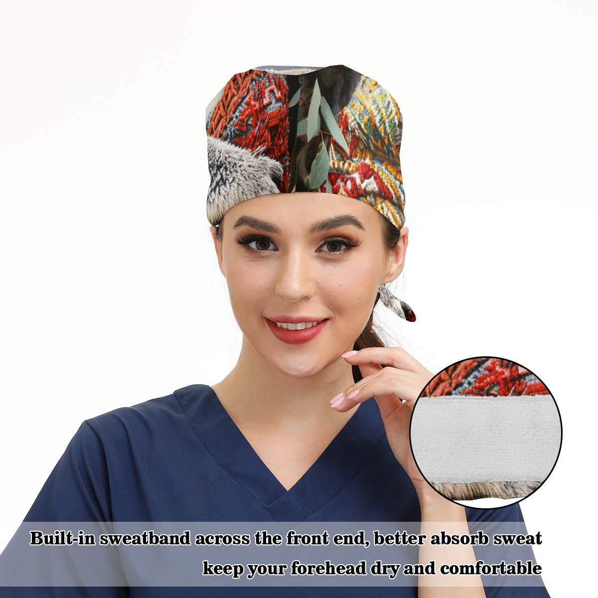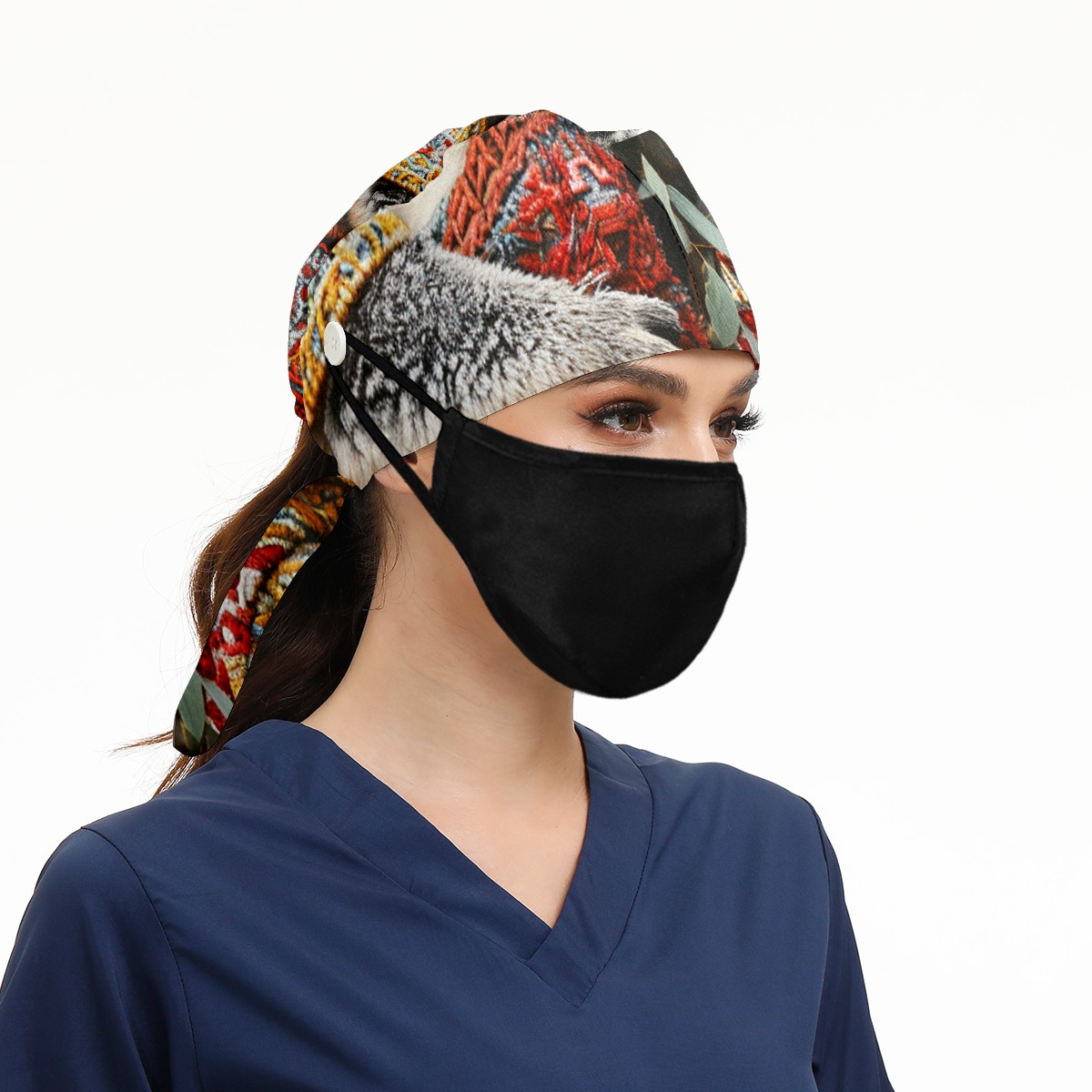 Working Caps with Button&Sweatband Satin Lined Cotton Adjustable Nurse Hats Elastic Band Scrub Cap Surgeon Hat Bear