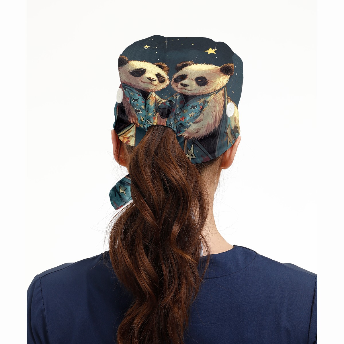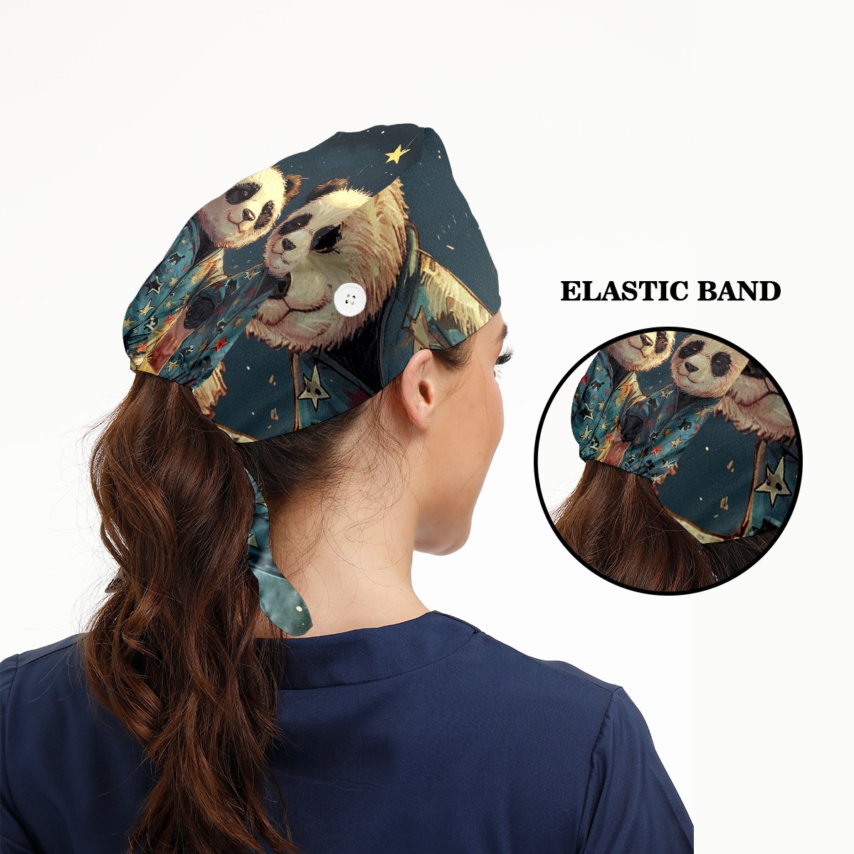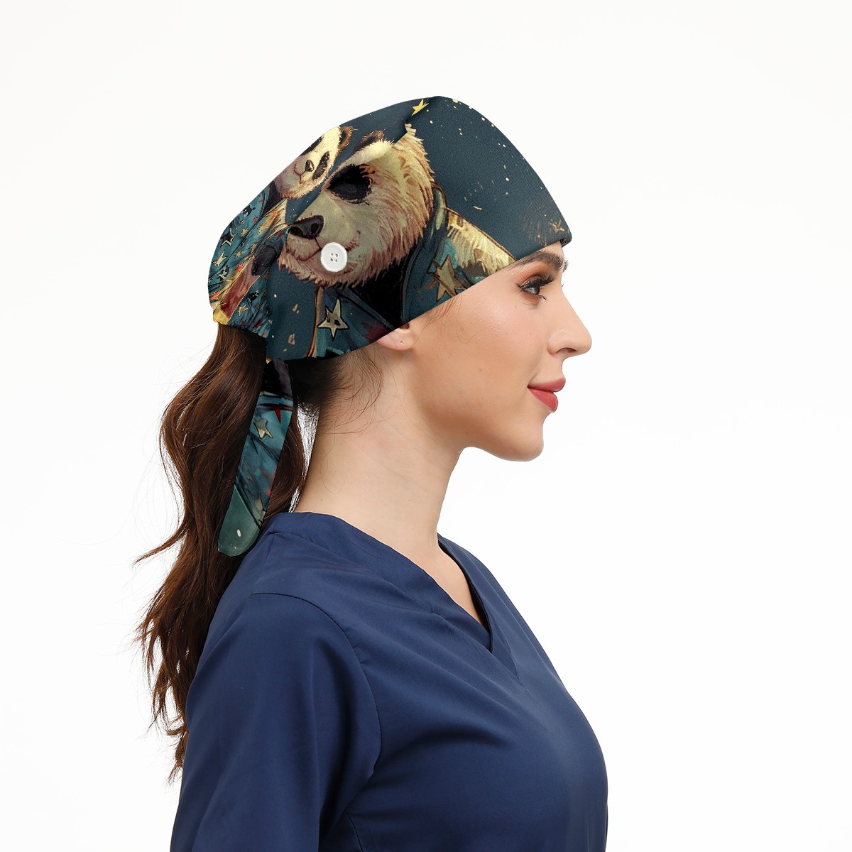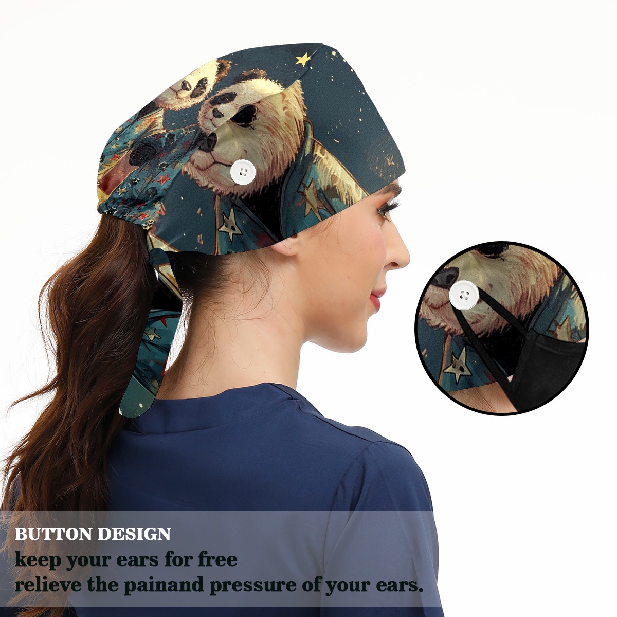 Working Caps with Button&Sweatband Satin Lined Cotton Adjustable Nurse Hats Elastic Band Scrub Cap Surgeon Hat Panda