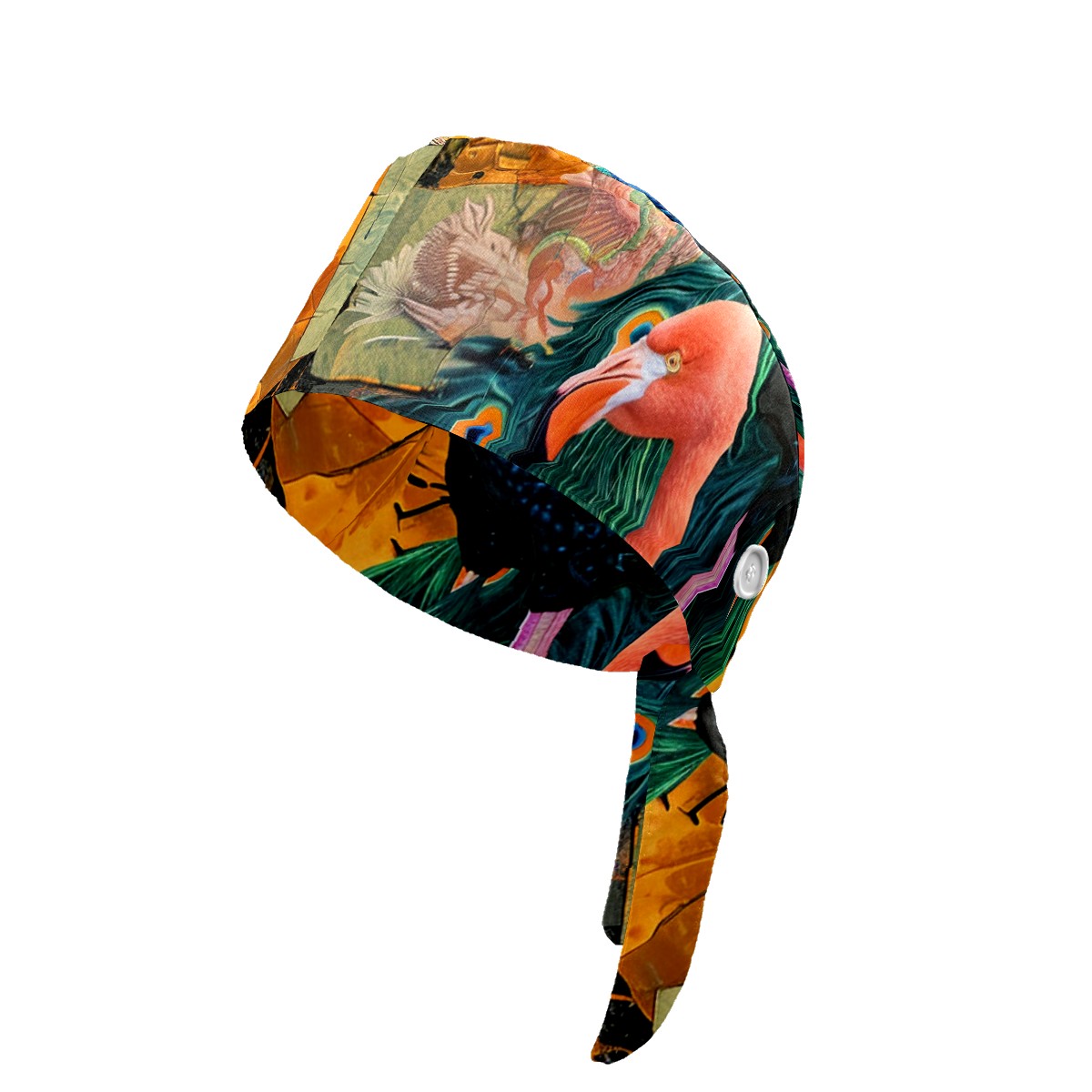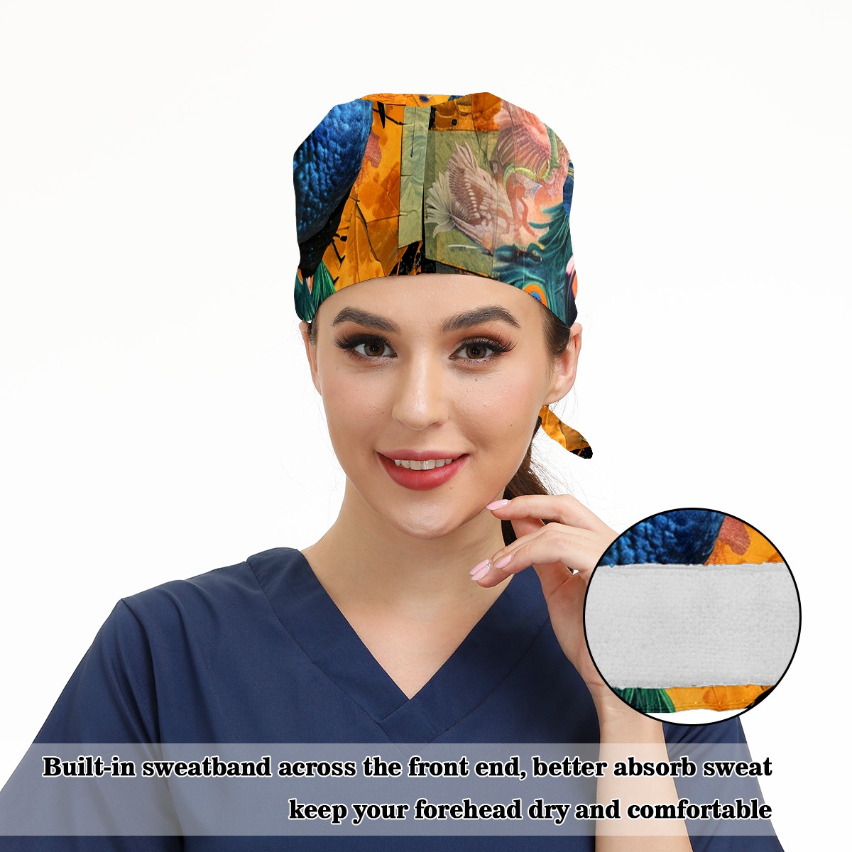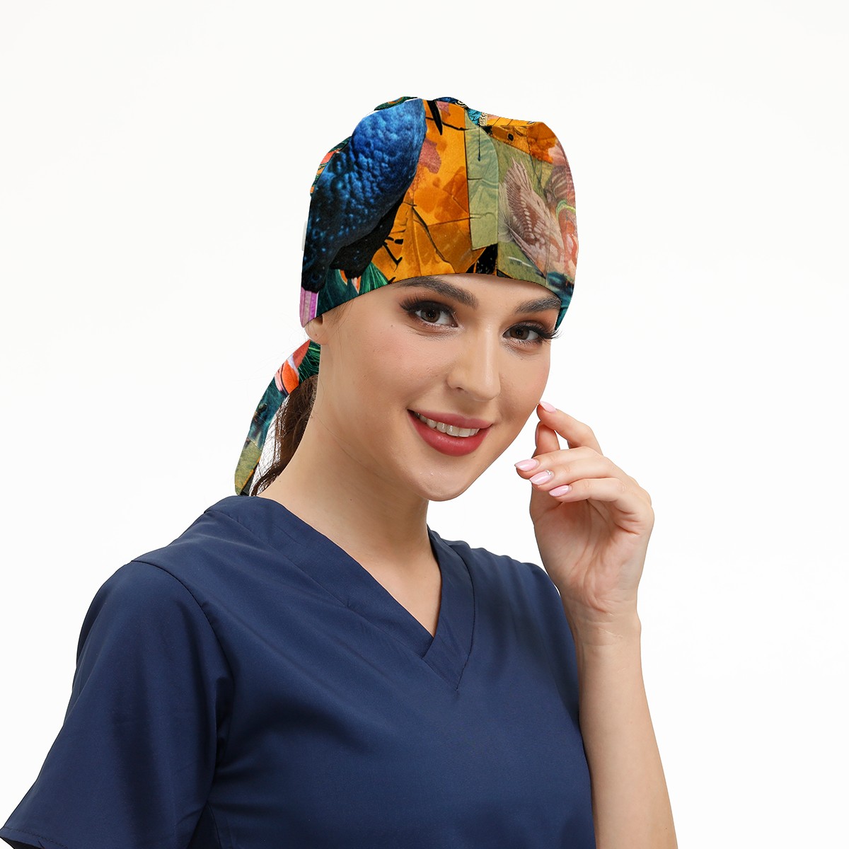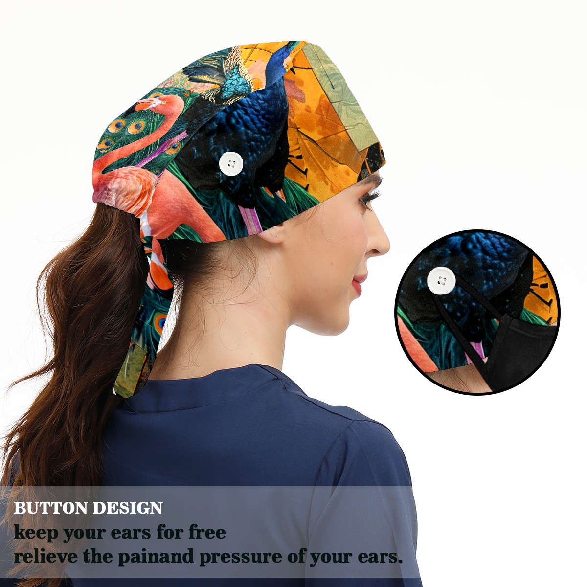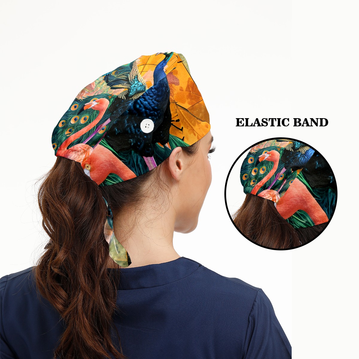 Working Caps with Button&Sweatband Satin Lined Cotton Adjustable Nurse Hats Elastic Band Scrub Cap Surgeon Hat Peacock