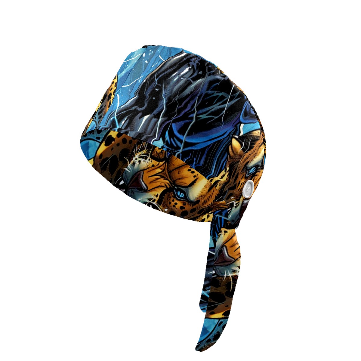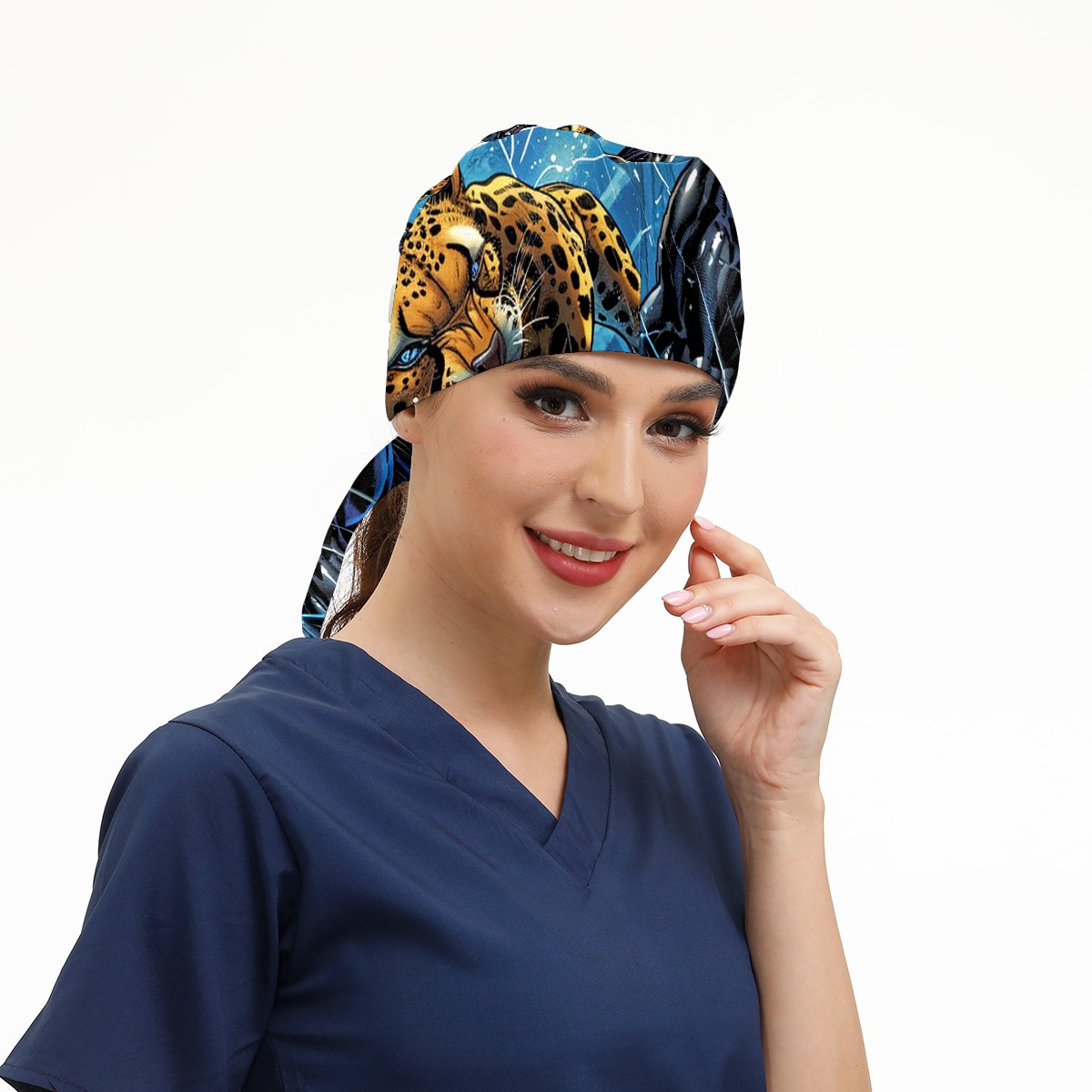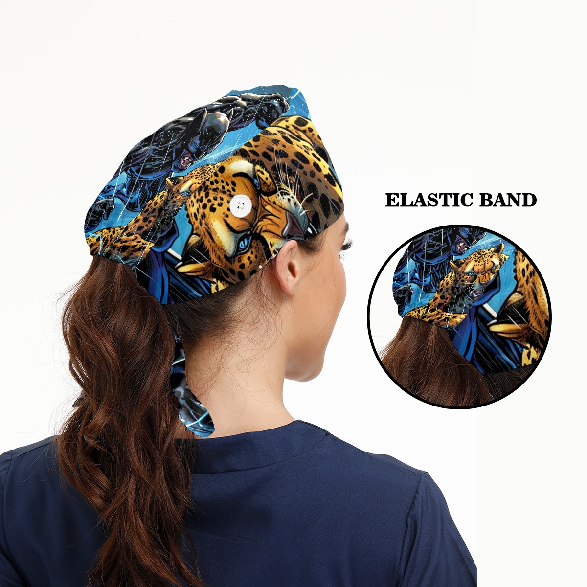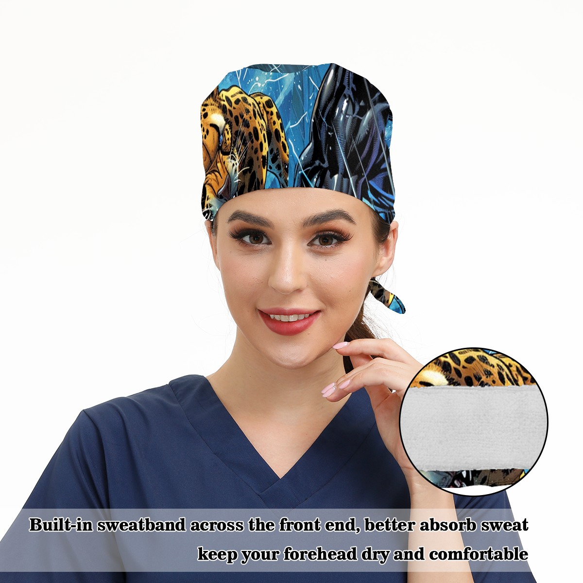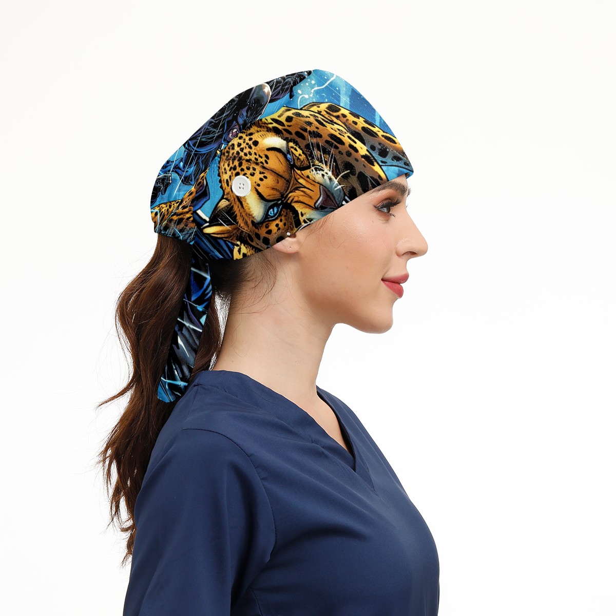 Working Caps with Button&Sweatband Satin Lined Cotton Adjustable Nurse Hats Elastic Band Scrub Cap Surgeon Hat Leopard