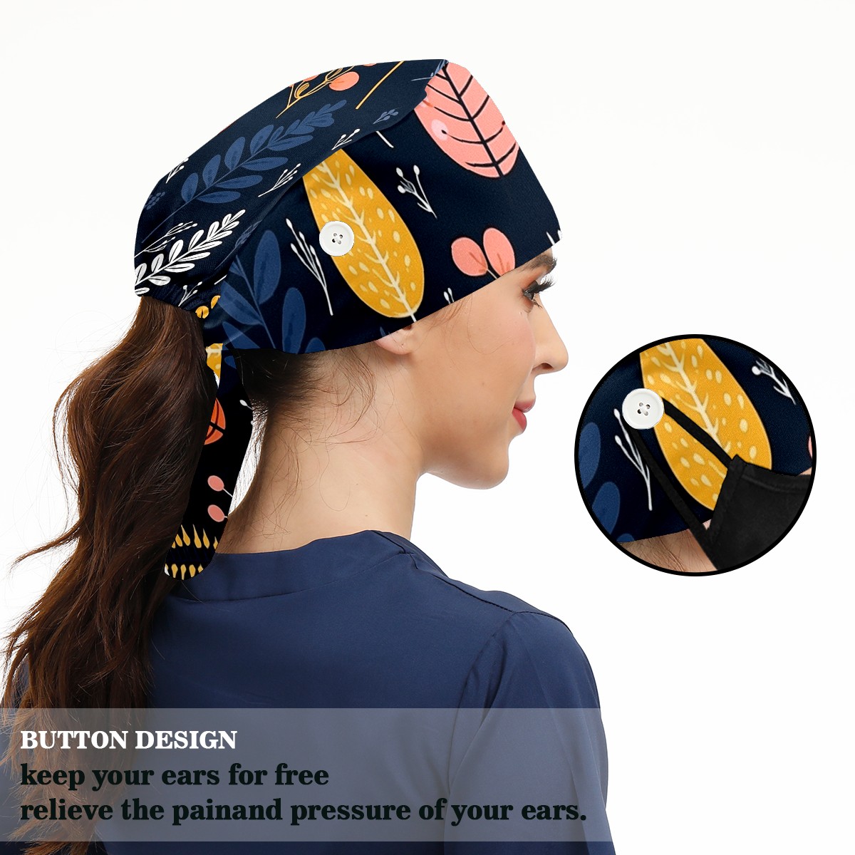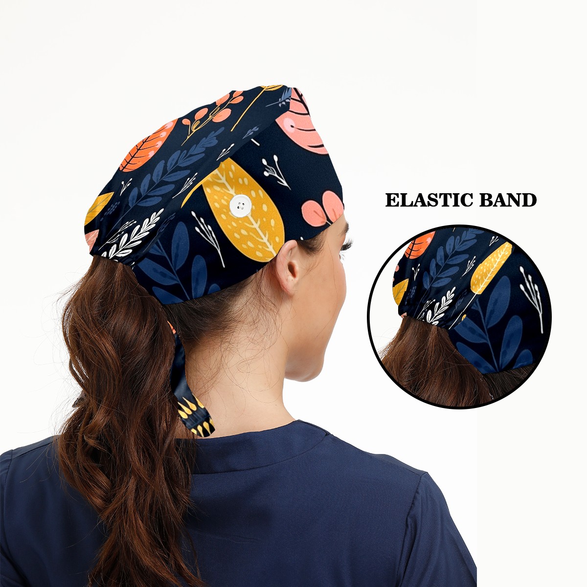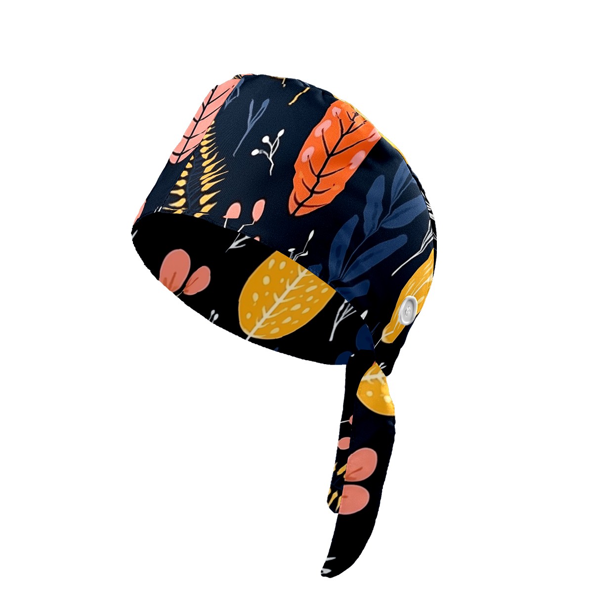Working Caps with Button&Sweatband Satin Lined Cotton Adjustable Nurse Hats Elastic Band Scrub Cap Surgeon Hat Vintage Plant Leaf