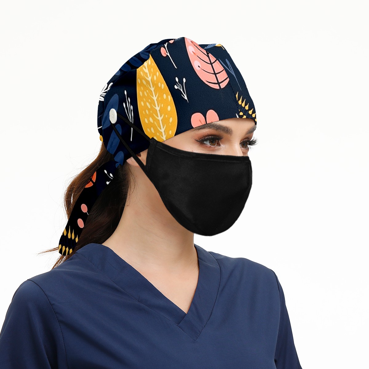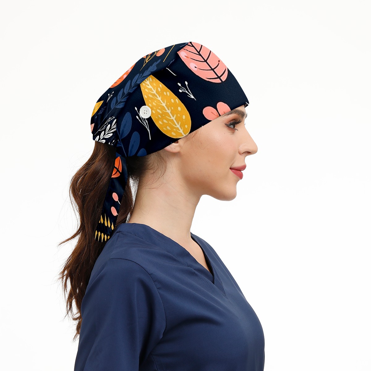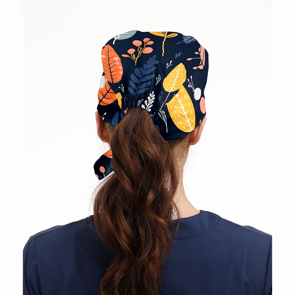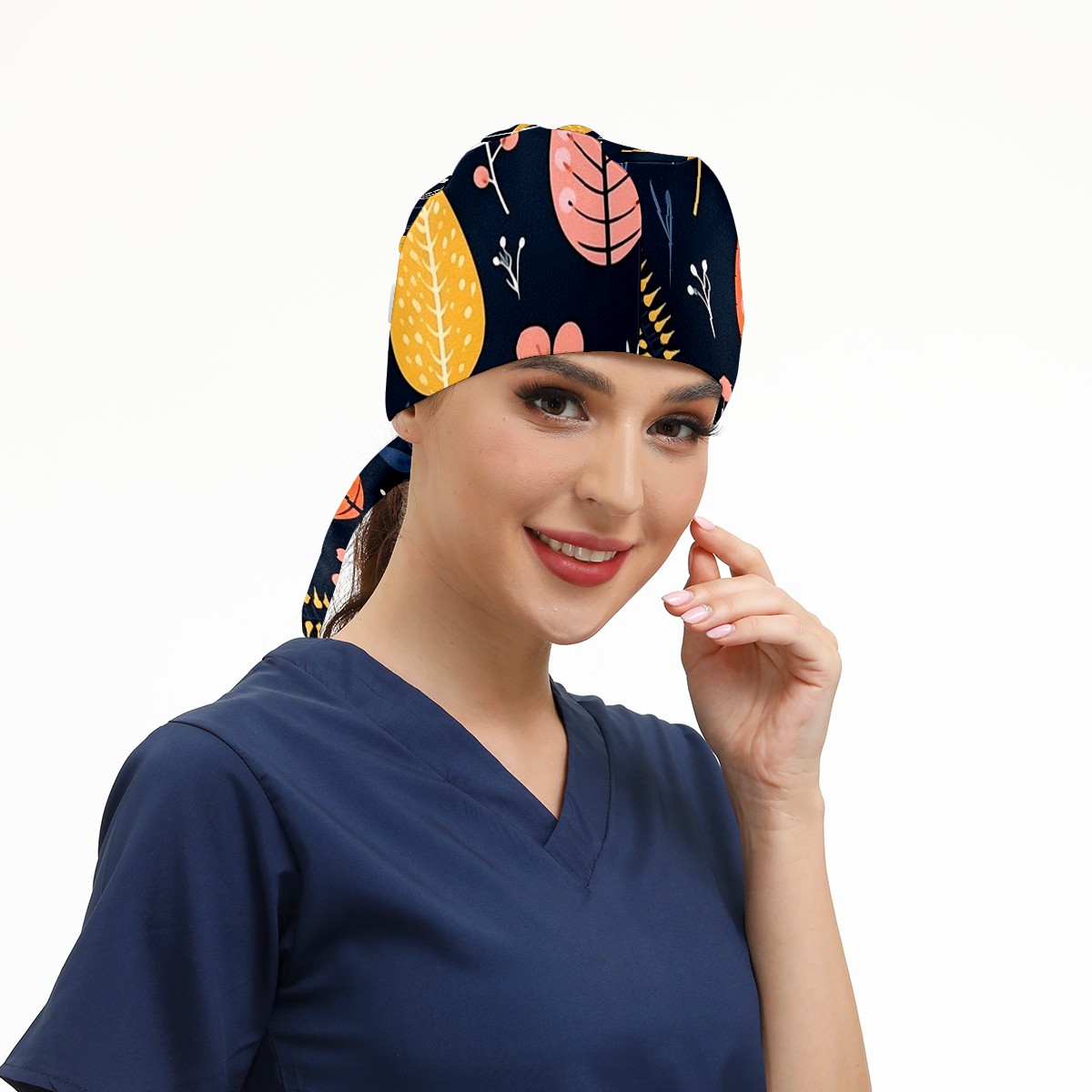 Working Caps with Button&Sweatband Satin Lined Cotton Adjustable Nurse Hats Elastic Band Scrub Cap Surgeon Hat Vintage Plant Leaf