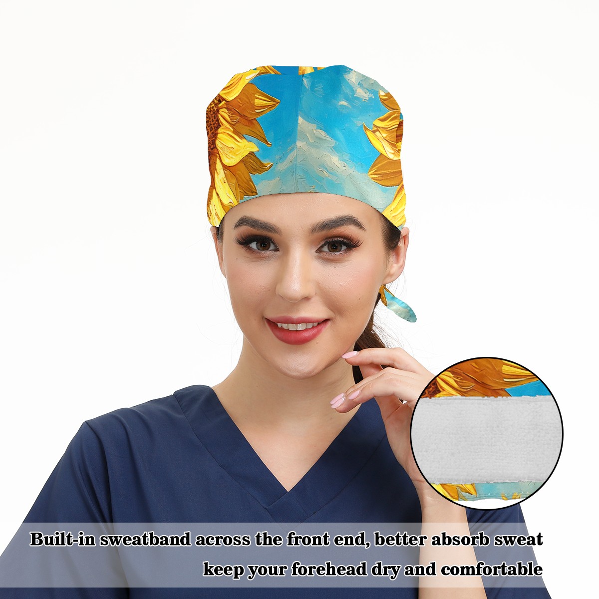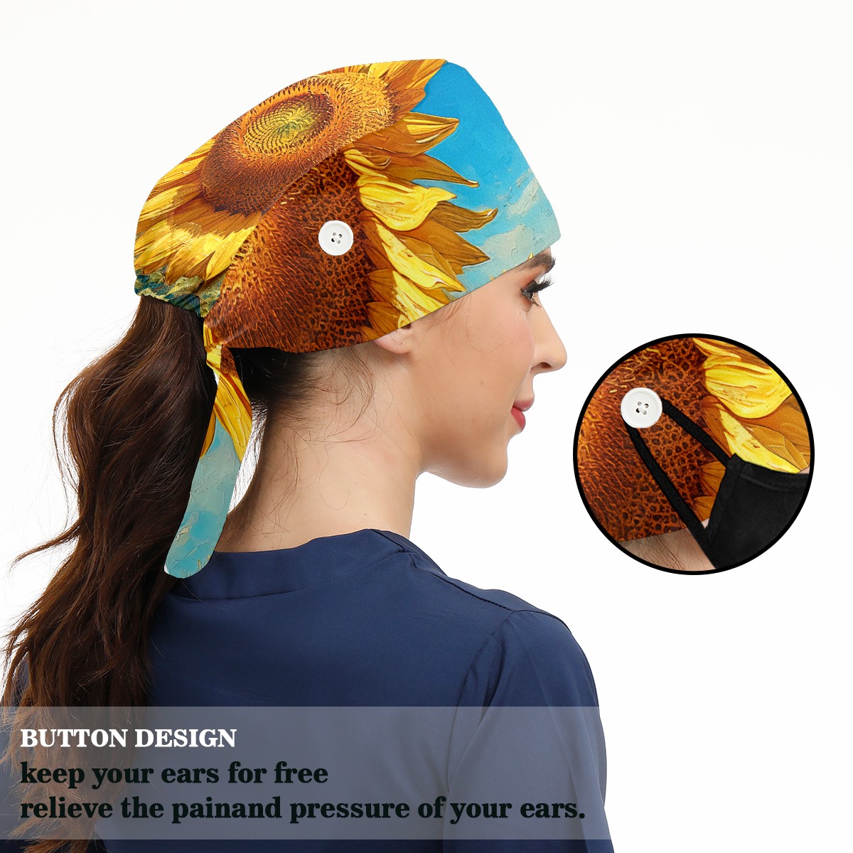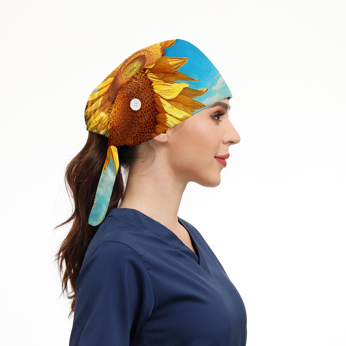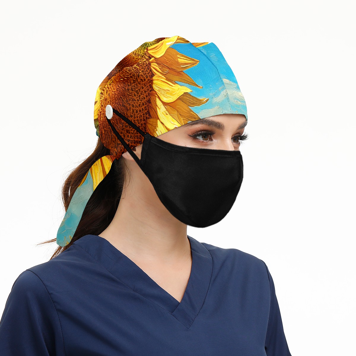 Working Caps with Button&Sweatband Satin Lined Cotton Adjustable Nurse Hats Elastic Band Scrub Cap Surgeon Hat Cute Bouquet C