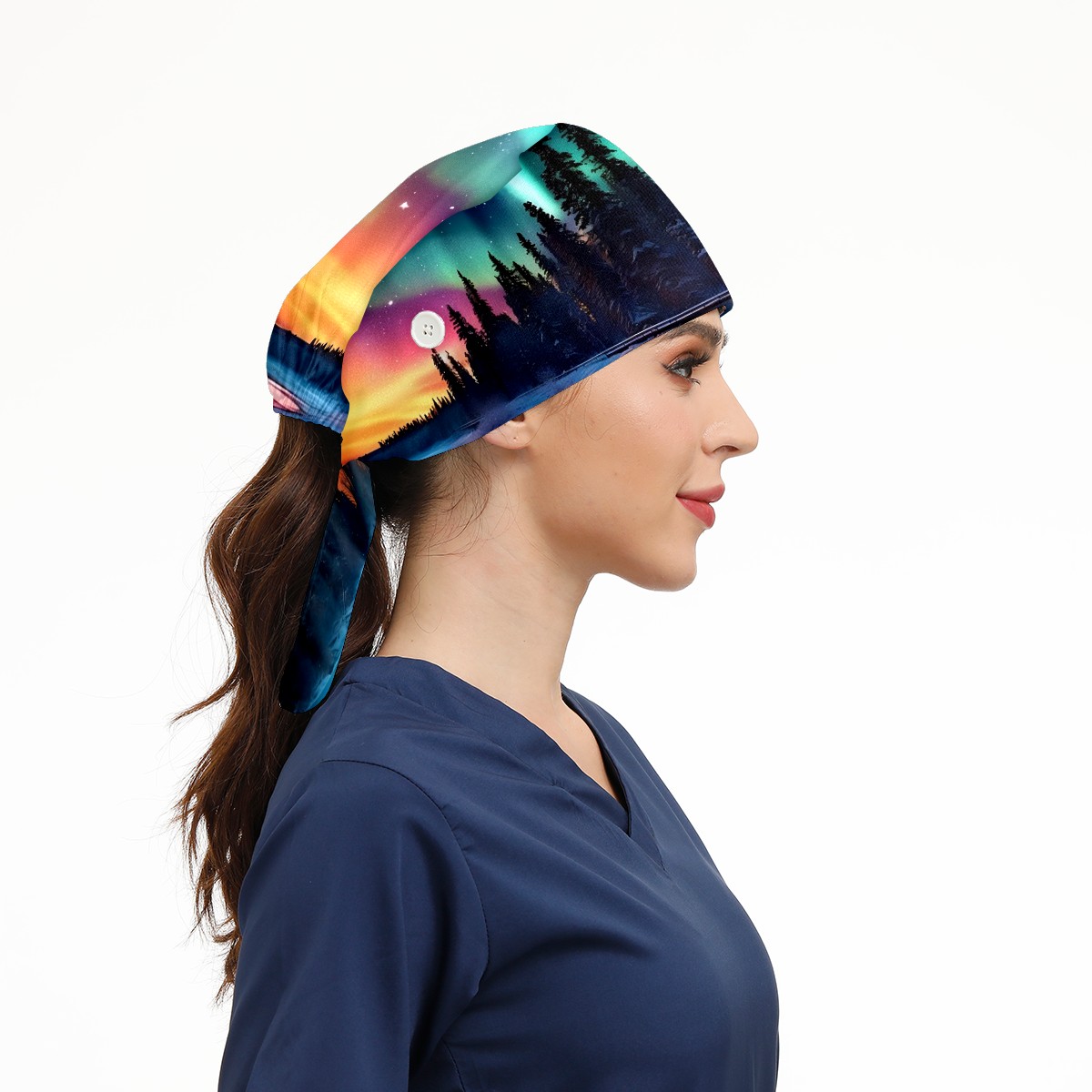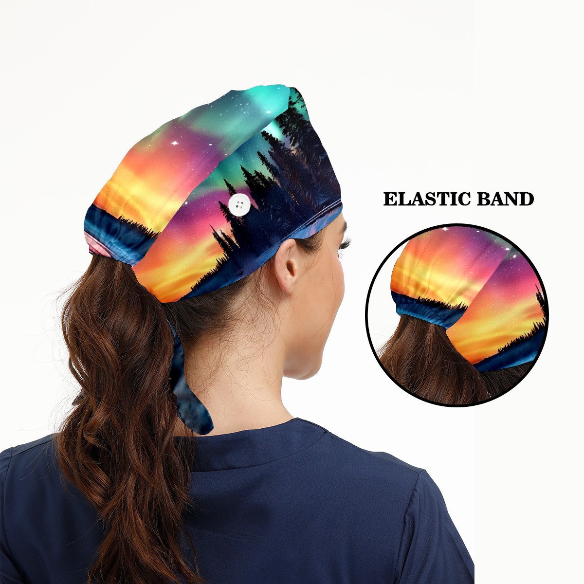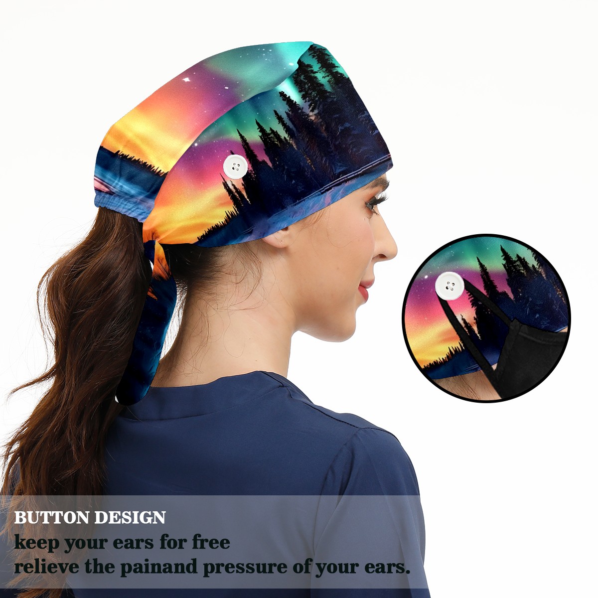 Working Caps with Button&Sweatband Satin Lined Cotton Adjustable Nurse Hats Elastic Band Scrub Cap Surgeon Hat Northern Light