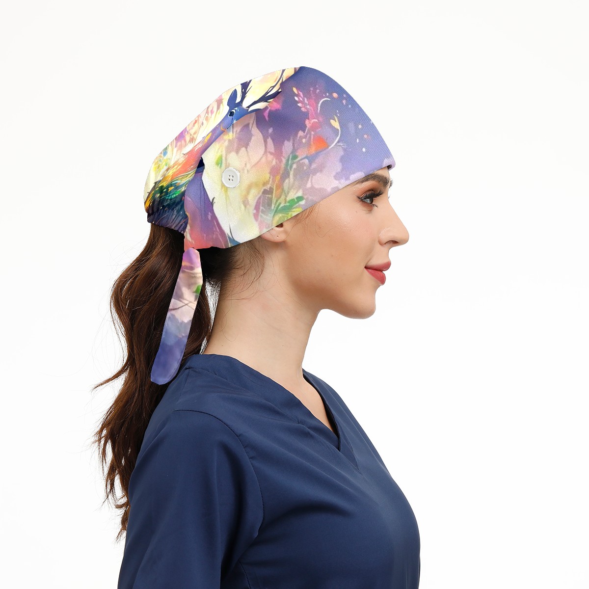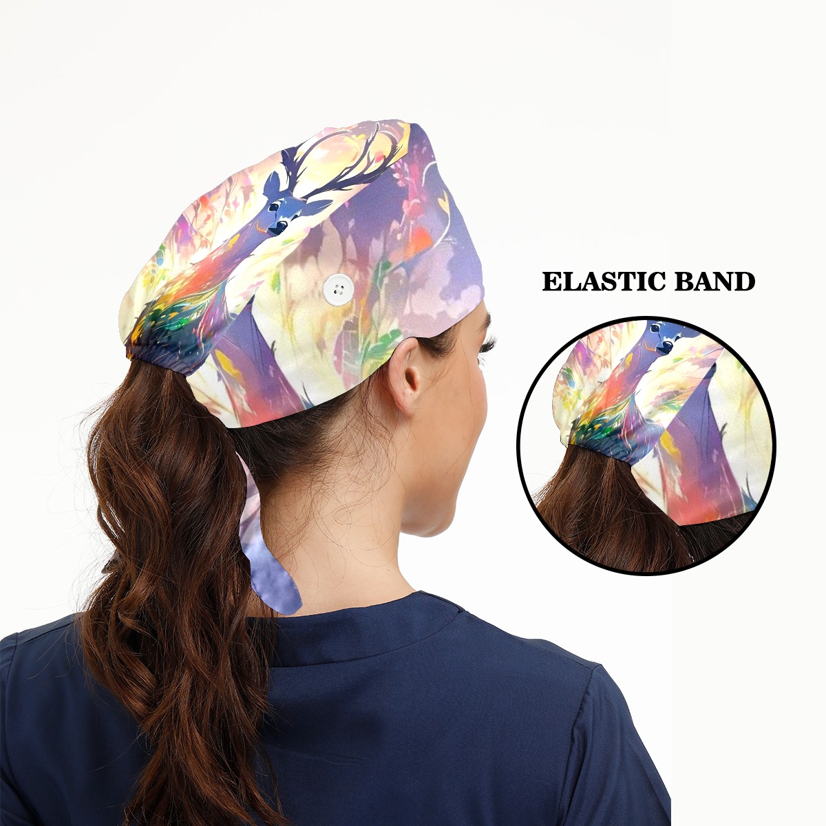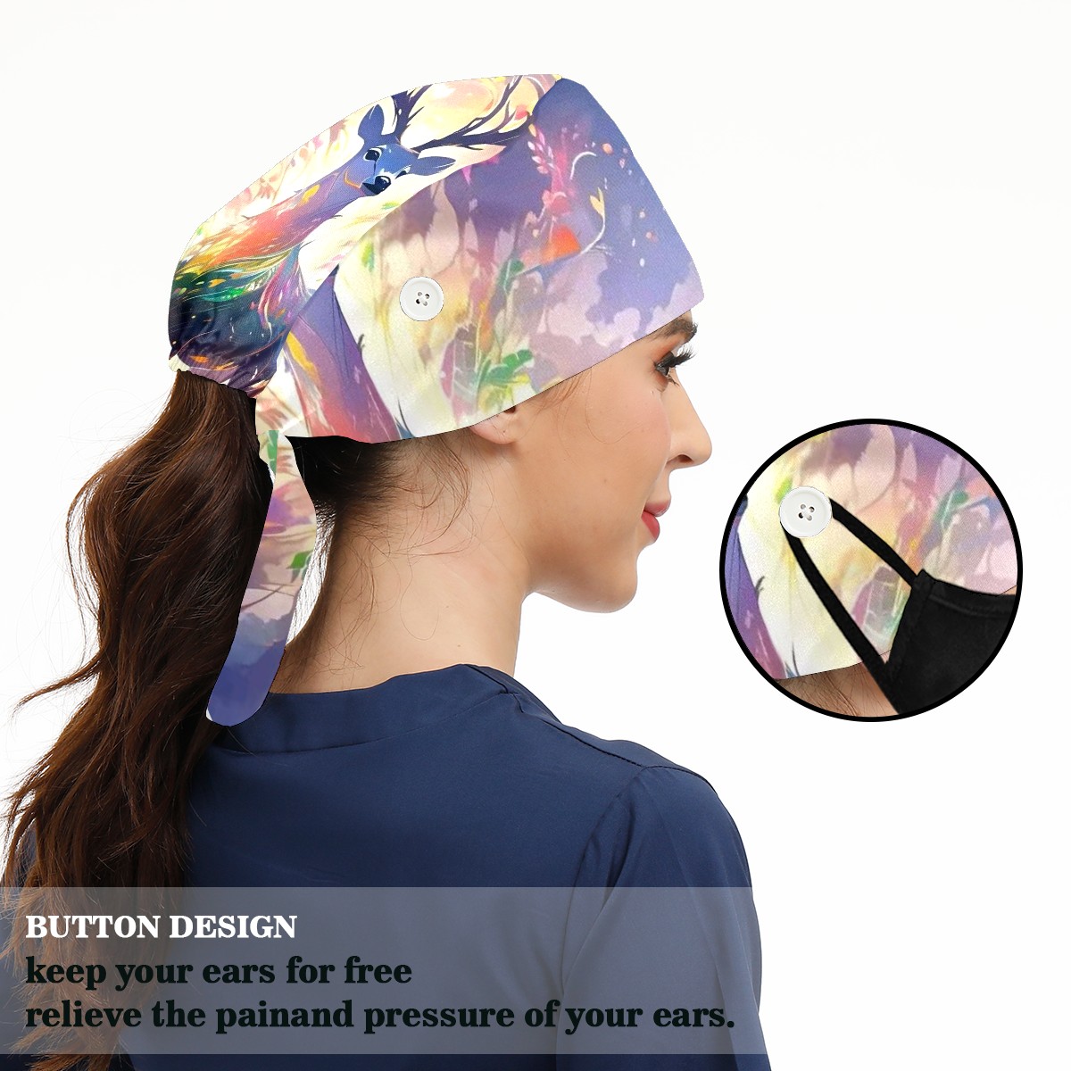 Working Caps with Button&Sweatband Satin Lined Cotton Adjustable Nurse Hats Elastic Band Scrub Cap Surgeon Hat Colorful Deer