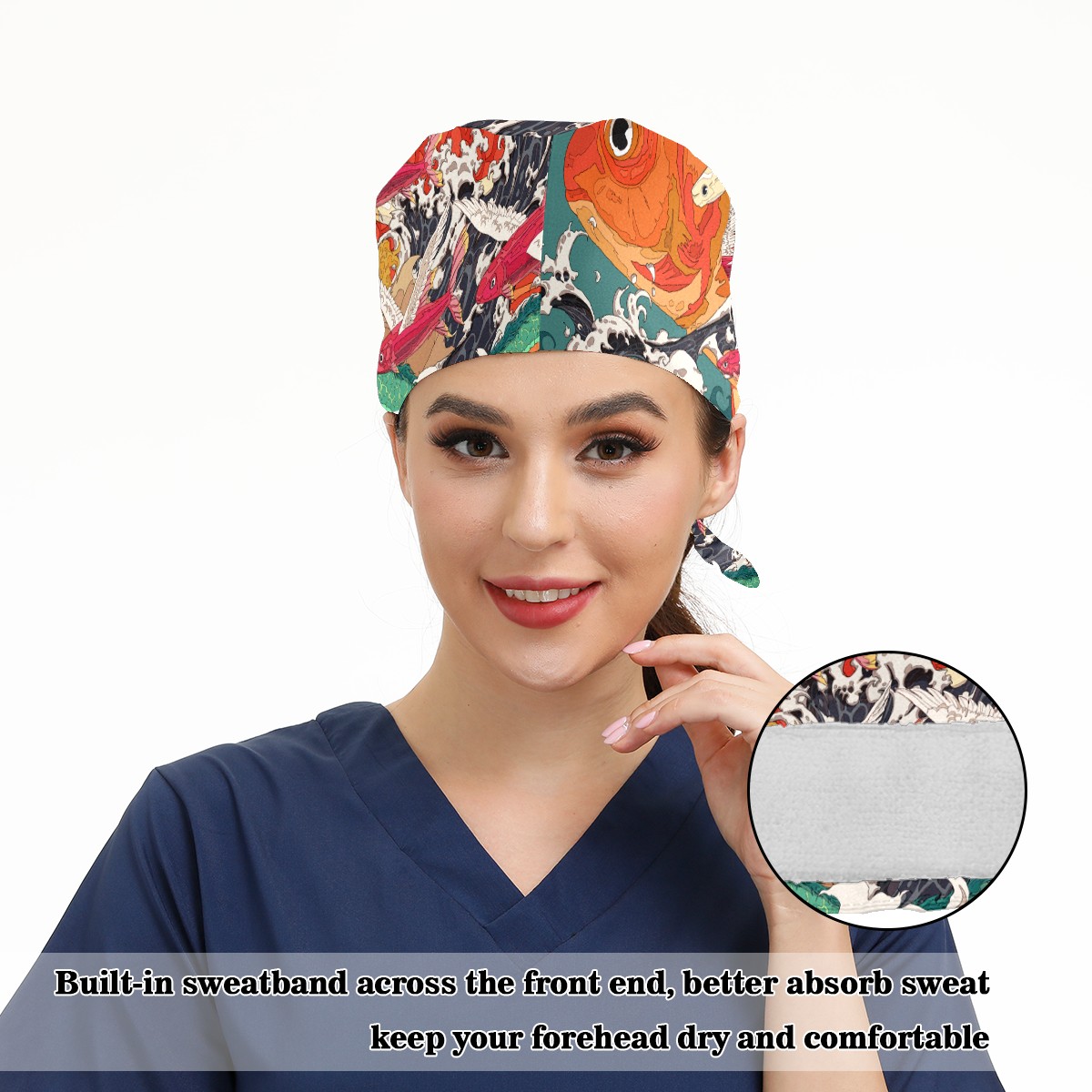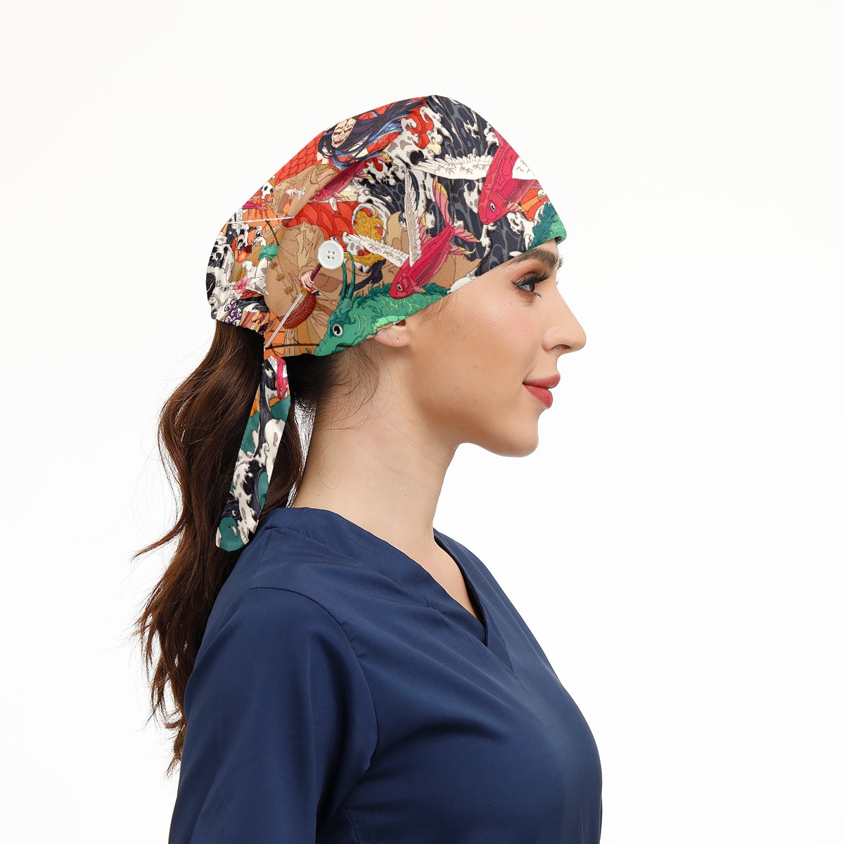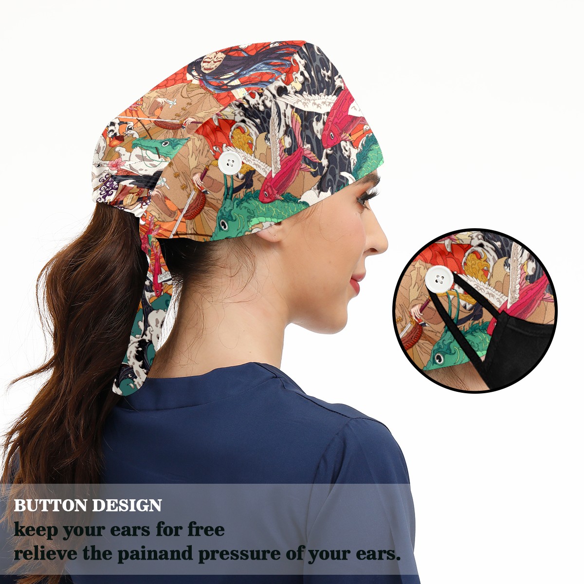 Working Caps with Button&Sweatband Satin Lined Cotton Adjustable Nurse Hats Elastic Band Scrub Cap Surgeon Hat Chinese Dragon Waves