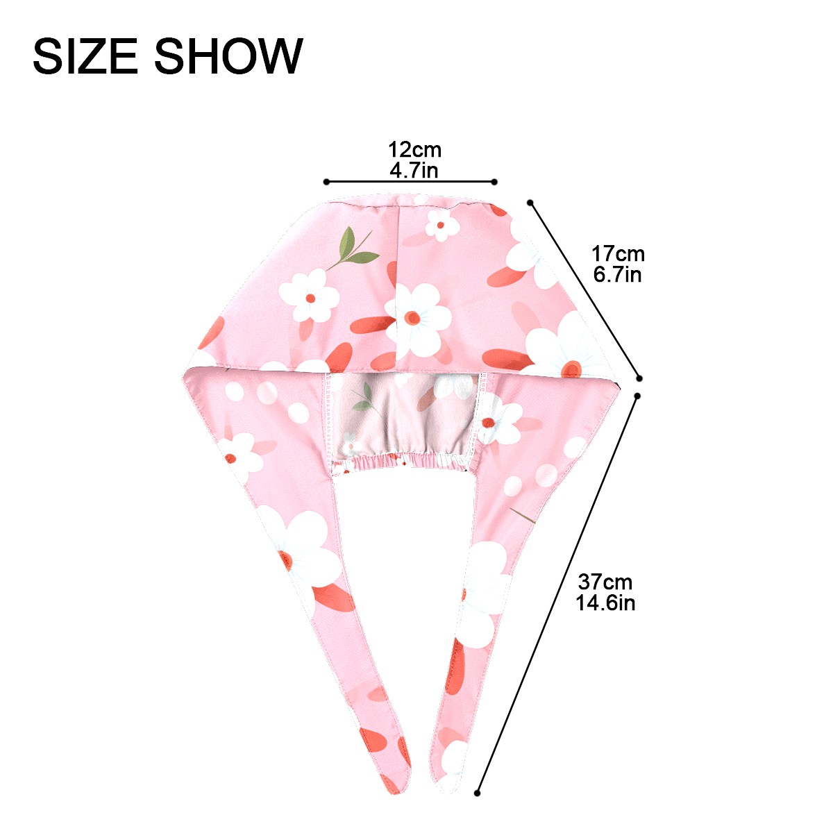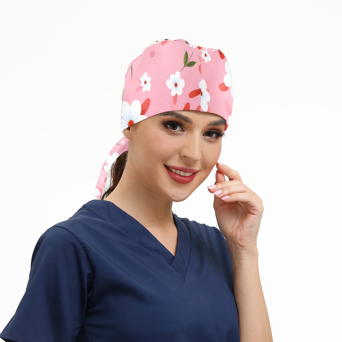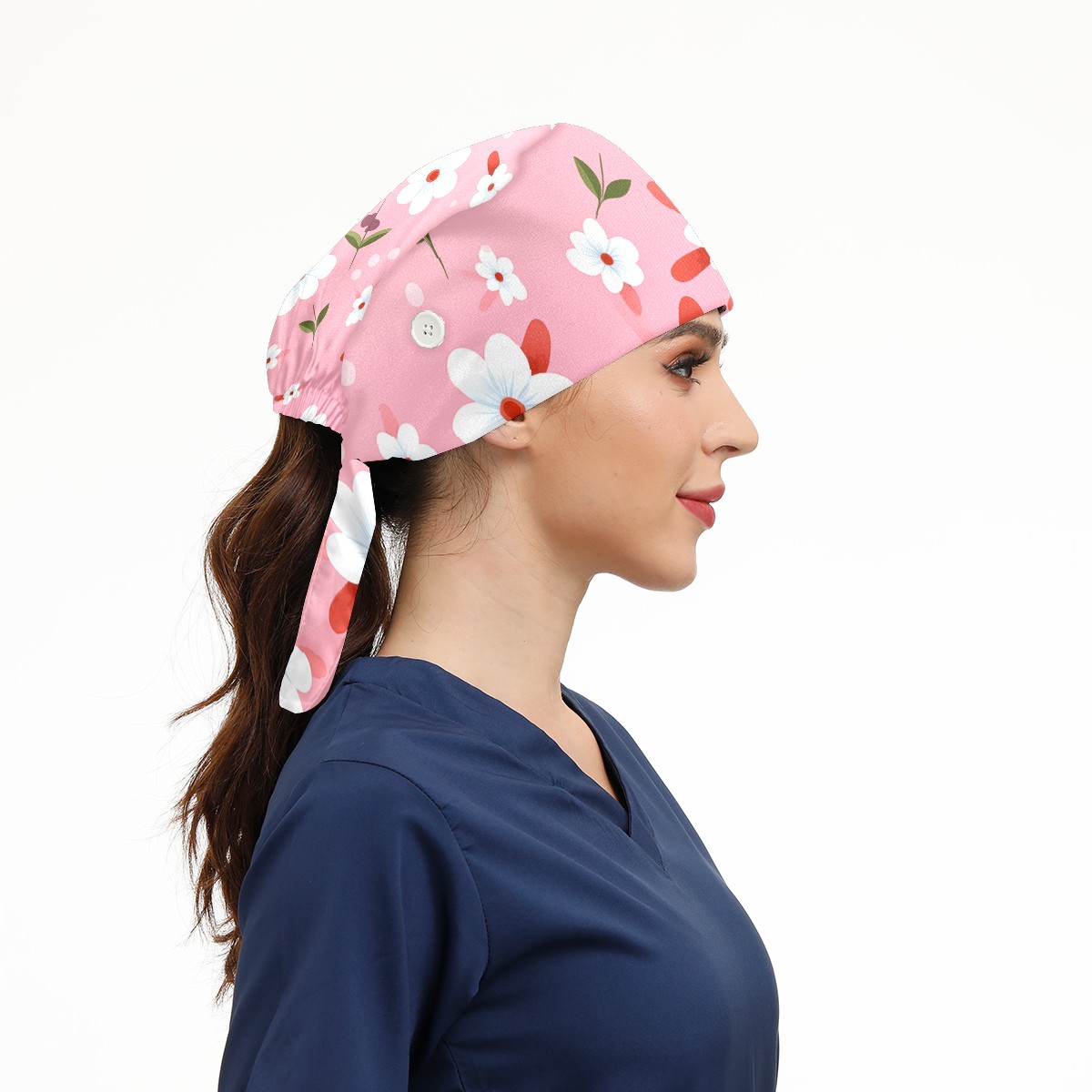 Working Caps with Button&Sweatband Satin Lined Cotton Adjustable Nurse Hats Elastic Band Scrub Cap Surgeon Hat Pink White Flowers