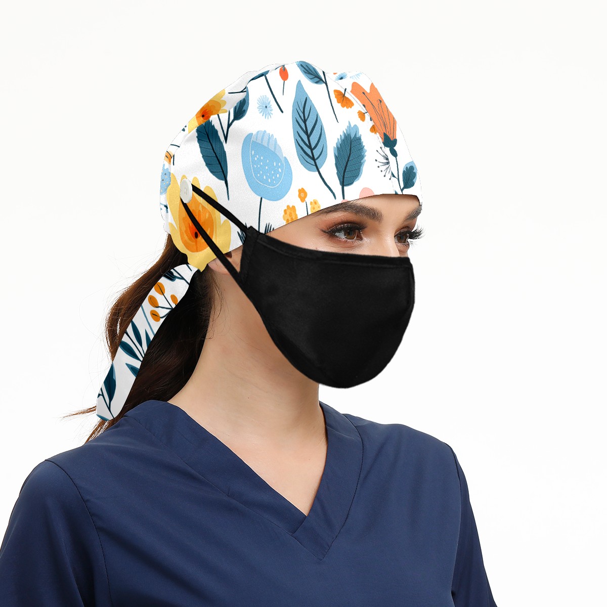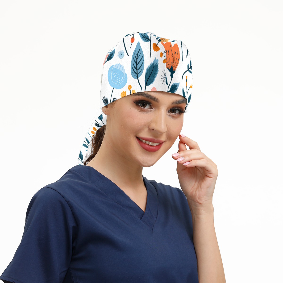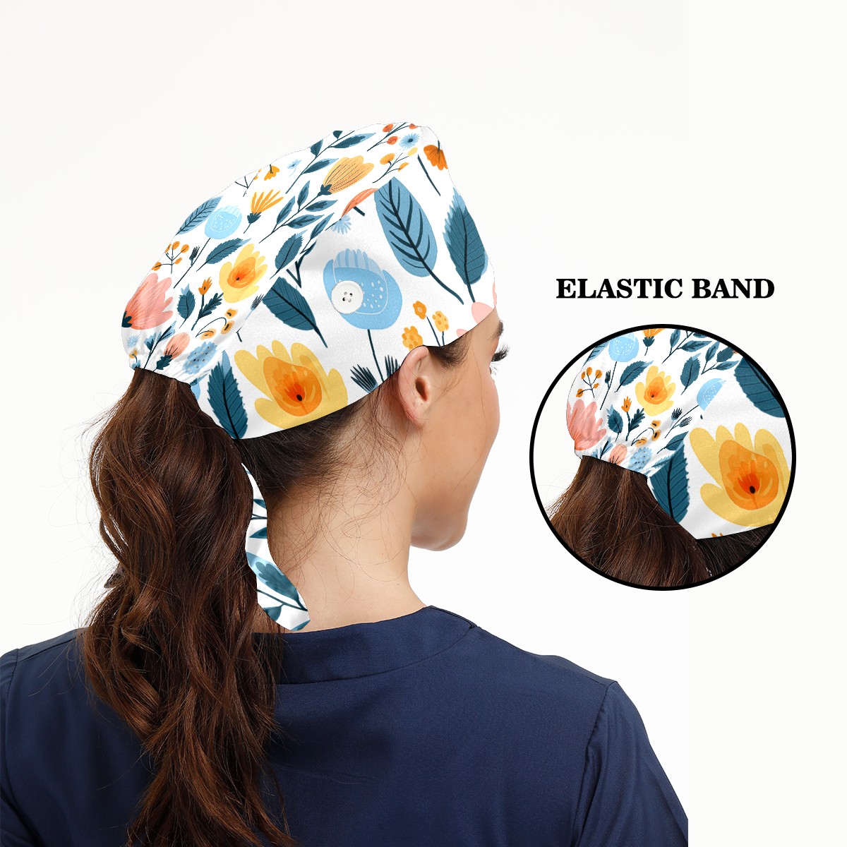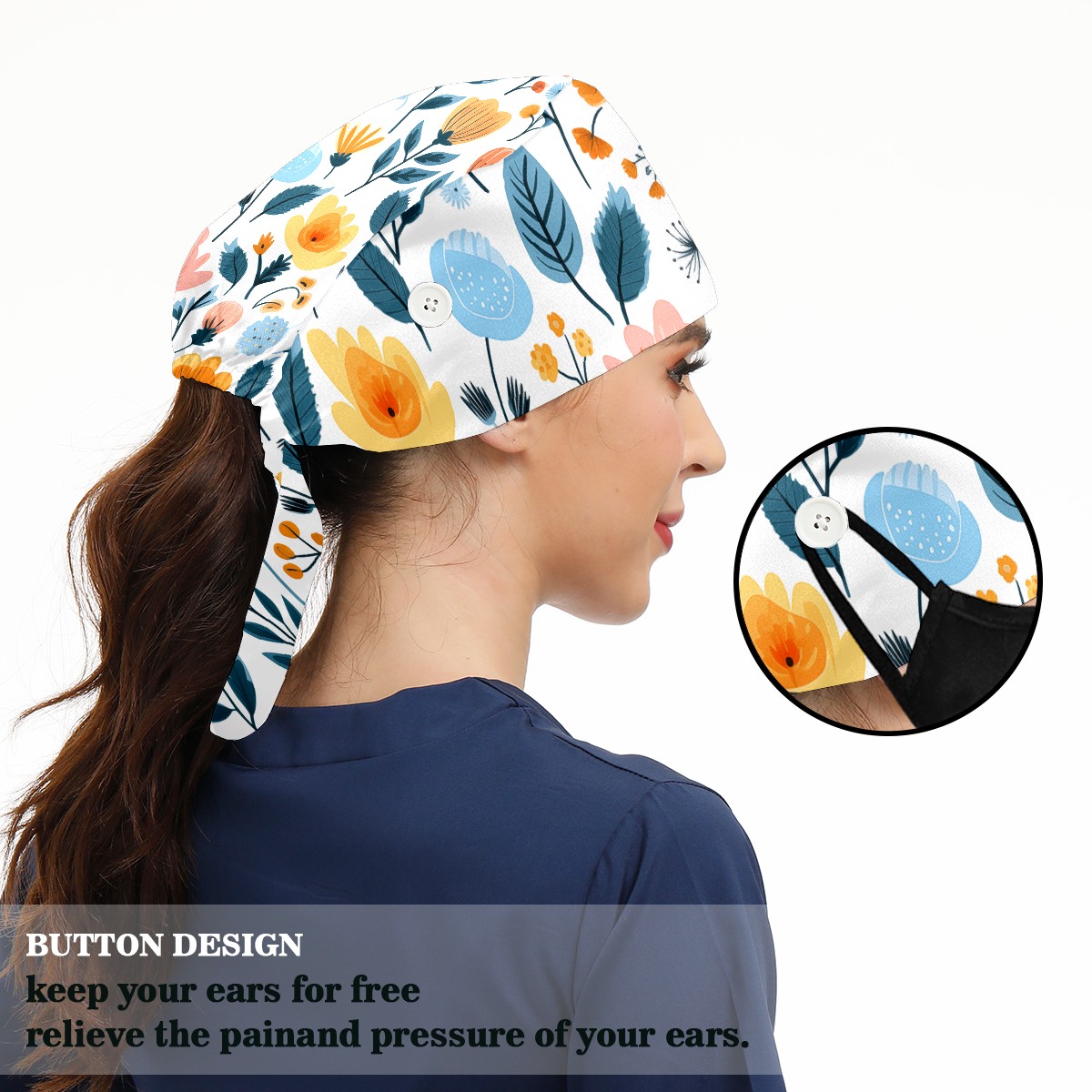 Working Caps with Button&Sweatband Satin Lined Cotton Adjustable Nurse Hats Elastic Band Scrub Cap Surgeon Hat Colorful Flowers