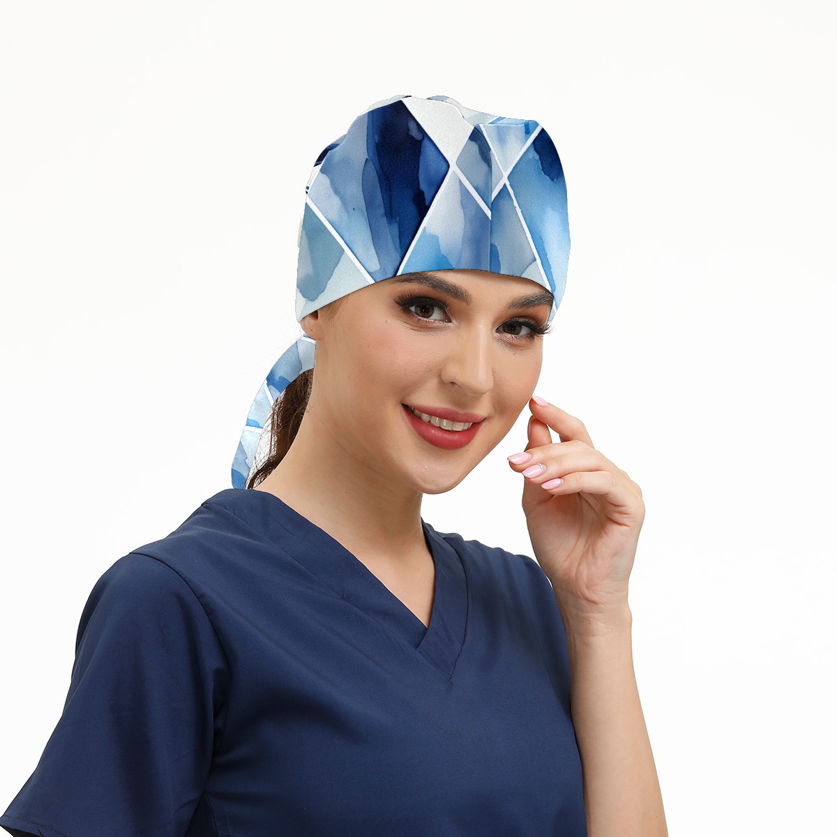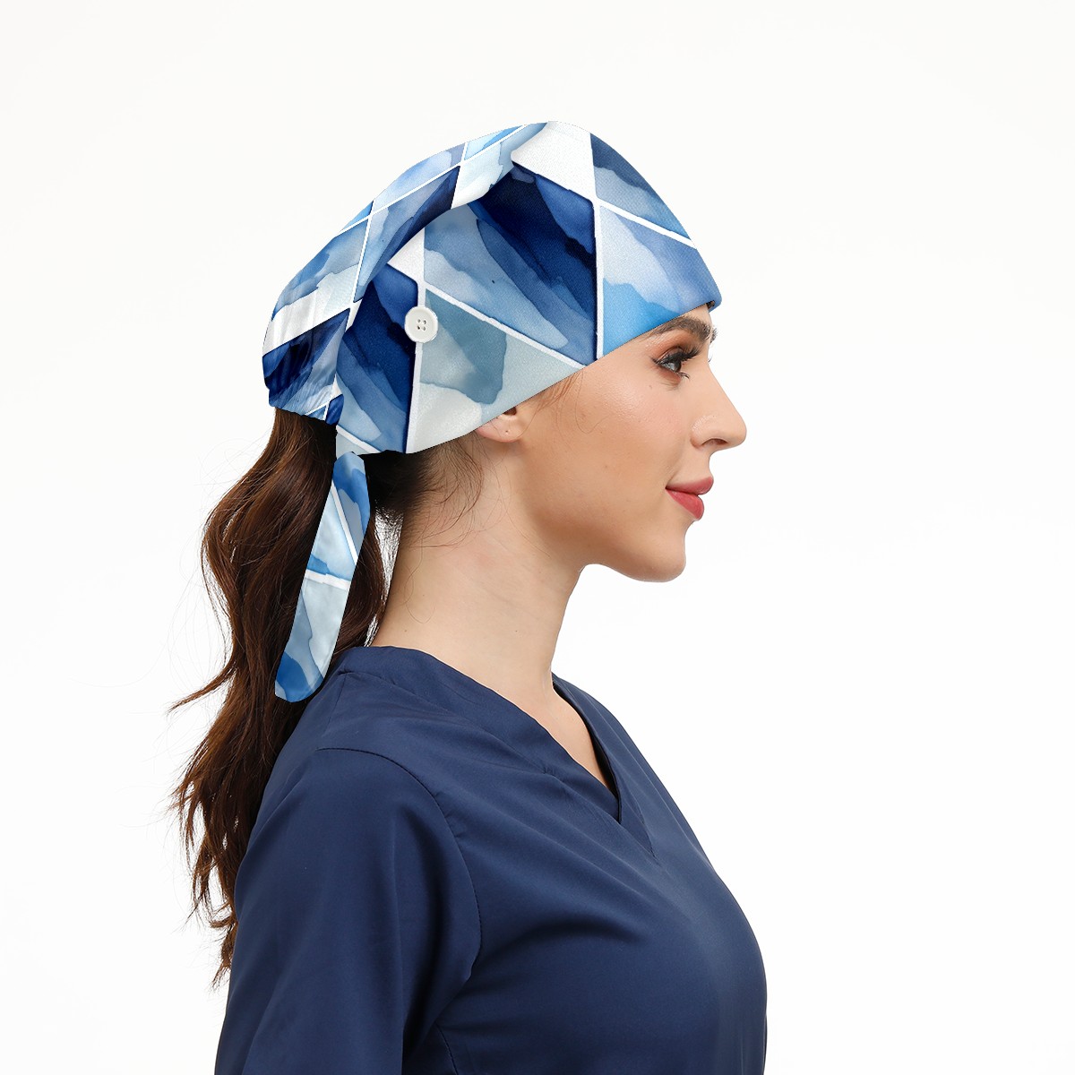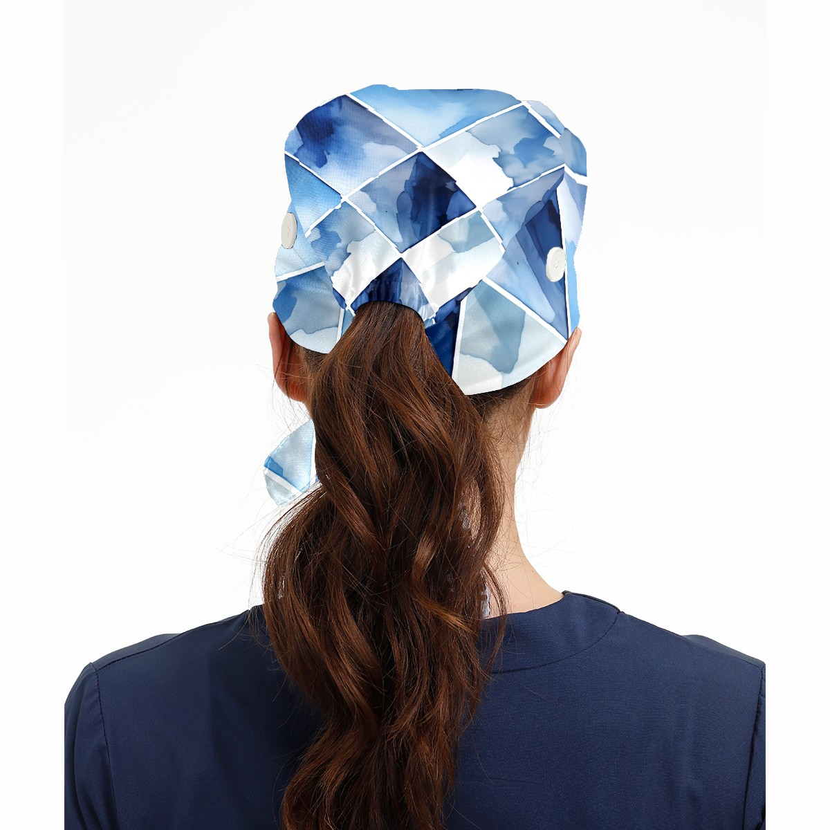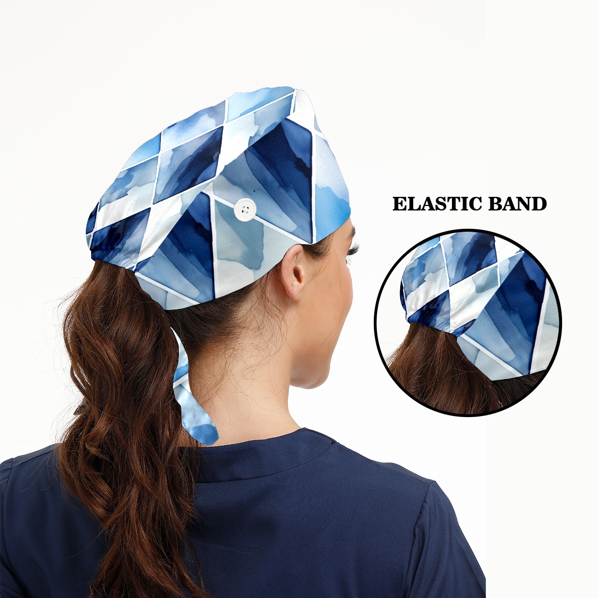 Working Caps with Button&Sweatband Satin Lined Cotton Adjustable Nurse Hats Elastic Band Scrub Cap Surgeon Hat Blue Watercolor Rhombus