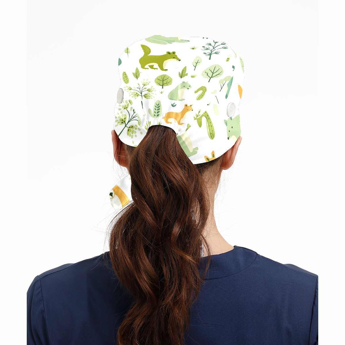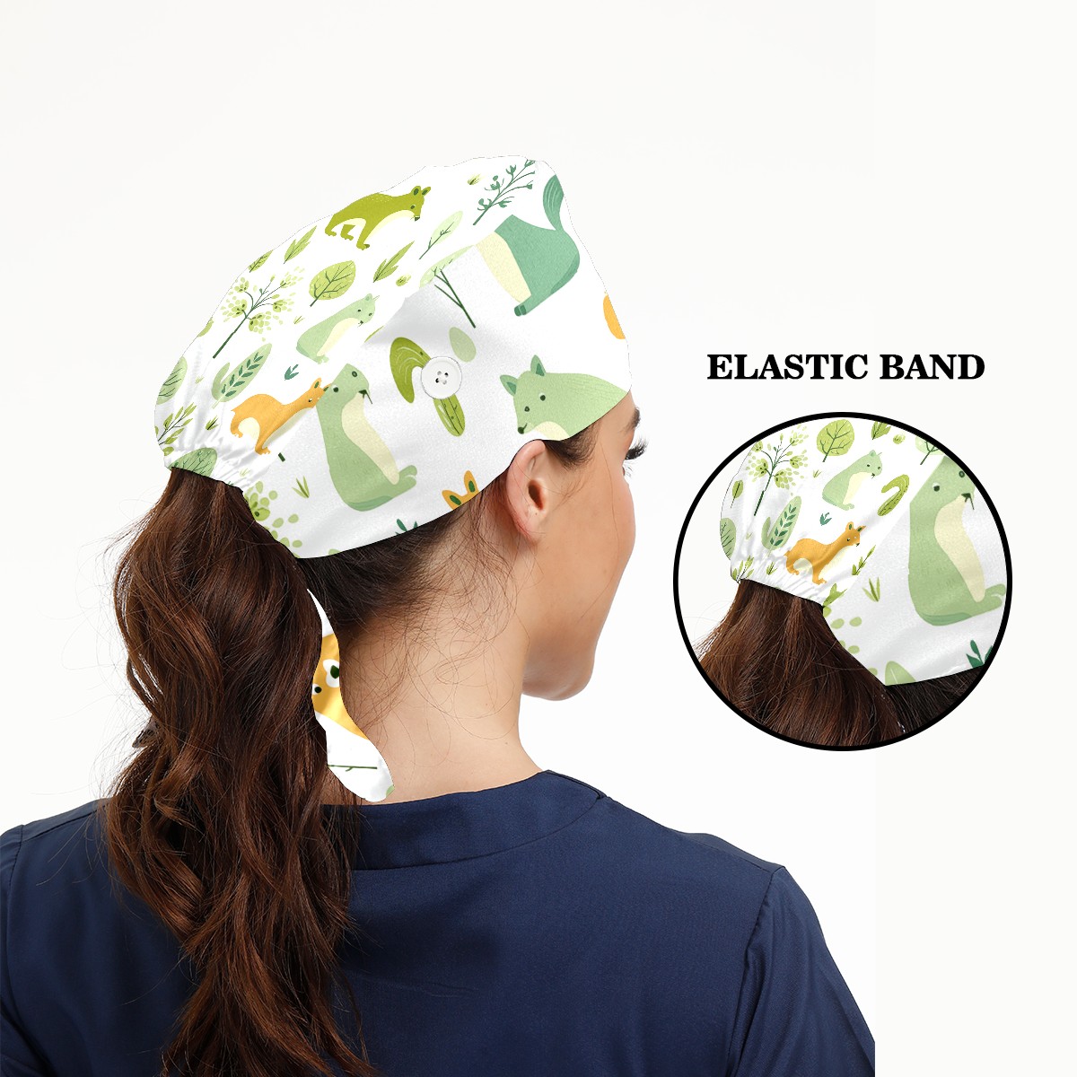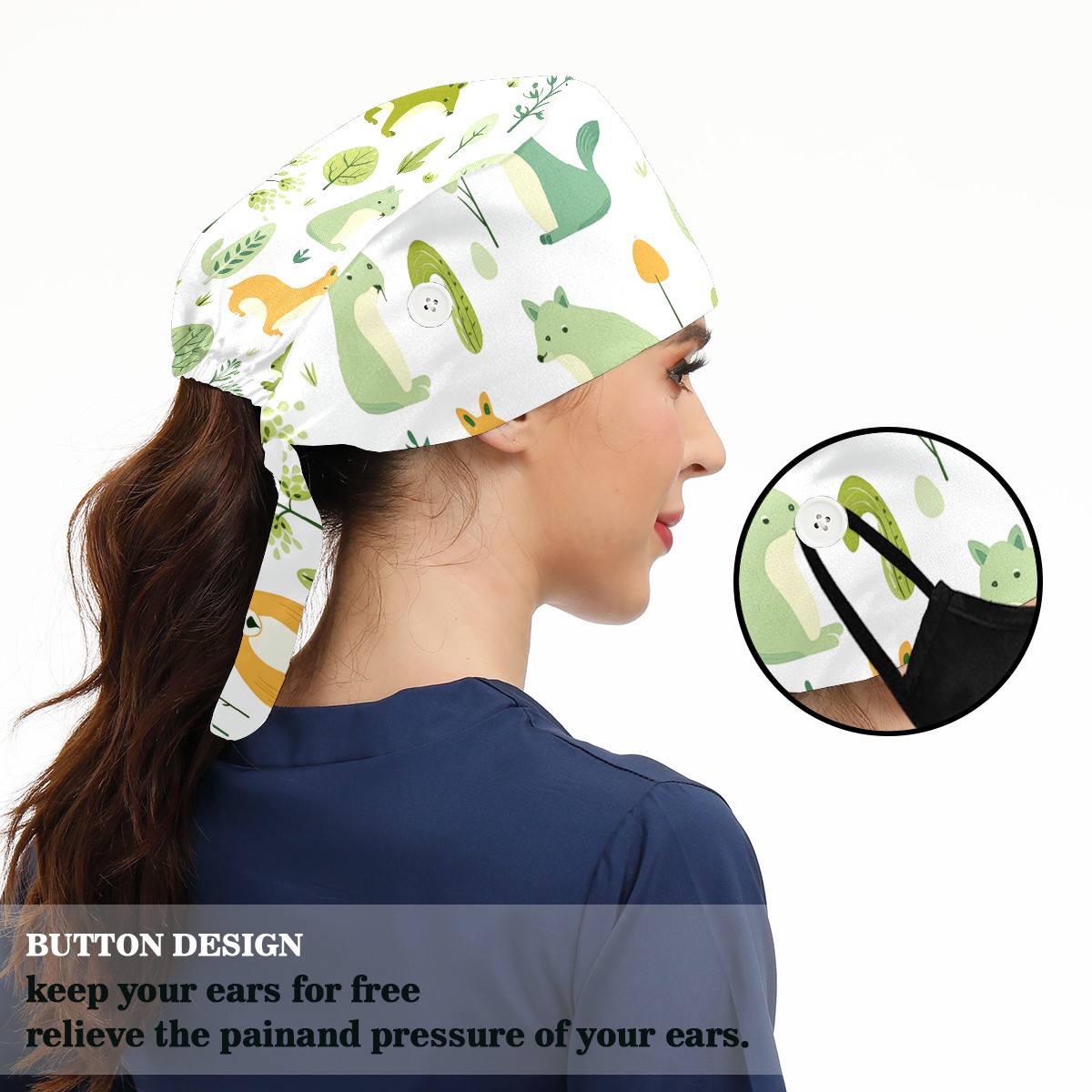 Working Caps with Button&Sweatband Satin Lined Cotton Adjustable Nurse Hats Elastic Band Scrub Cap Surgeon Hat Green Plants Animals