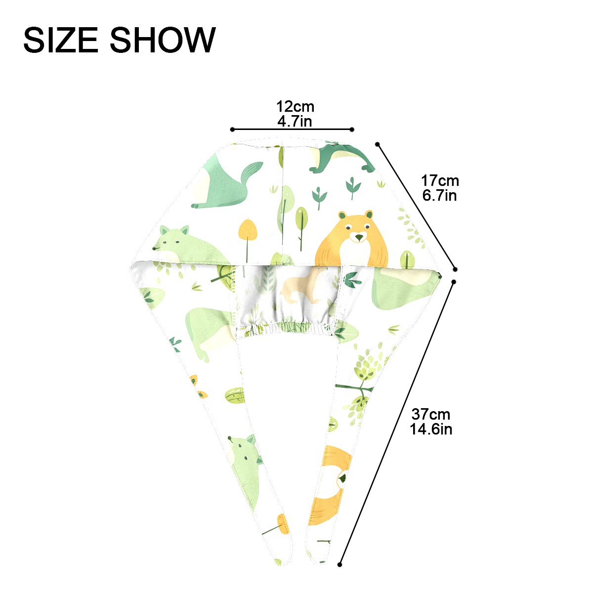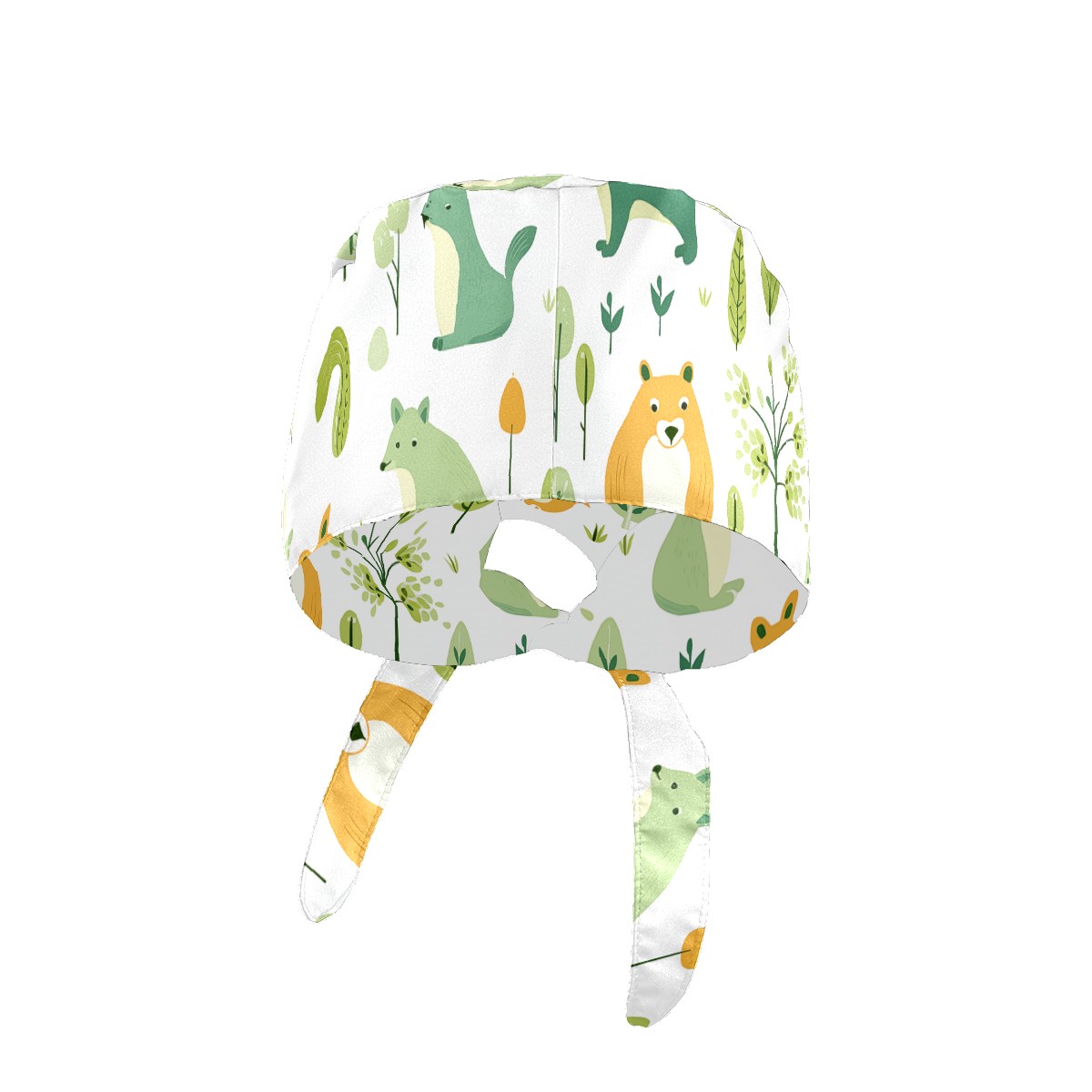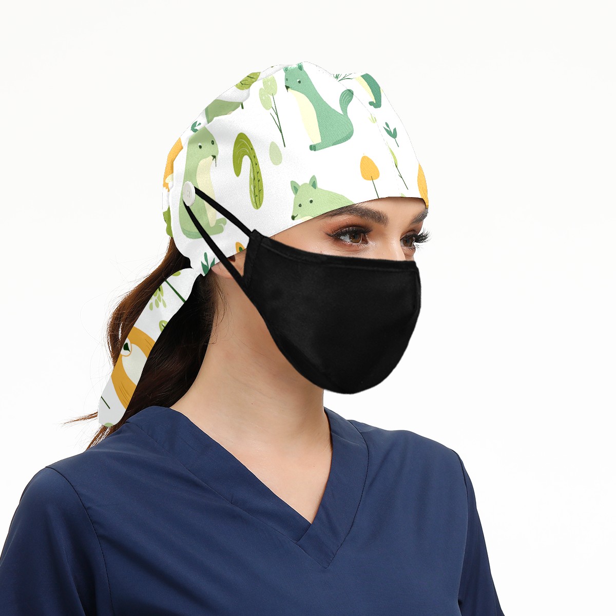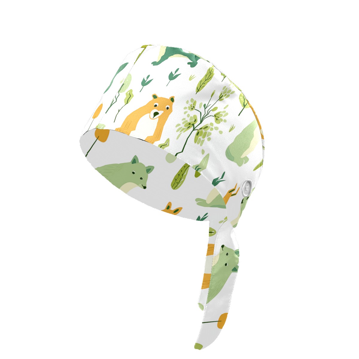 Working Caps with Button&Sweatband Satin Lined Cotton Adjustable Nurse Hats Elastic Band Scrub Cap Surgeon Hat Green Plants Animals