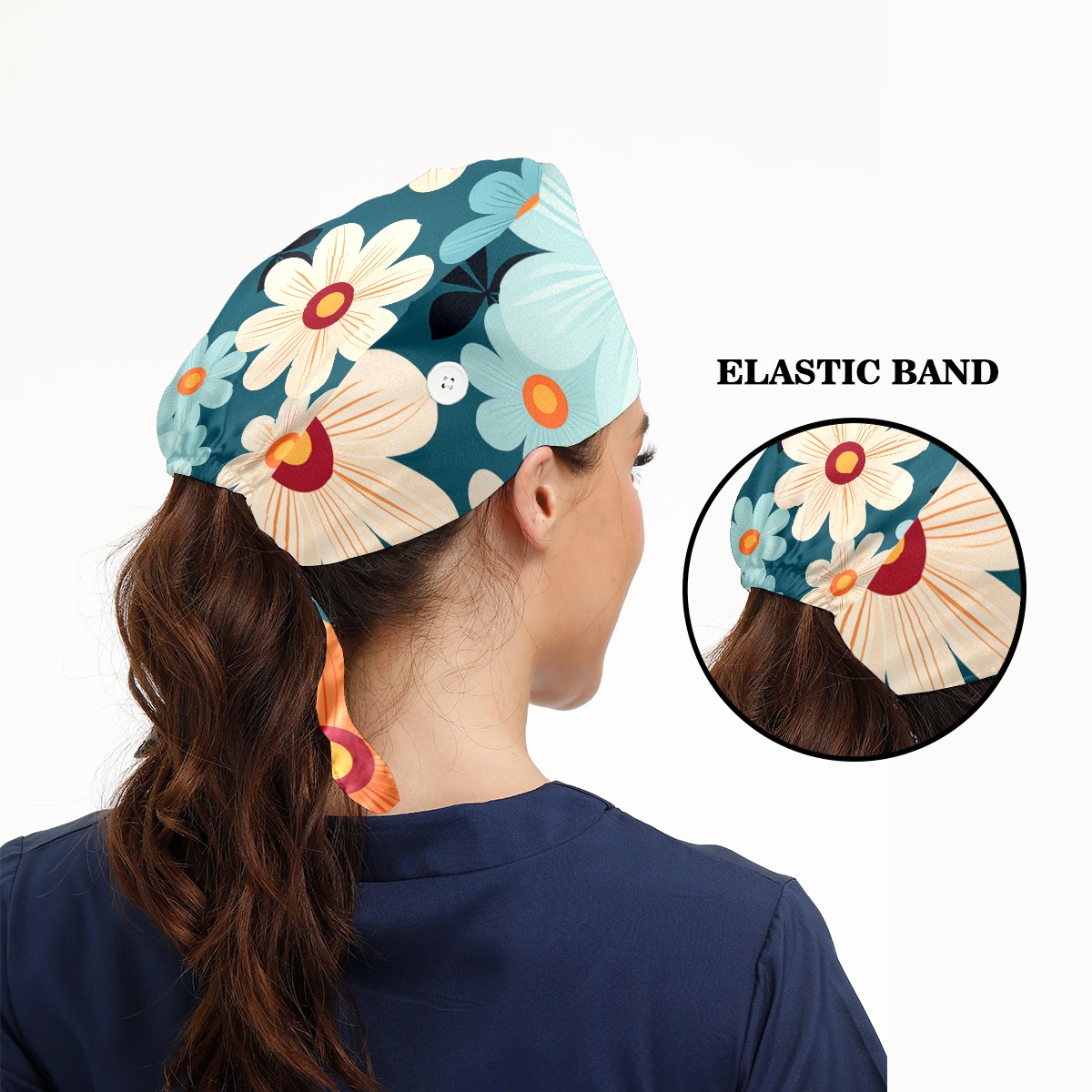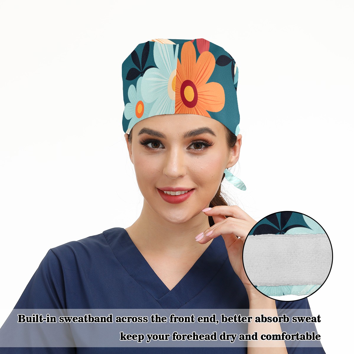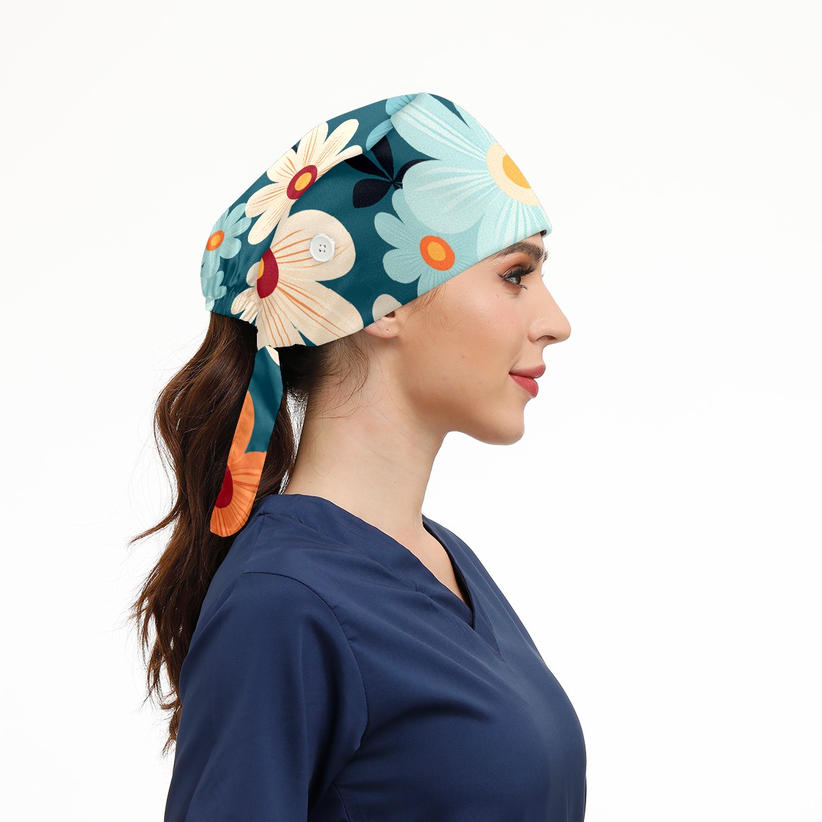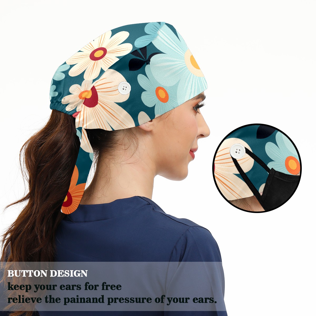 Working Caps with Button&Sweatband Satin Lined Cotton Adjustable Nurse Hats Elastic Band Scrub Cap Surgeon Hat Colorful Flowers