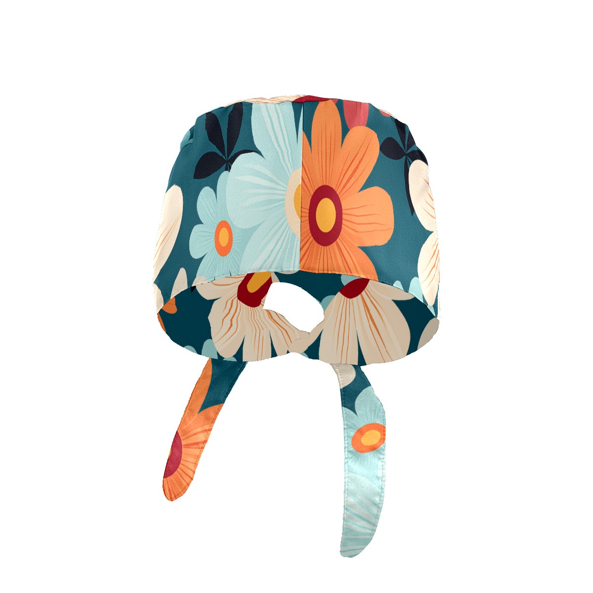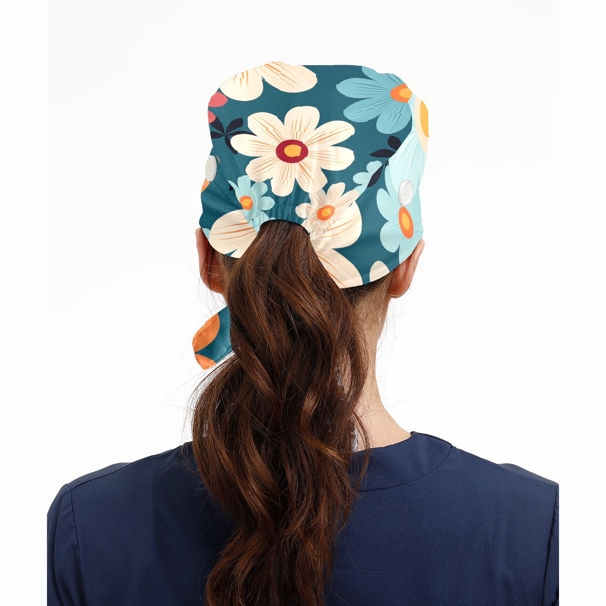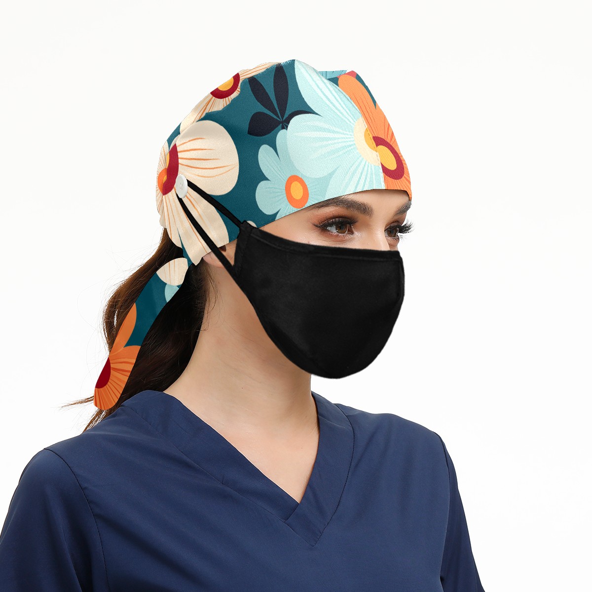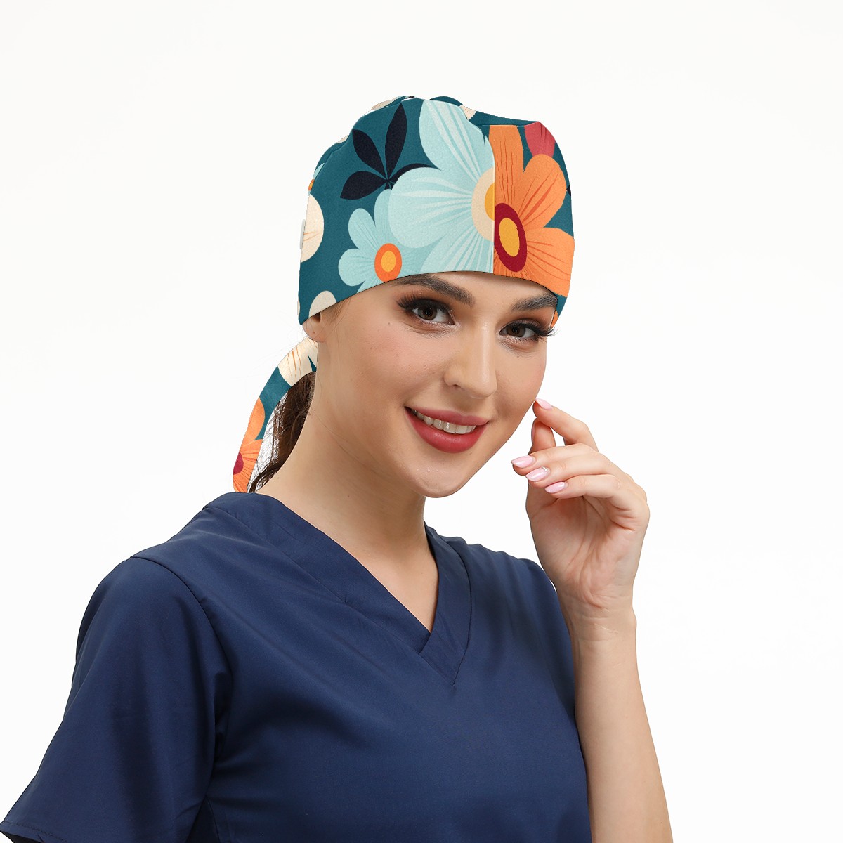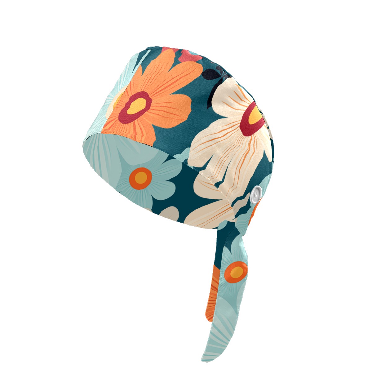 Working Caps with Button&Sweatband Satin Lined Cotton Adjustable Nurse Hats Elastic Band Scrub Cap Surgeon Hat Colorful Flowers