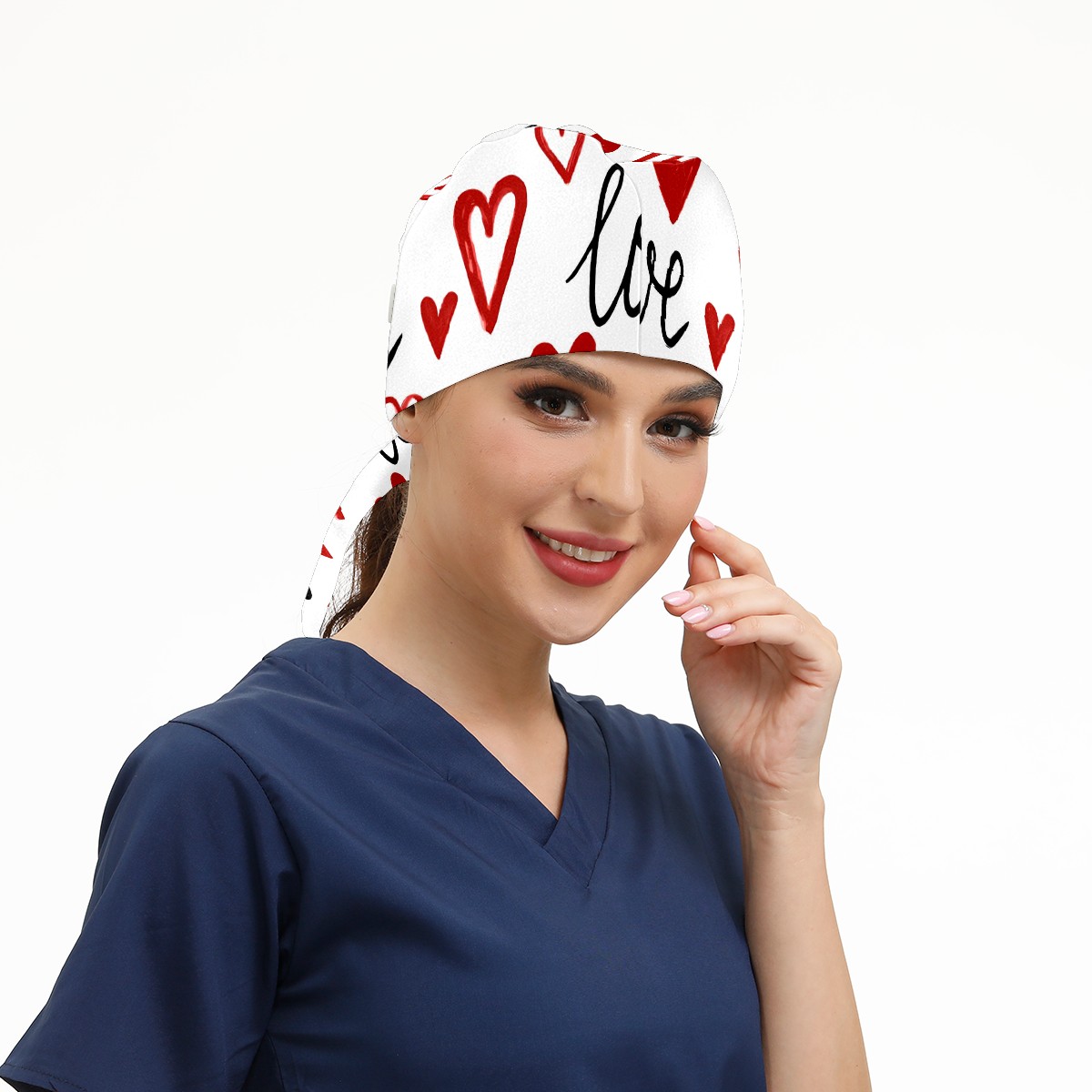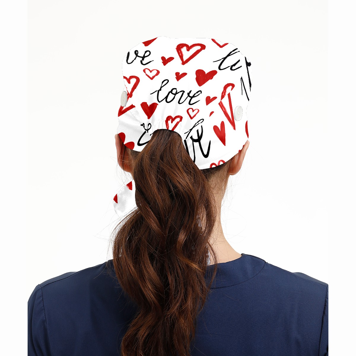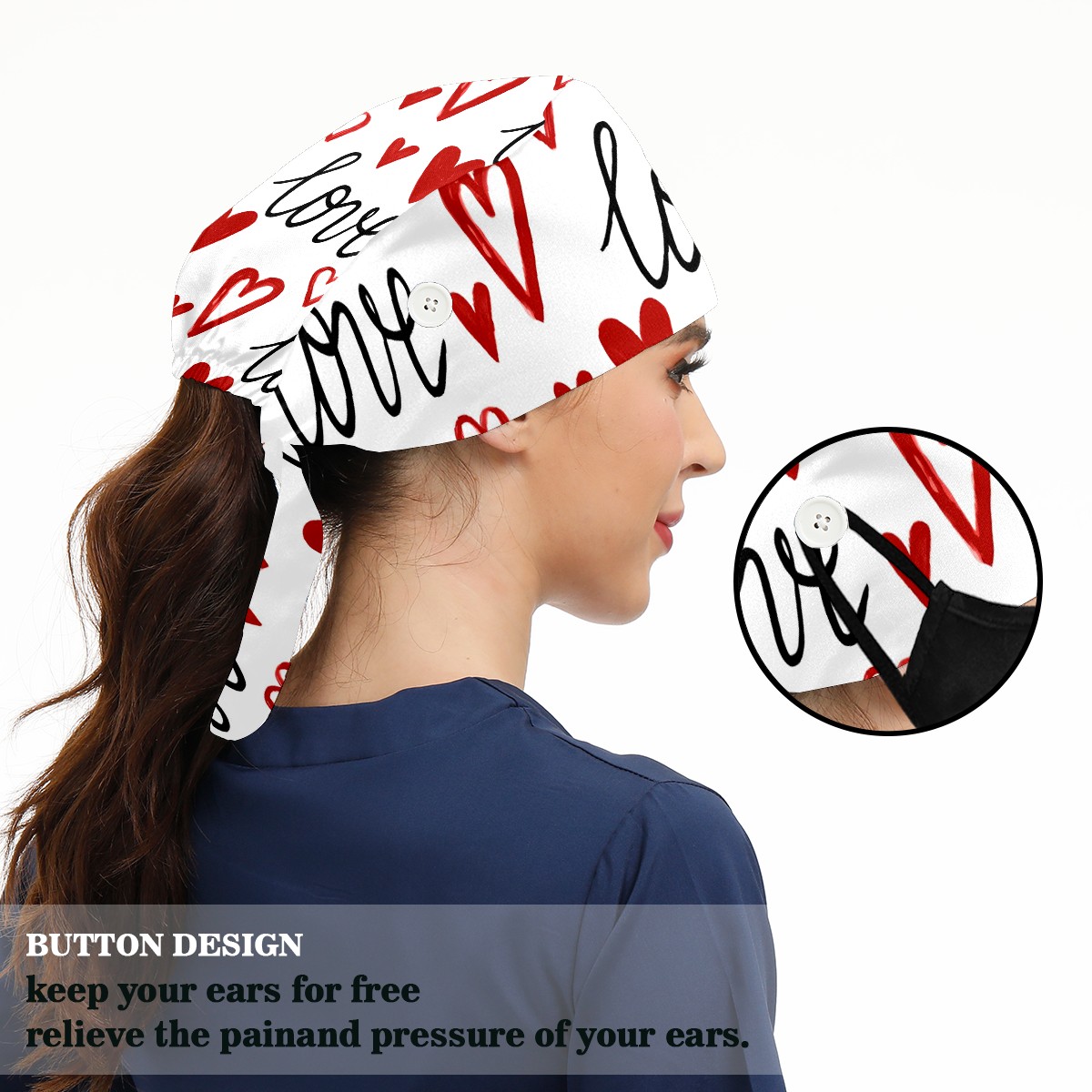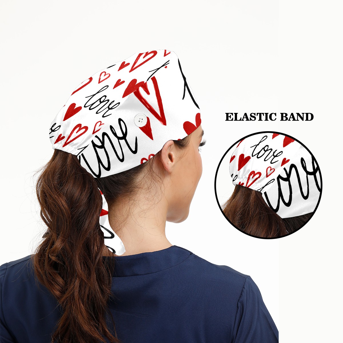 Working Caps with Button&Sweatband Satin Lined Cotton Adjustable Nurse Hats Elastic Band Scrub Cap Surgeon Hat Fashion Valentine's Day Heart (1)