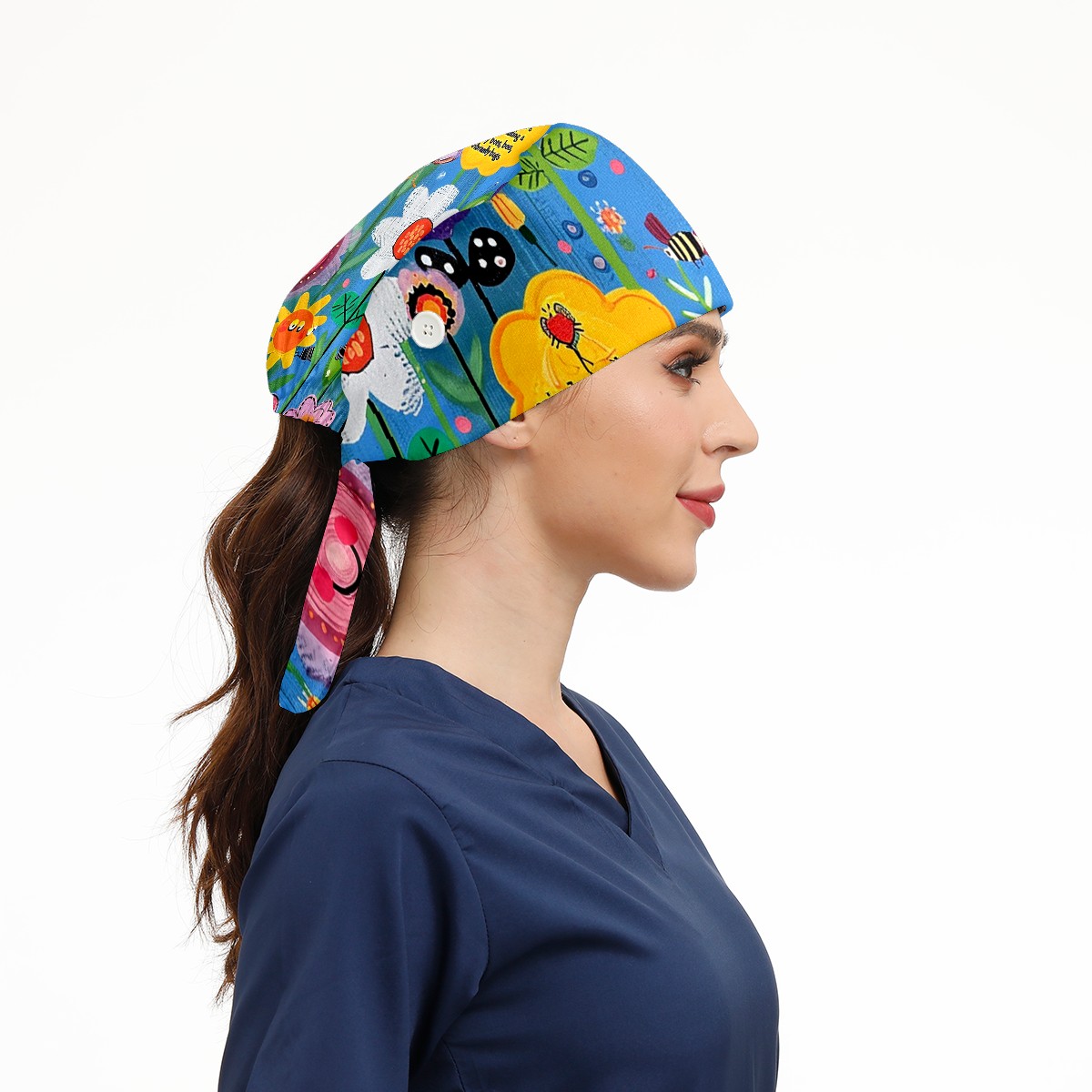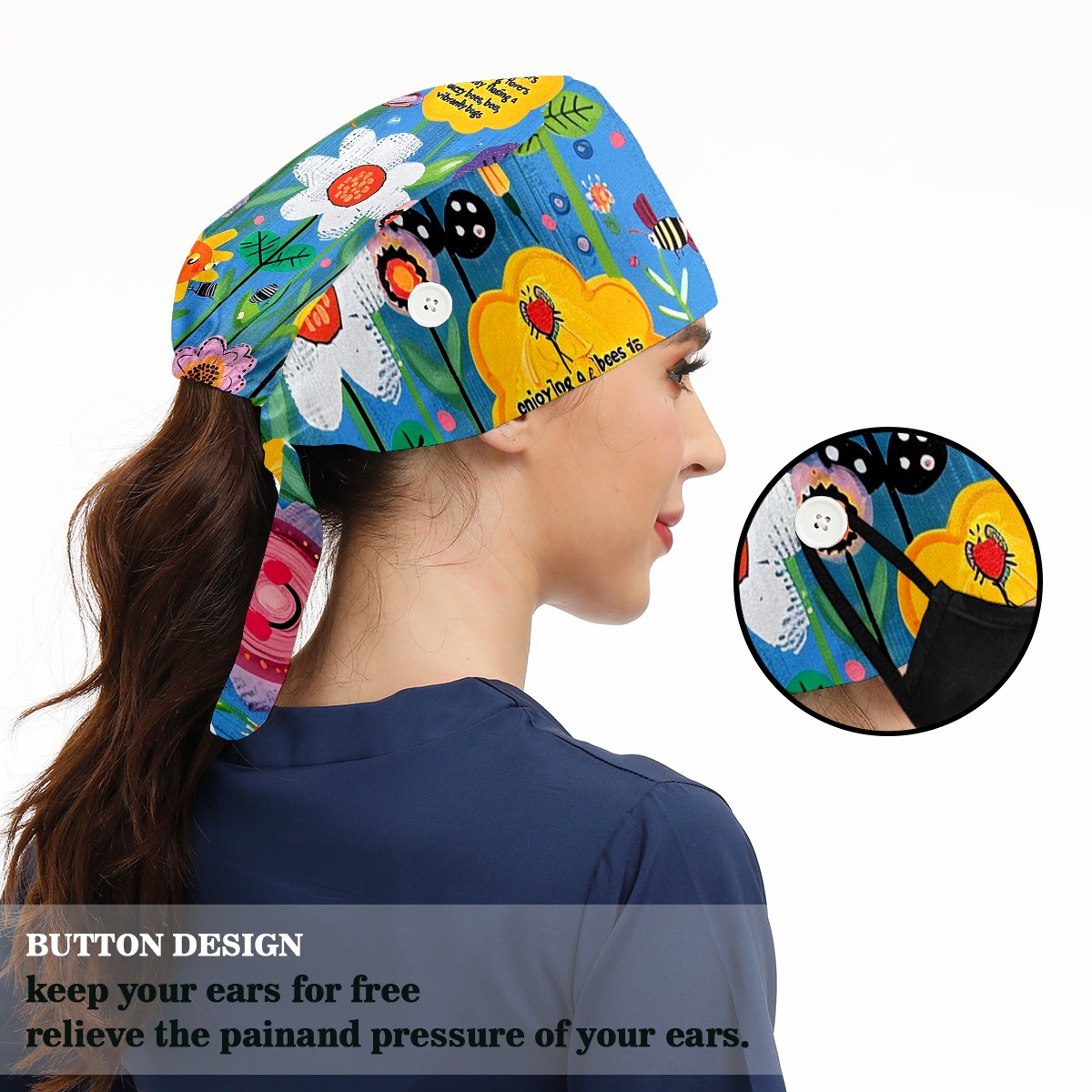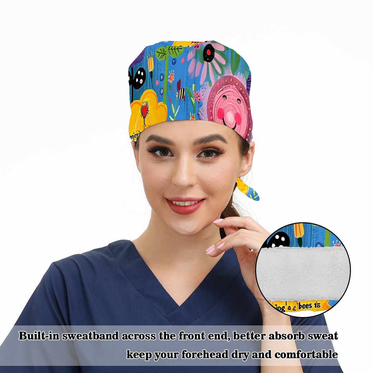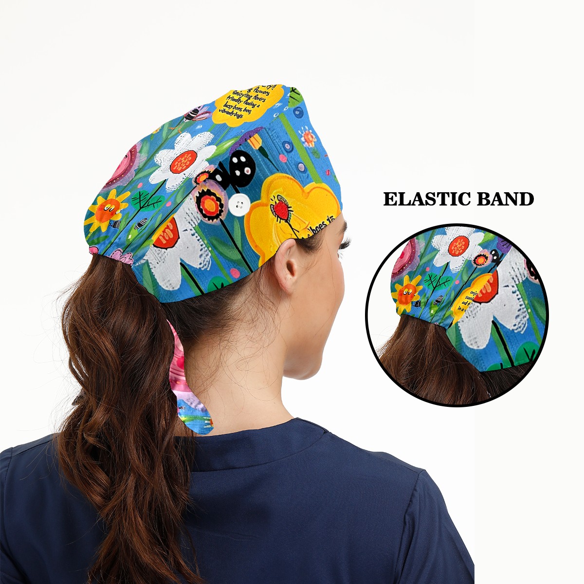 Working Caps with Button&Sweatband Satin Lined Cotton Adjustable Nurse Hats Elastic Band Scrub Cap Surgeon Hat Sunflower