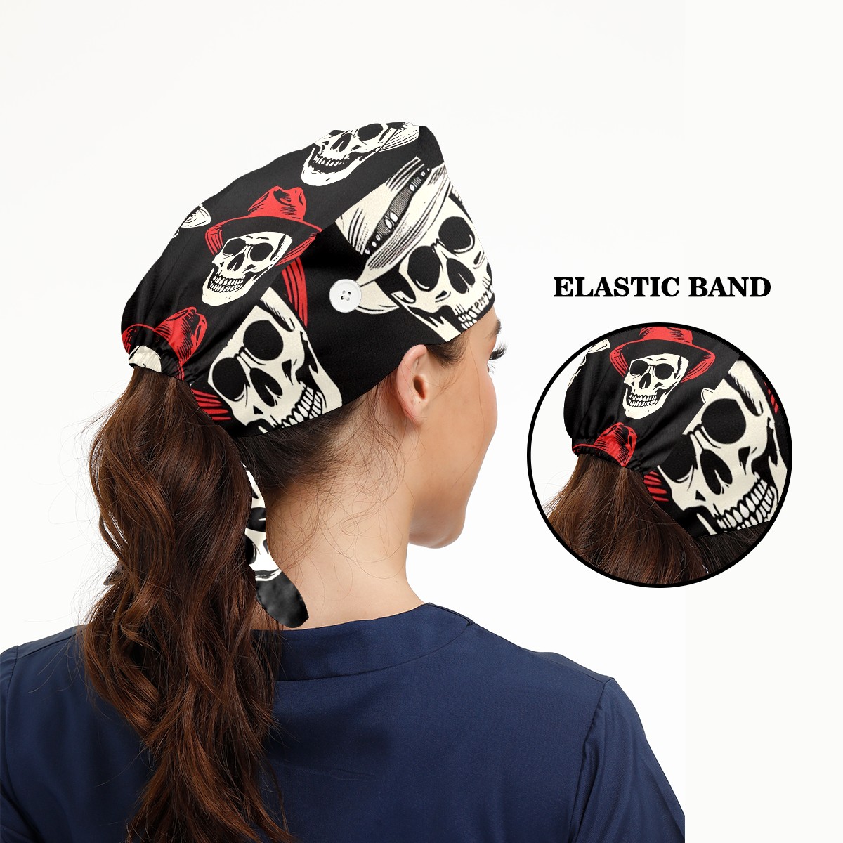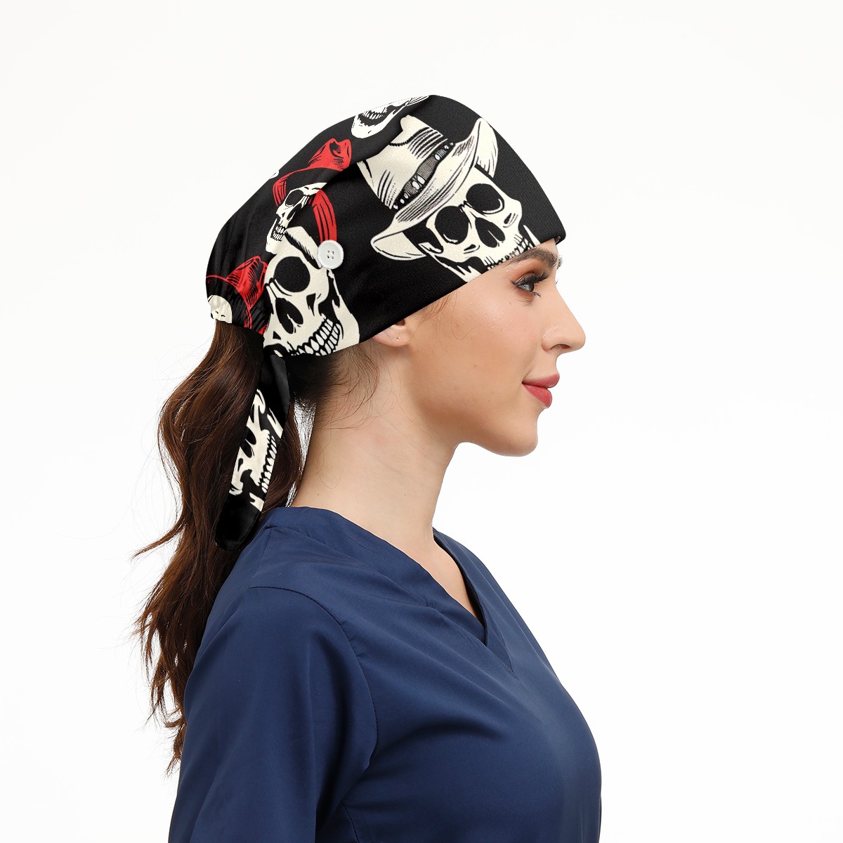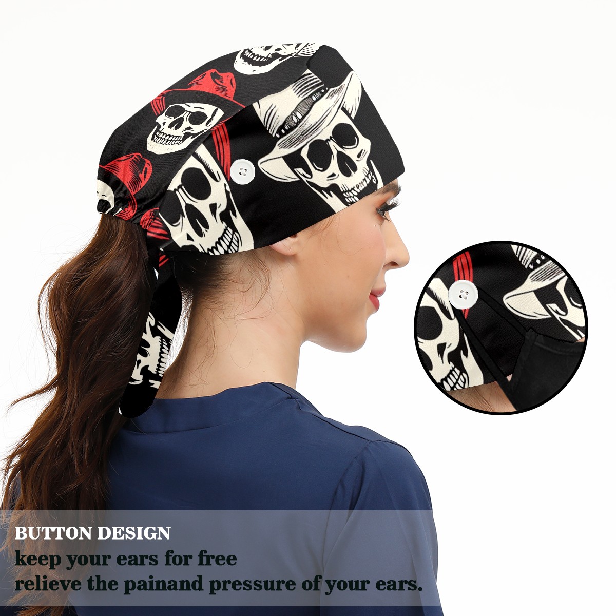 Working Caps with Button&Sweatband Satin Lined Cotton Adjustable Nurse Hats Elastic Band Scrub Cap Surgeon Hat Skull Head