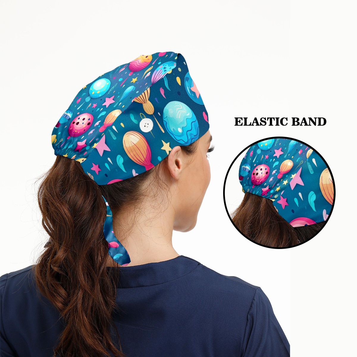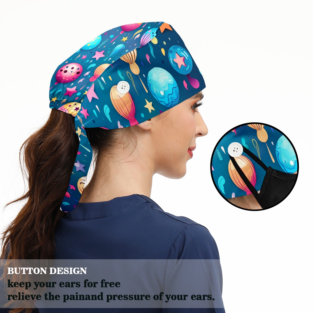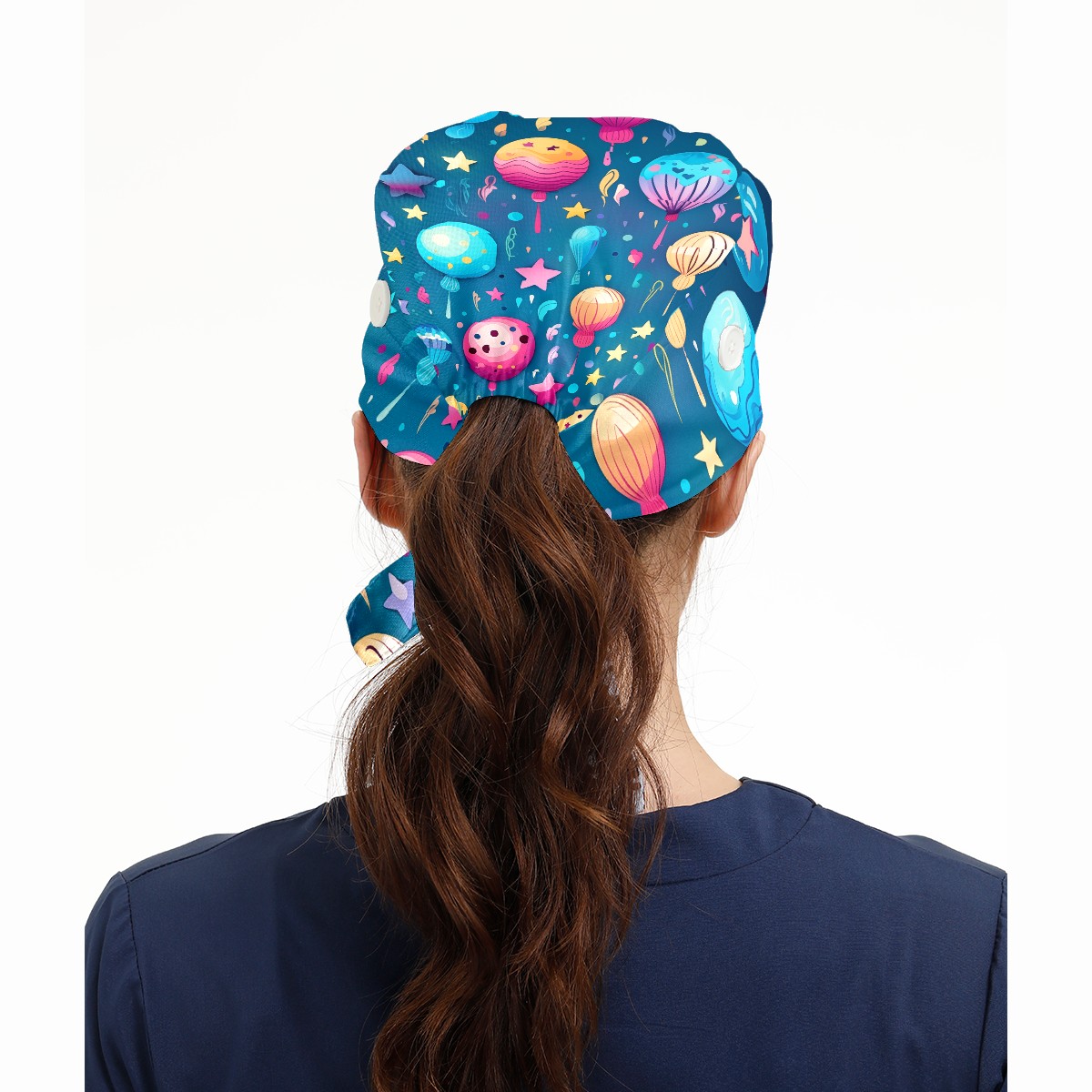 Working Caps with Button&Sweatband Satin Lined Cotton Adjustable Nurse Hats Elastic Band Scrub Cap Surgeon Hat Funny Balloons