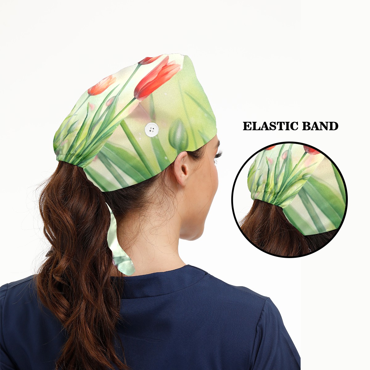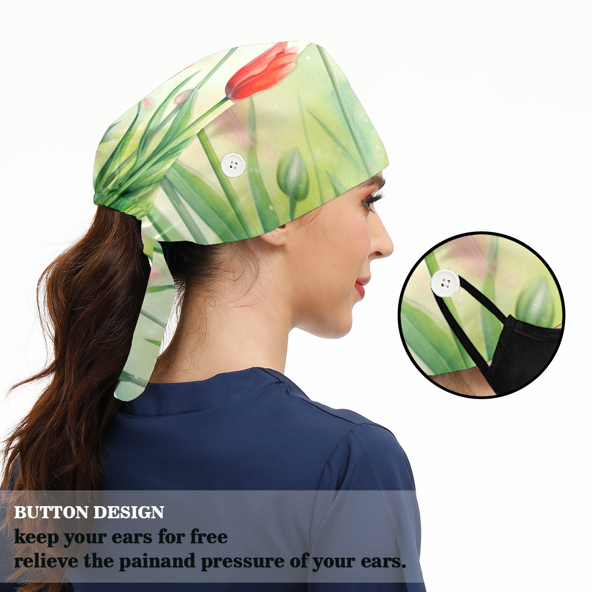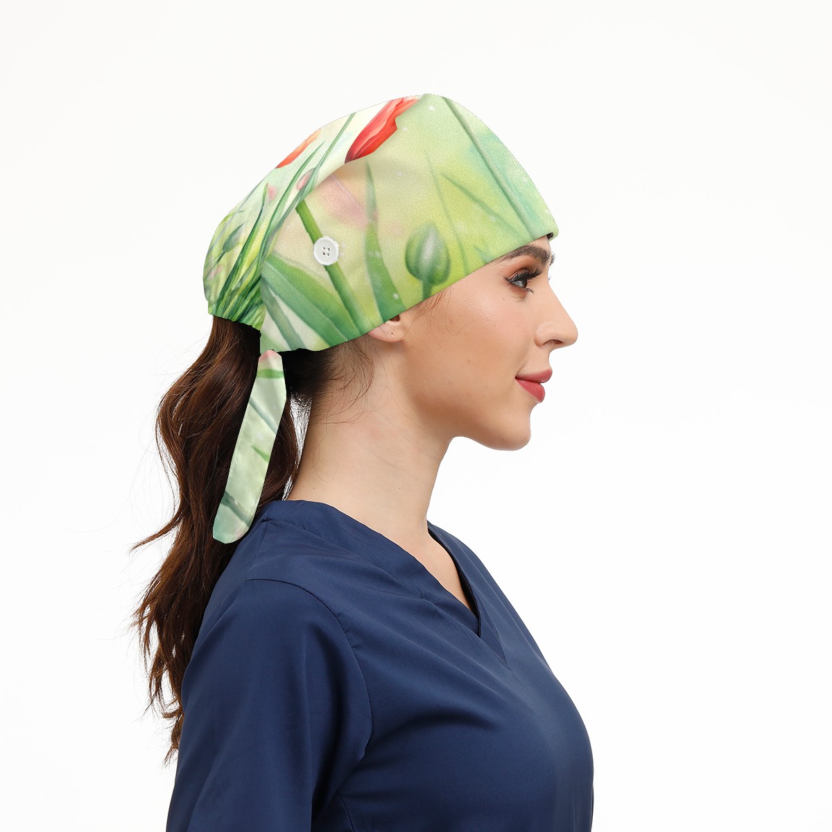 Working Caps with Button&Sweatband Satin Lined Cotton Adjustable Nurse Hats Elastic Band Scrub Cap Surgeon Hat Spring Flowers (2)
