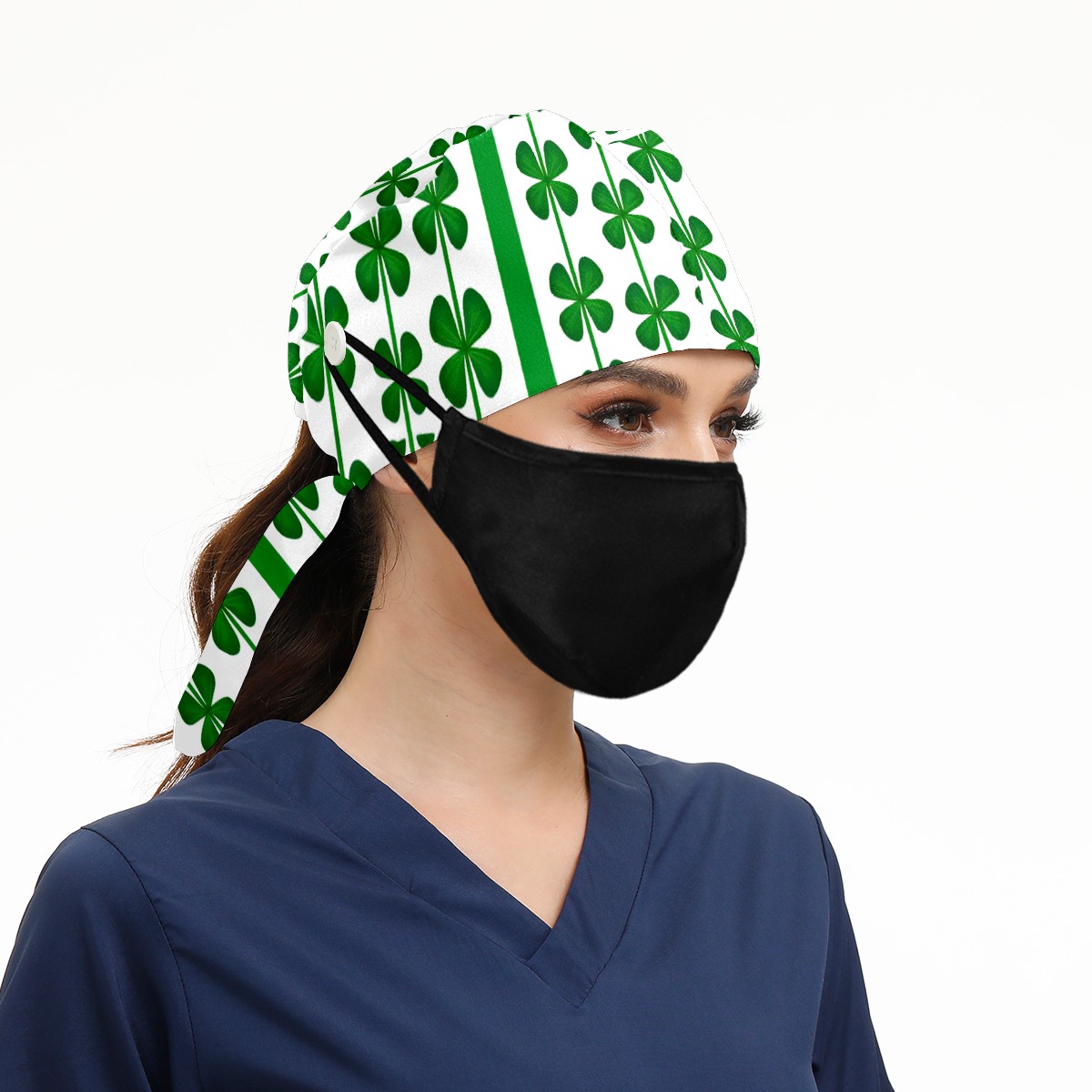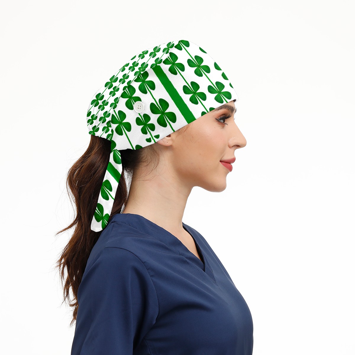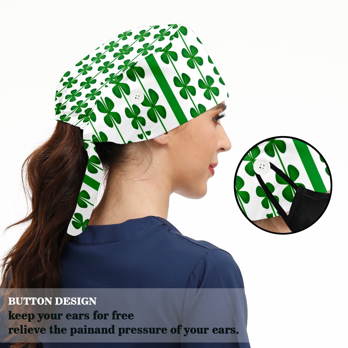 Working Caps with Button&Sweatband Satin Lined Cotton Adjustable Nurse Hats Elastic Band Scrub Cap Surgeon Hat Green Shamrock Leaf Pattern (1)