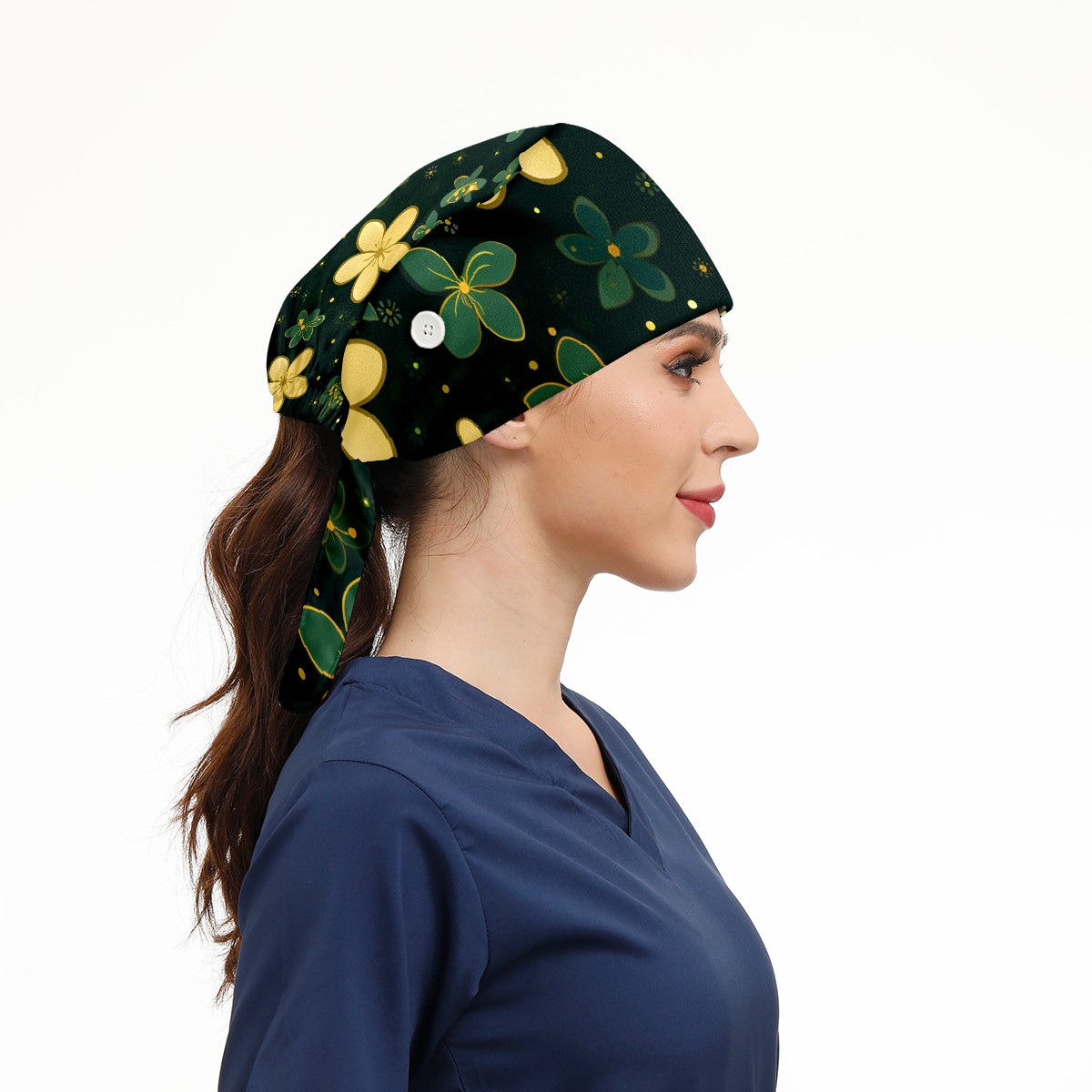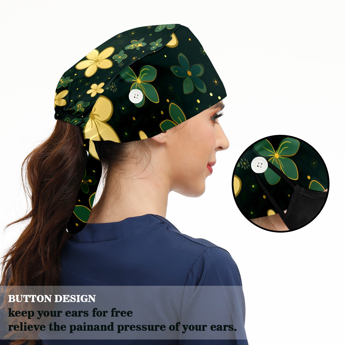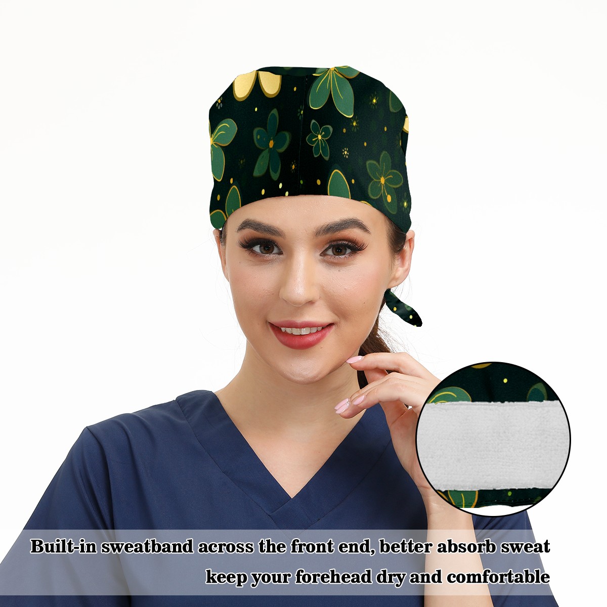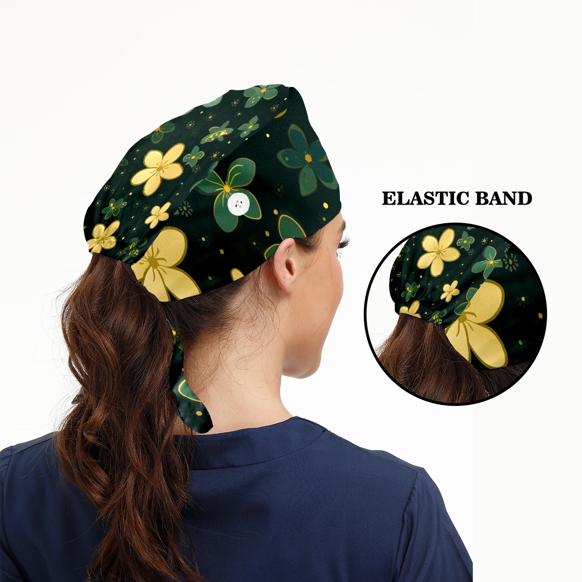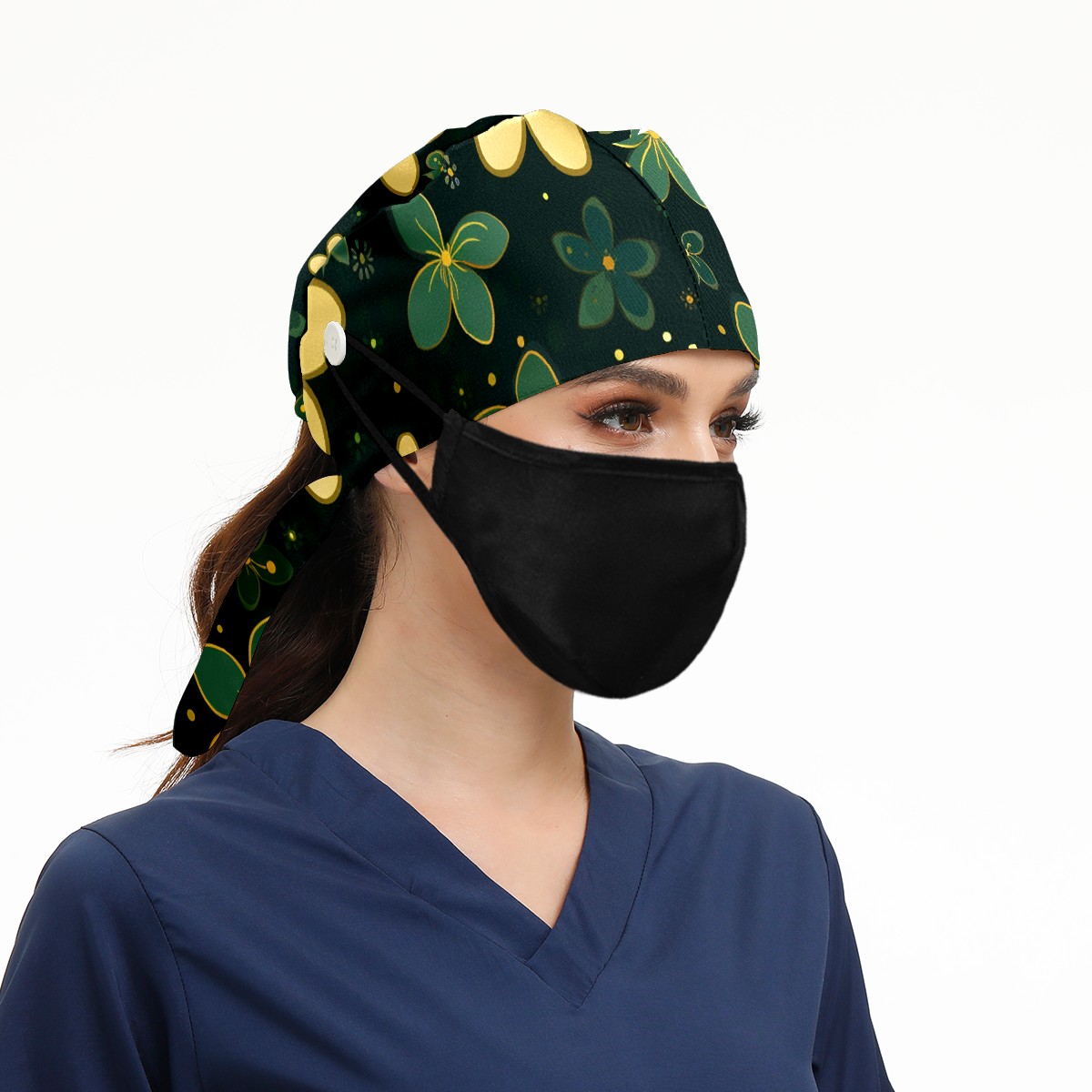 Working Caps with Button&Sweatband Satin Lined Cotton Adjustable Nurse Hats Elastic Band Scrub Cap Surgeon Hat Gold Flowers (5)